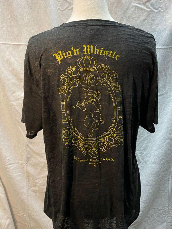 Pig'n Whistle, a Hollywood, CA landmark restaurant logo tshirt. Black shirt has a worn vintage look to the material. Logo on chest and full back logo are in yellow. Good condition. Size XL.