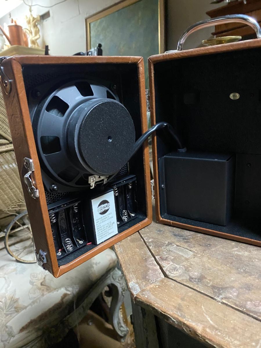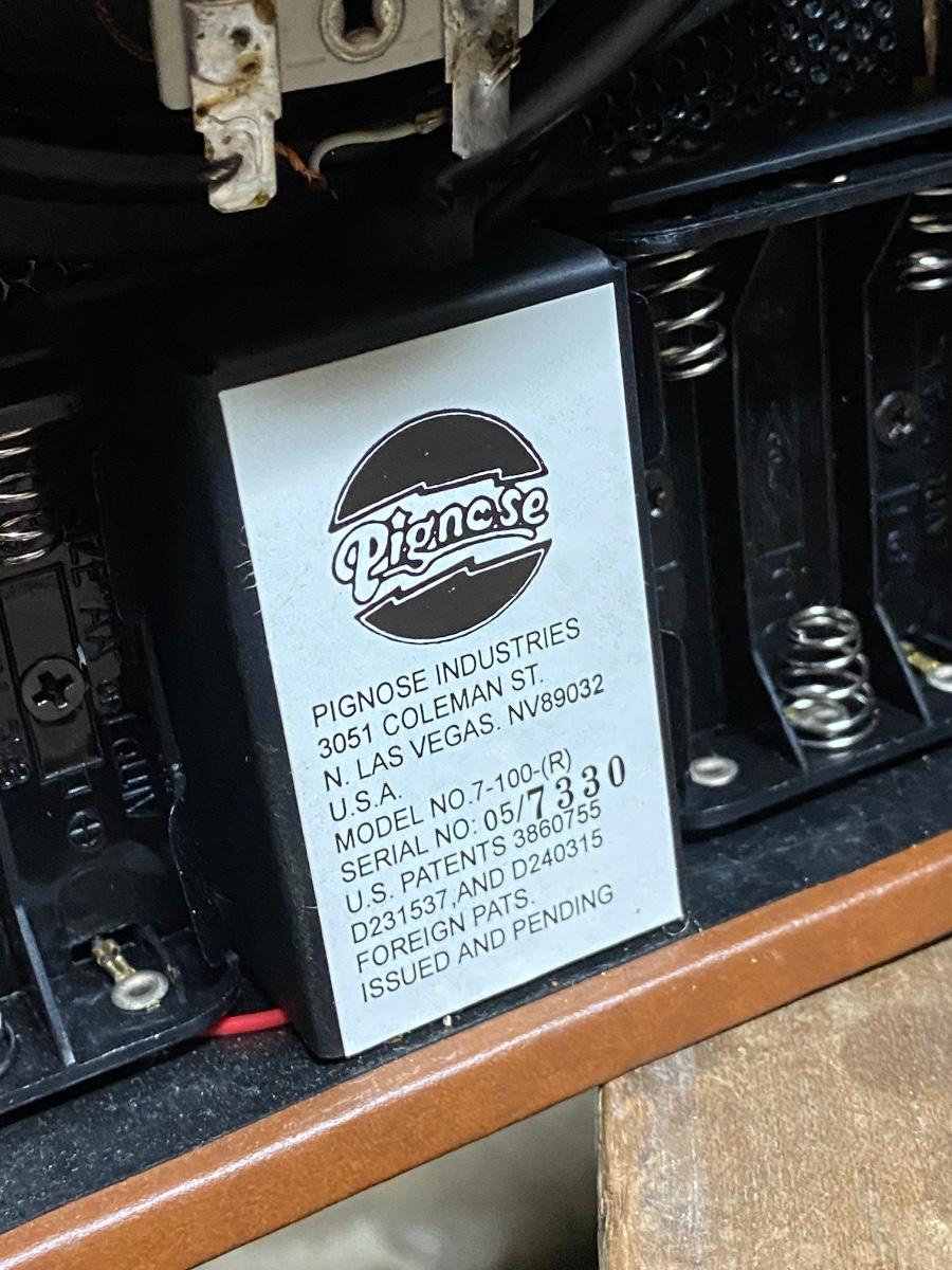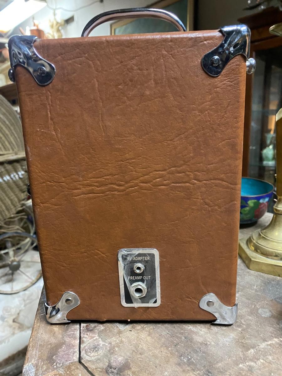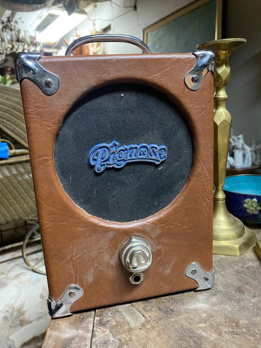 Pignose Mini Amp for Electric Guitar. No adaptor. Opens up from 6 1/4" to 12" across. 9" high. Has handle and snaps closed.