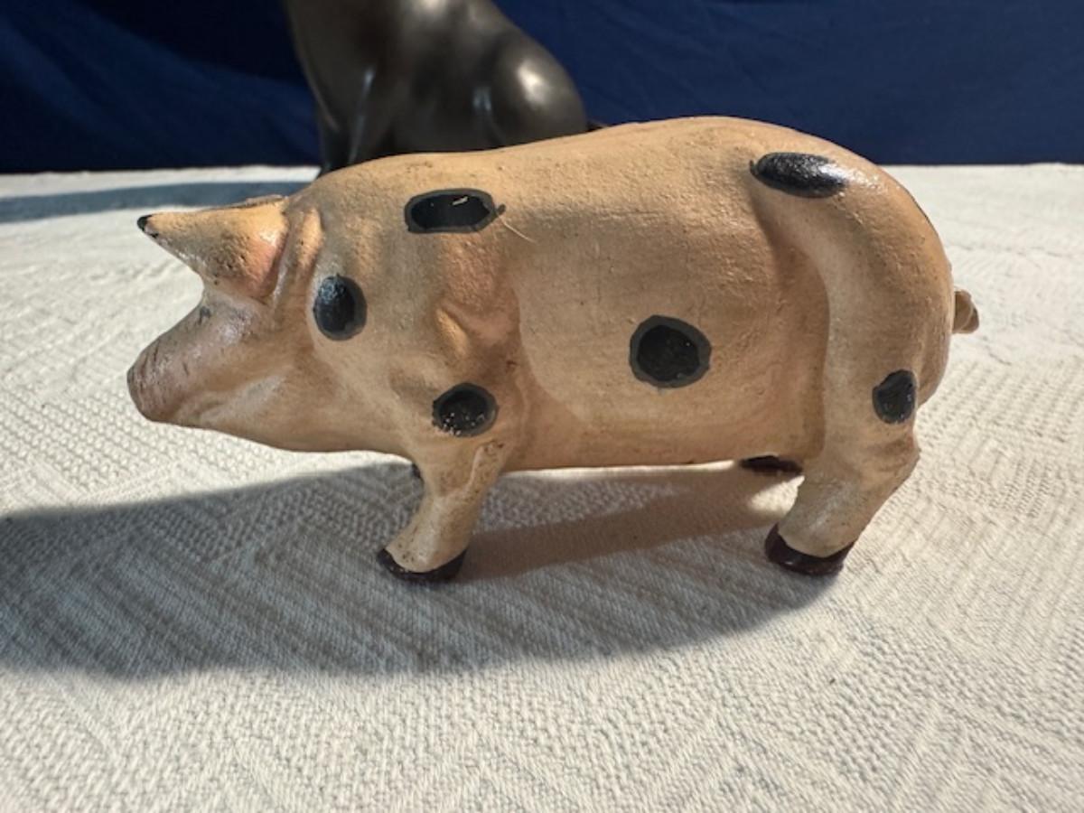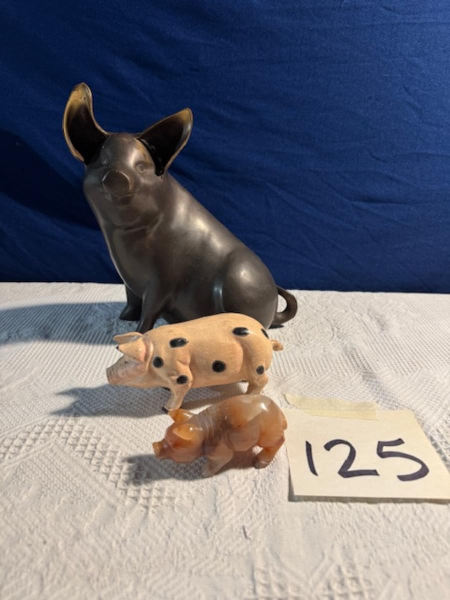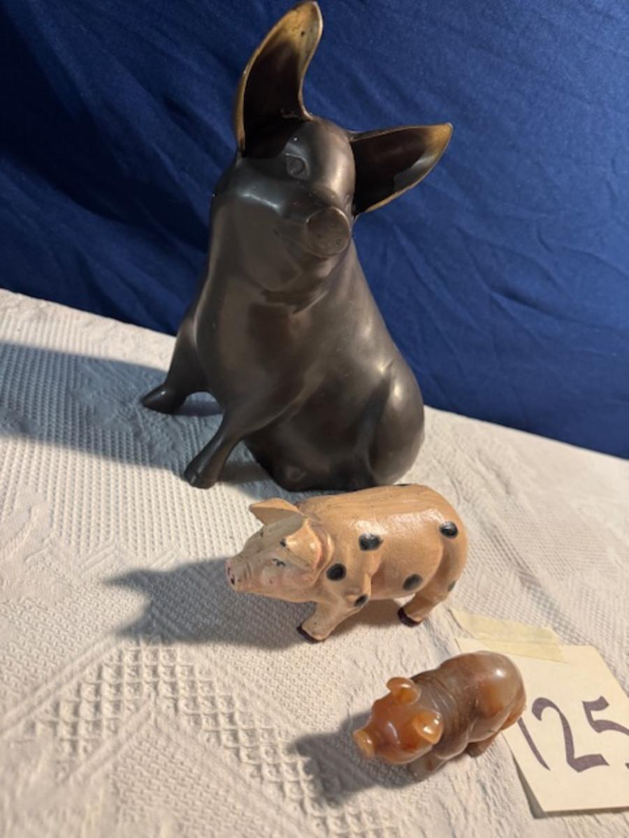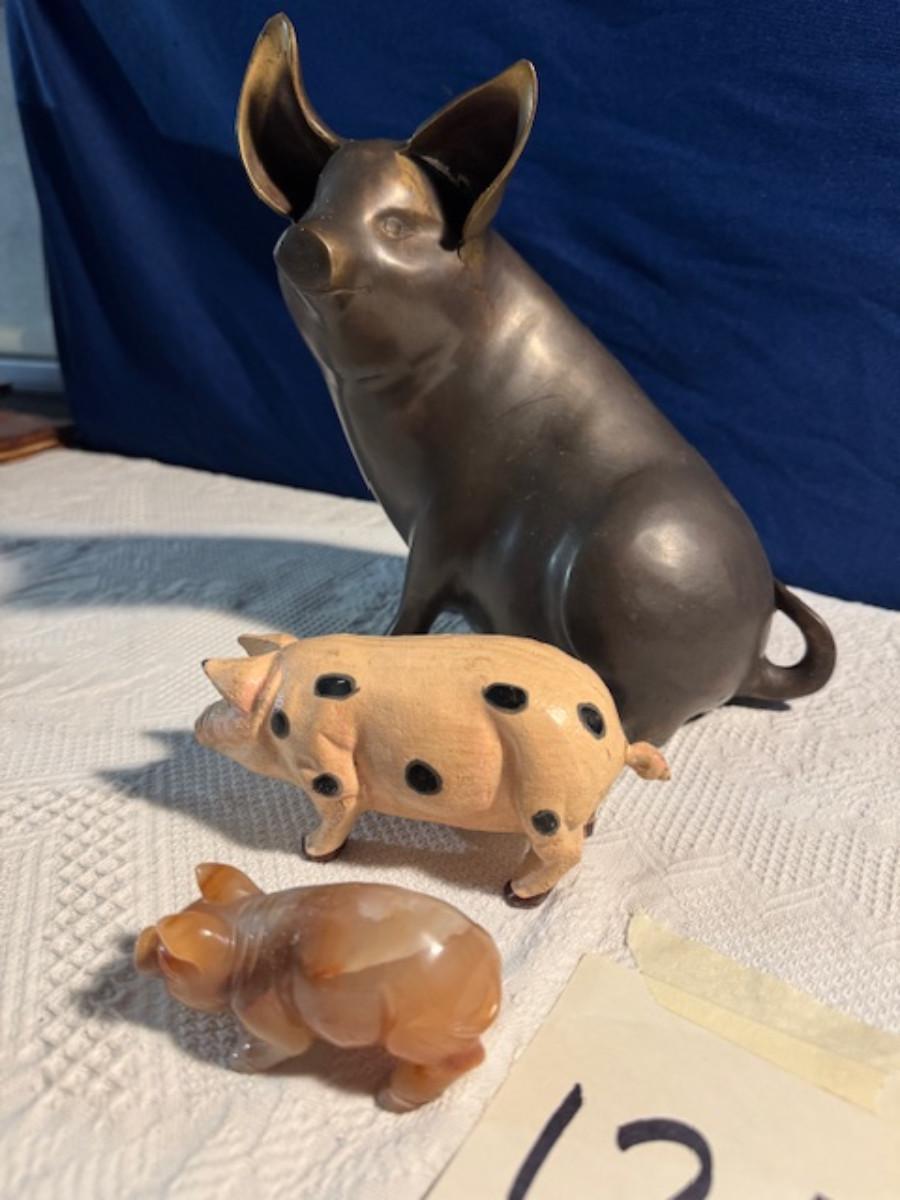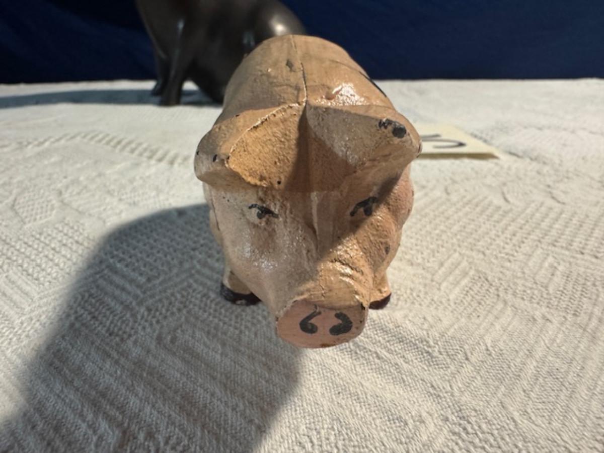 Bronze pig 9 1/4" x 8" x 4.5", cast iron pig 3", Stone Pig 1 3/4"