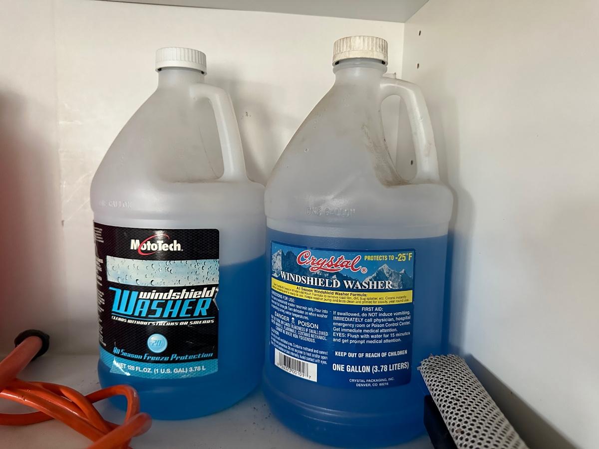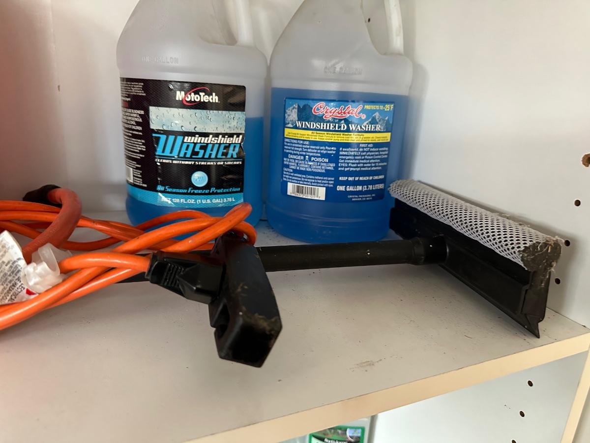 2 PARTIAL CONTAINERS OF WINDSHIELD WASHER FLUID, WINDOW SQUEEGEE
