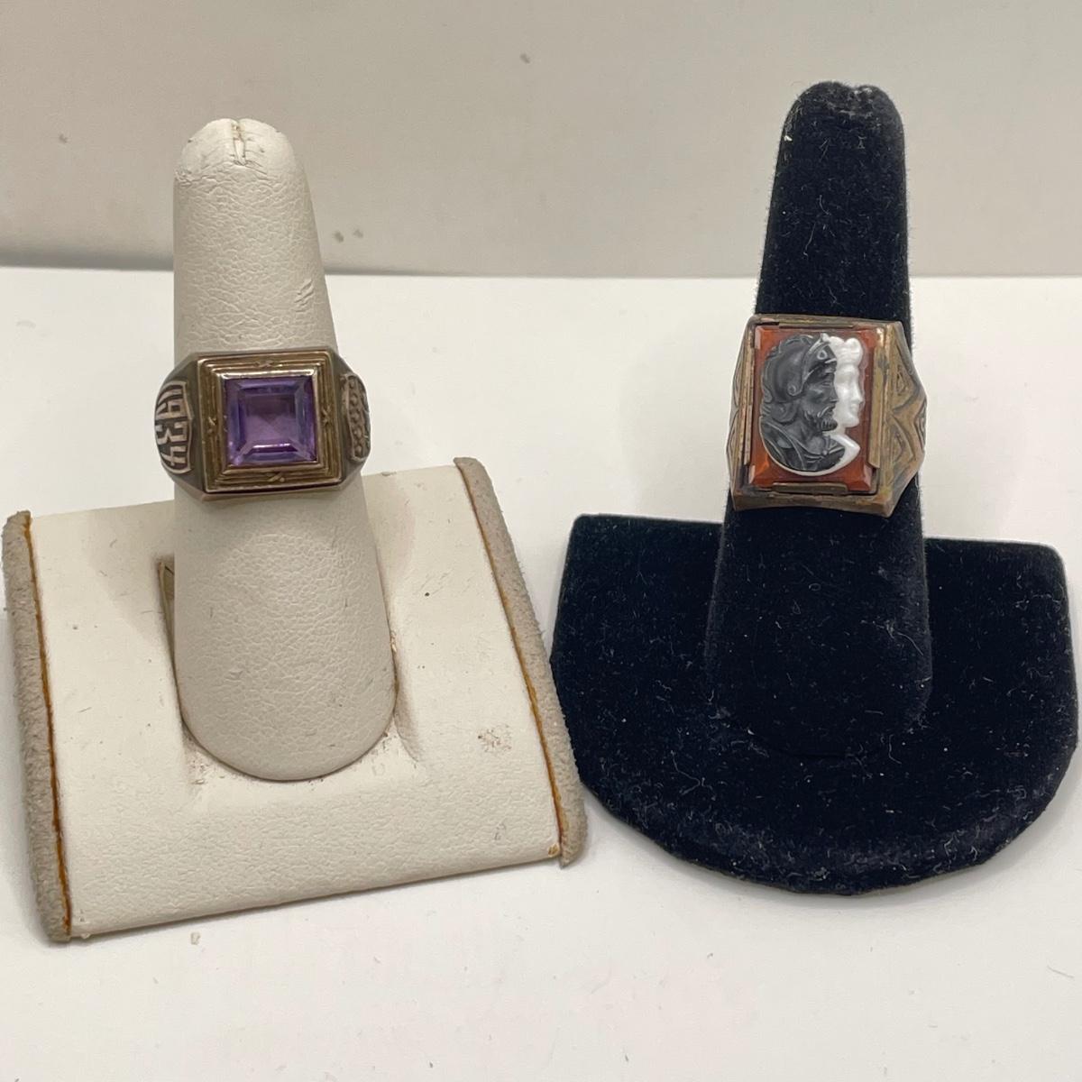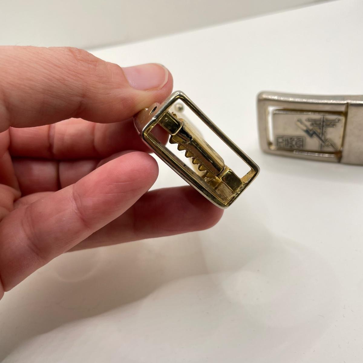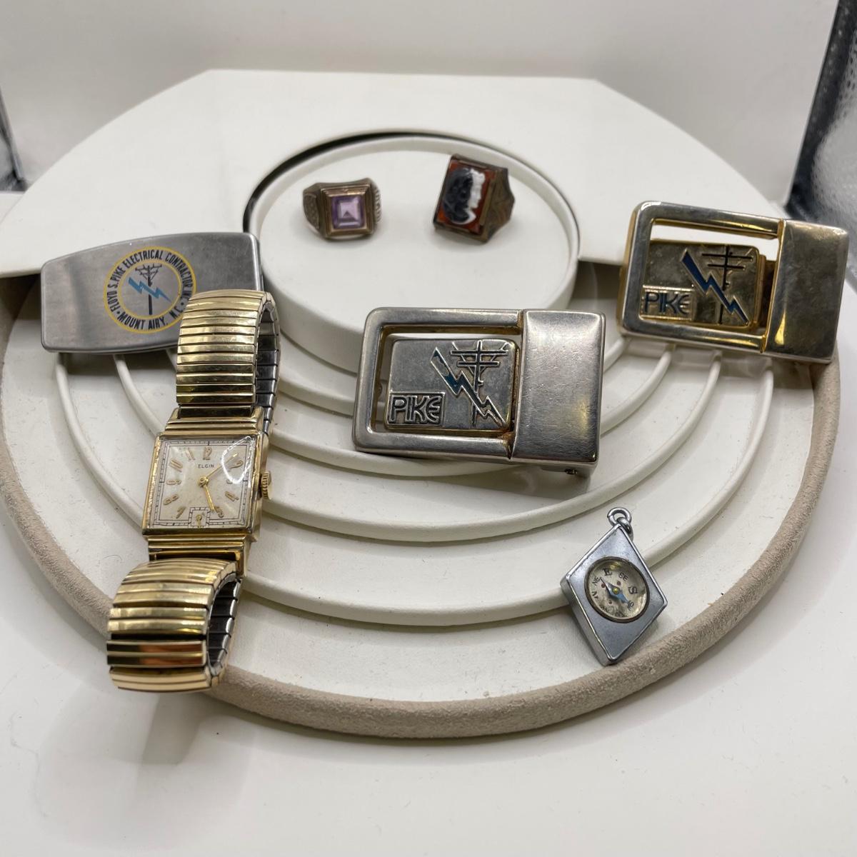 A nice collection of belt buckles, money clip, rings, a watch and compass. The 1934 ring is very heavy, while the Romanesque cameo ring is a much lighter metal. Lot features three Pikes fashions- two belt buckles and a money clip-pocket knife combo marked Zippo. The Elgin watch is marked gold-filled with 12-25-‘40 etched on it, it is currently not working. Lastly a small diamond shaped compass and a vintage Paul Revere Life Insurance token. See images. All sales are final. No returns or refunds. Please bid accordingly.