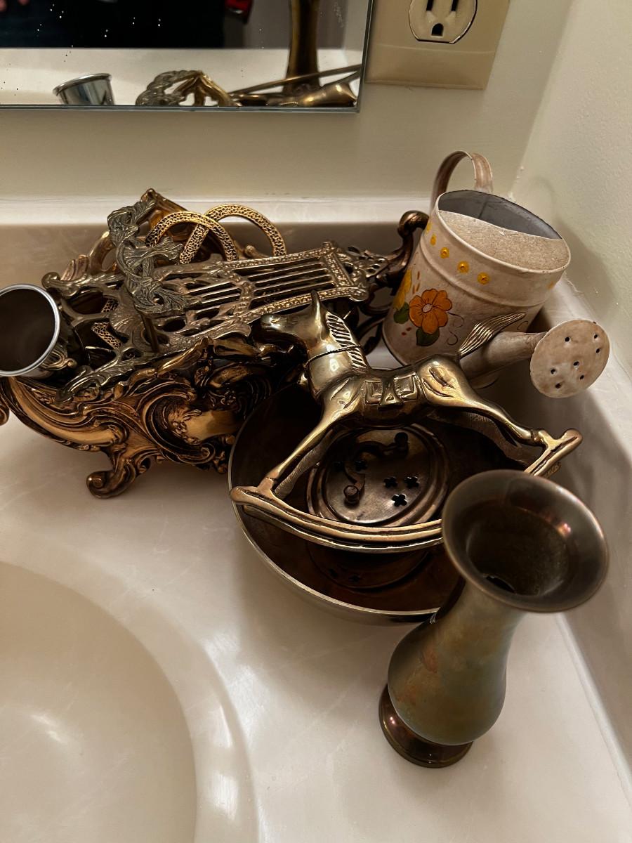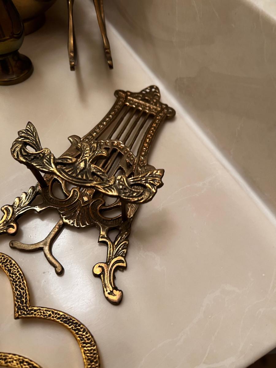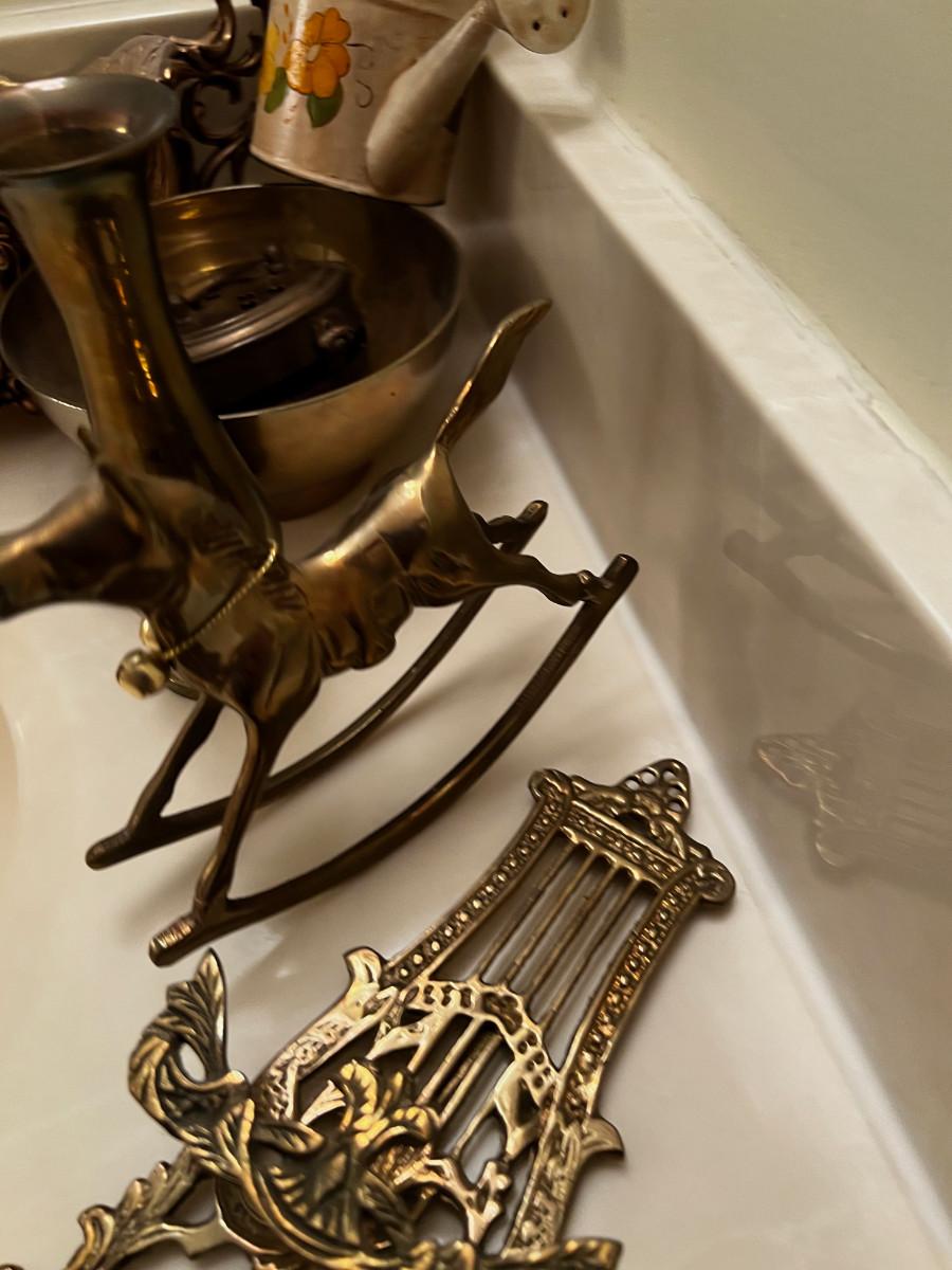 Pile of Brass; Planter, Easel, Rocking Horse, Trivet