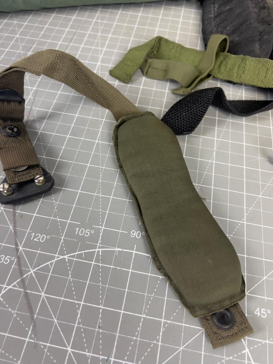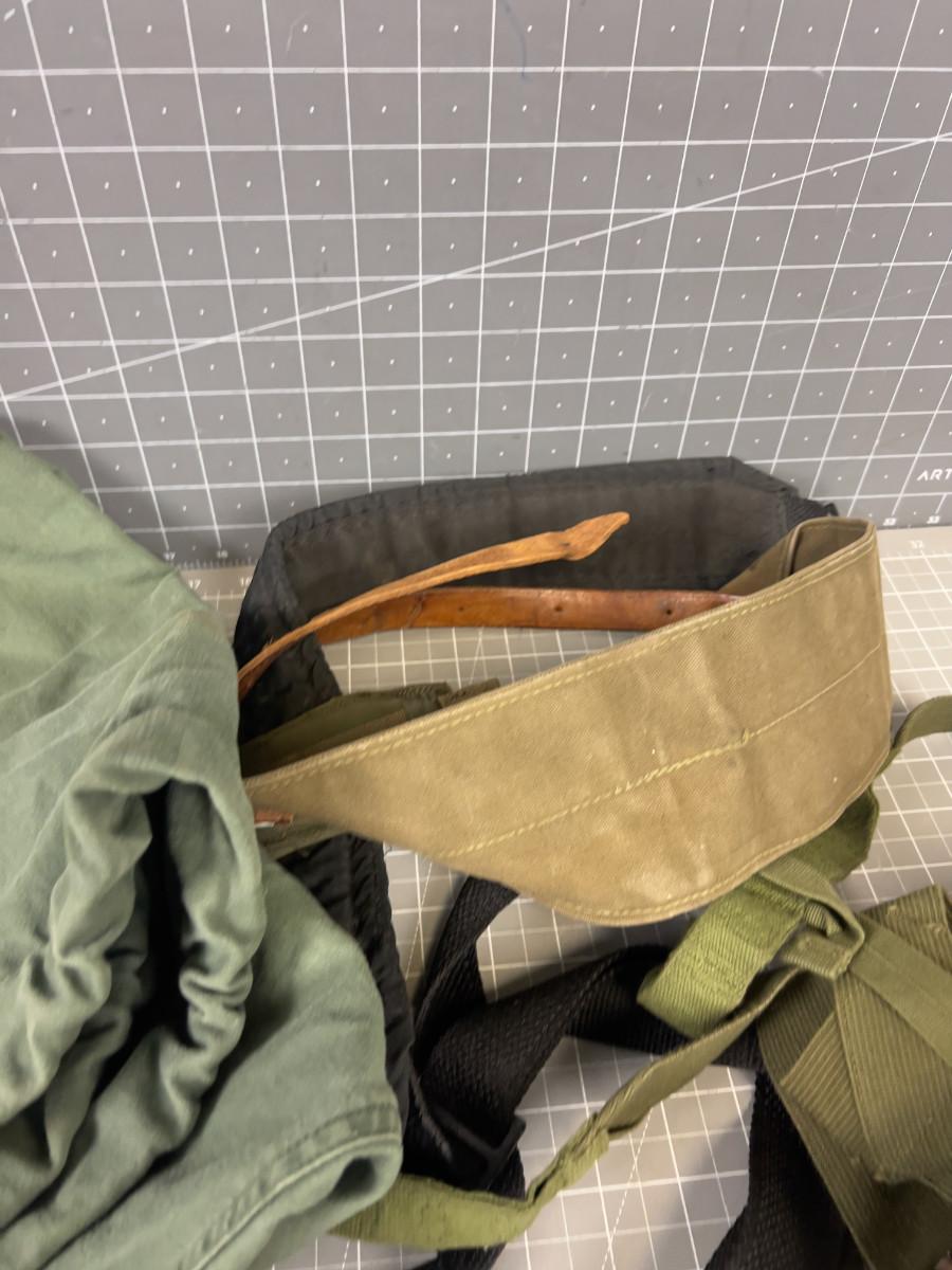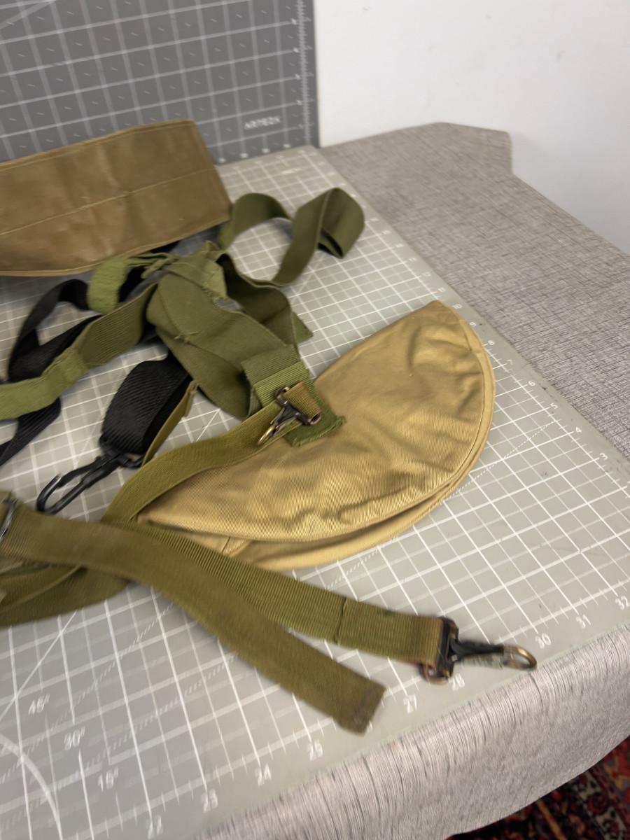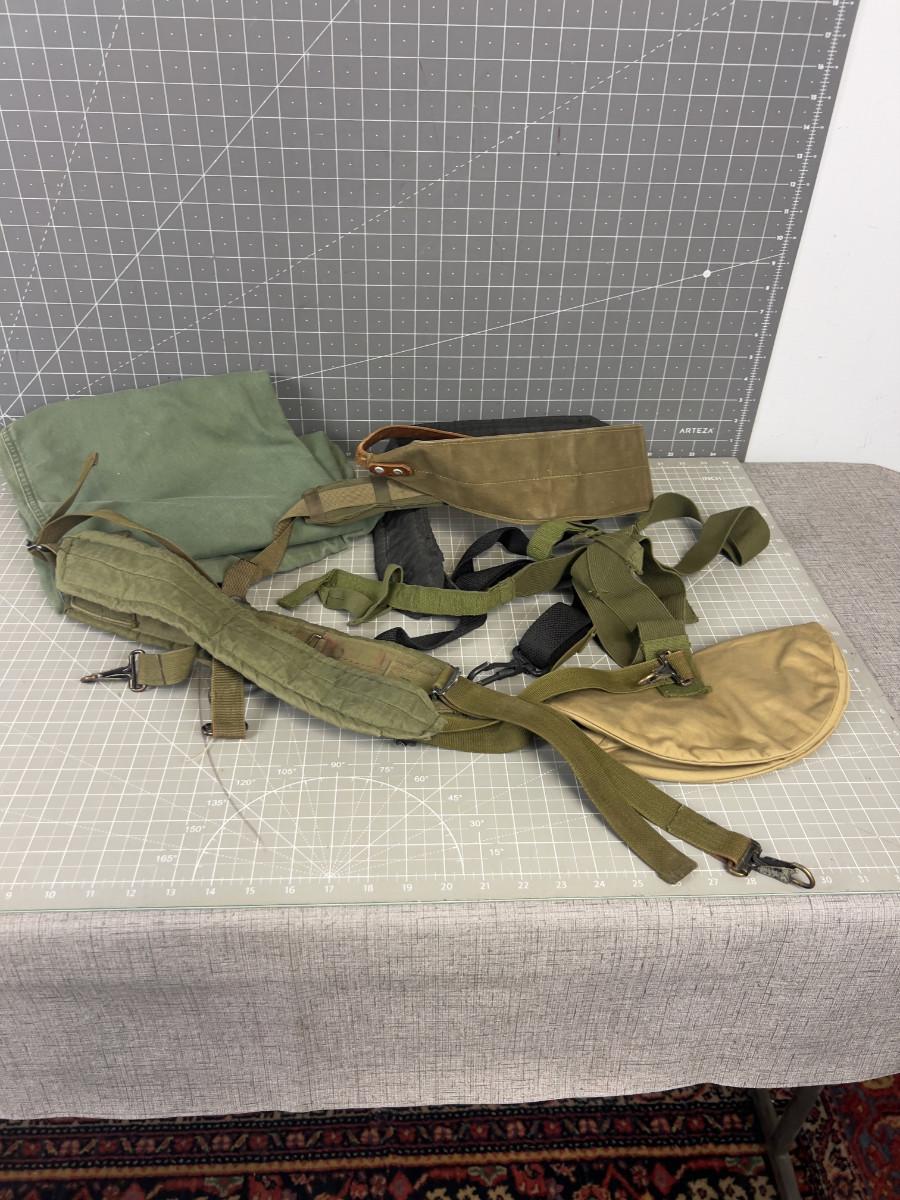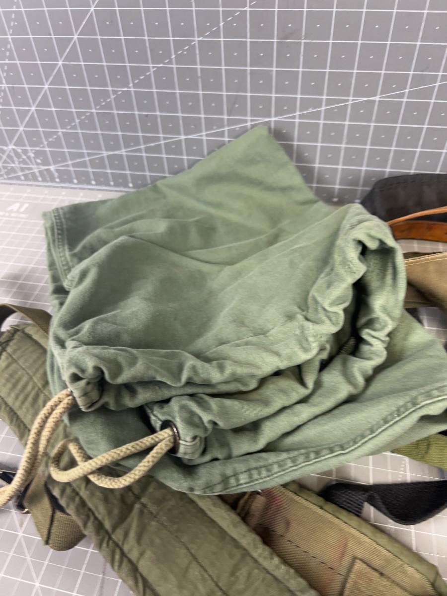 Pile of Misc. Army Gear; Suspenders & Duffel Bag