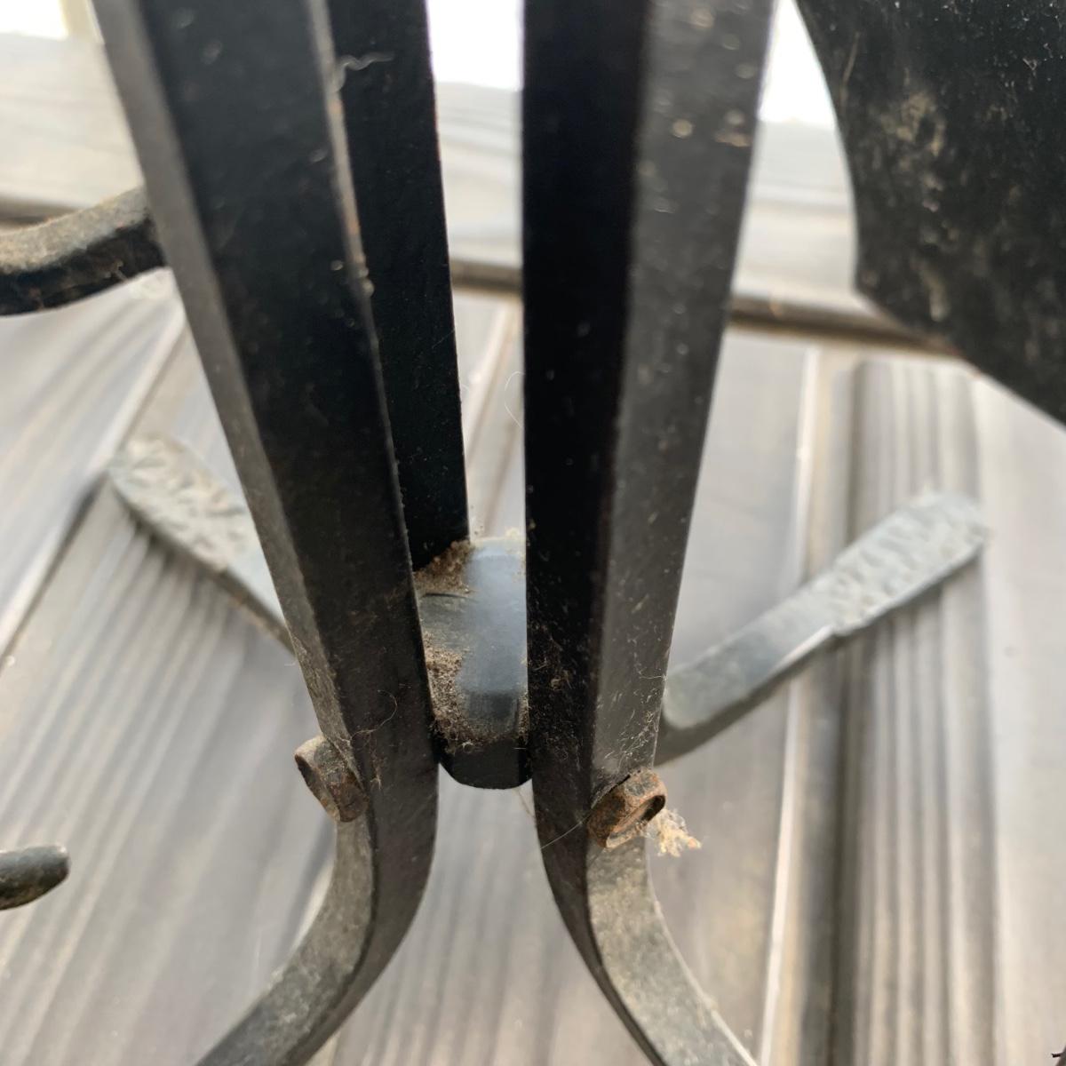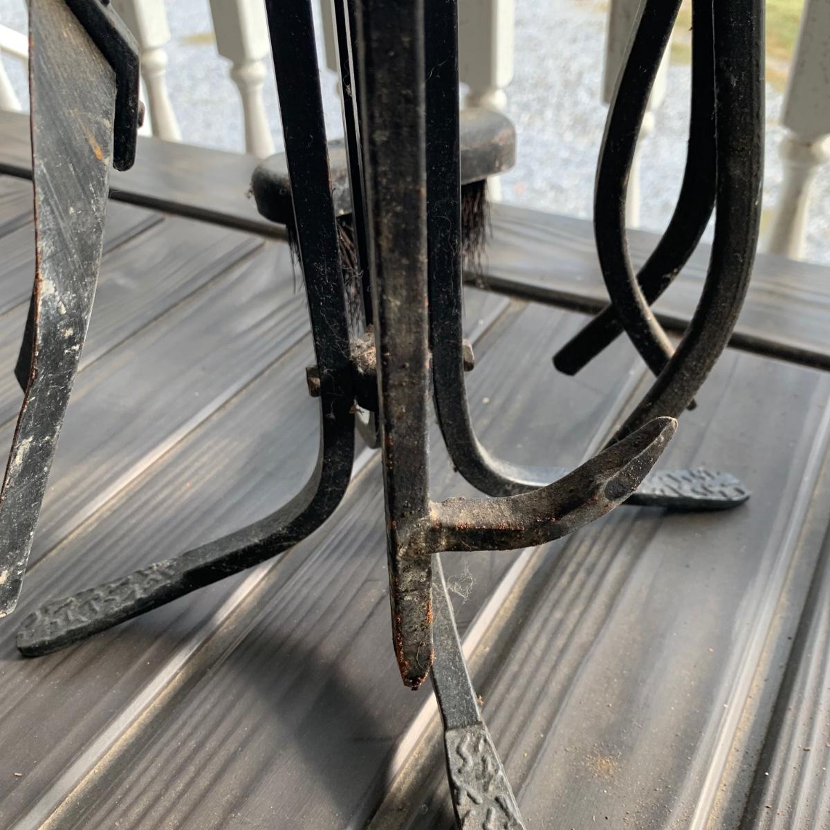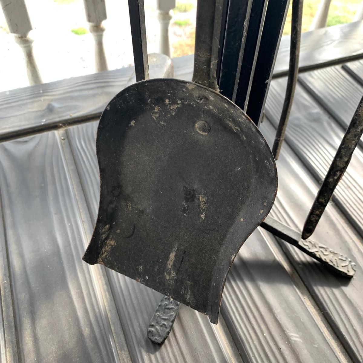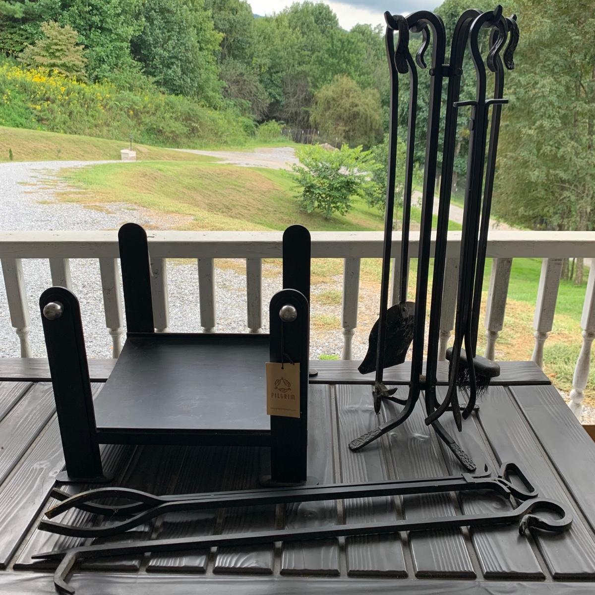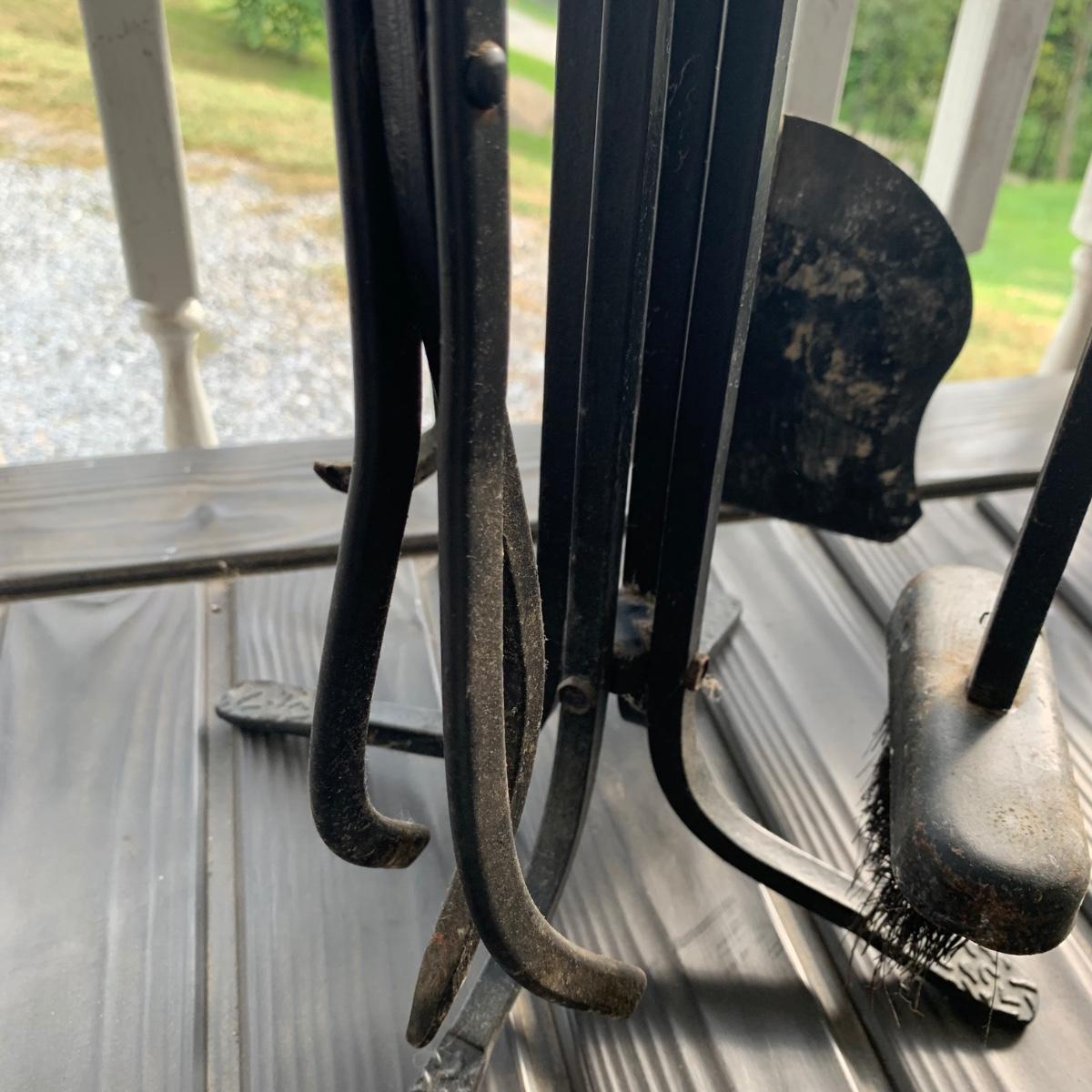 Iron log holder from Pilgrim Hearth measures 16.75” x 15.25” x 13”H. It is very sturdy, but dusty from use and has some scratches. Also included is a set of andirons plus two extra tools.