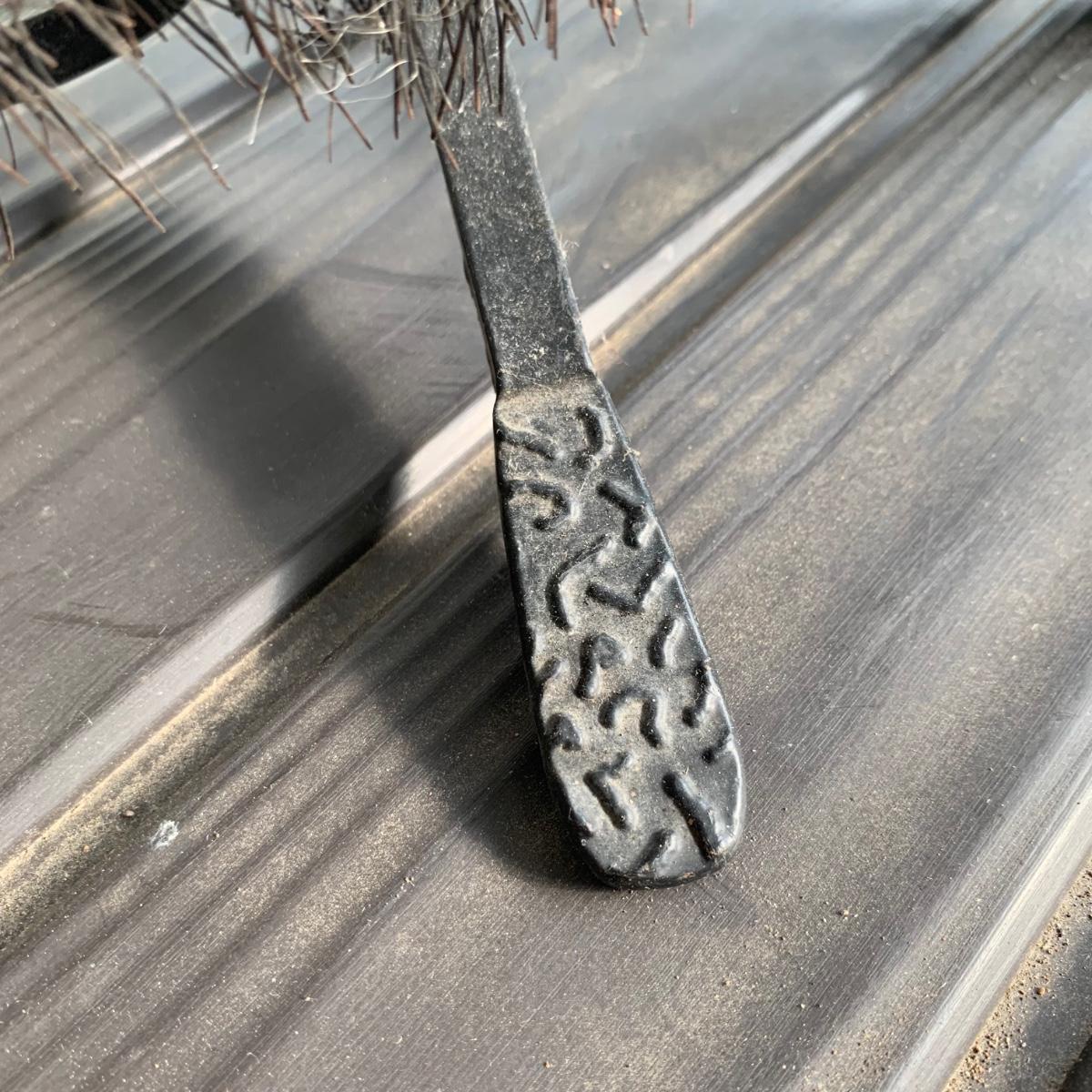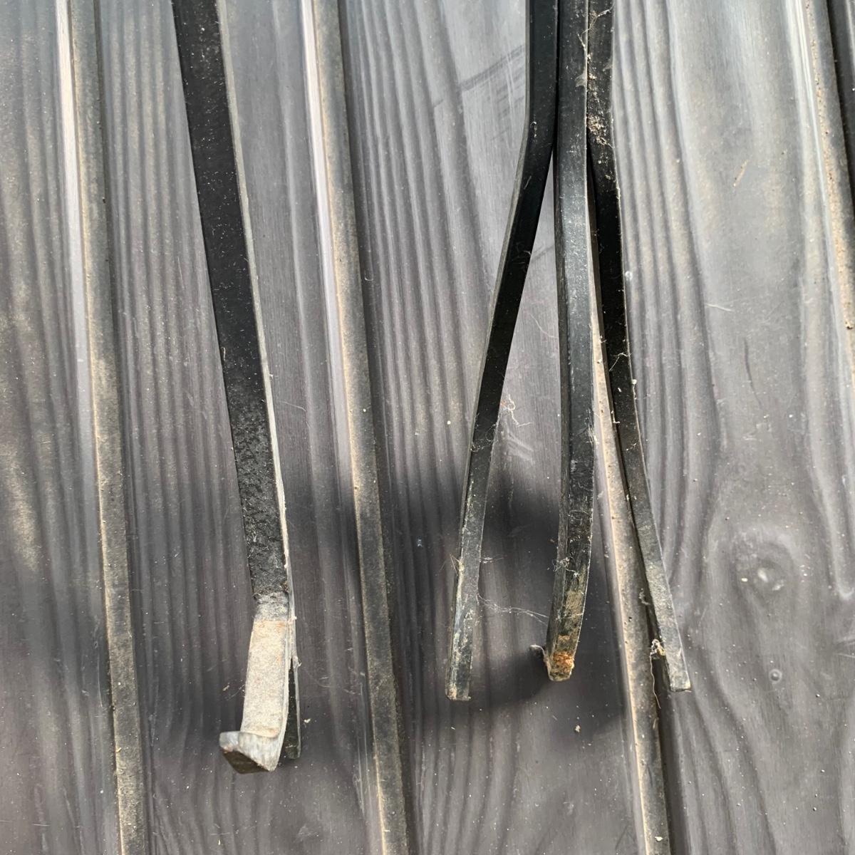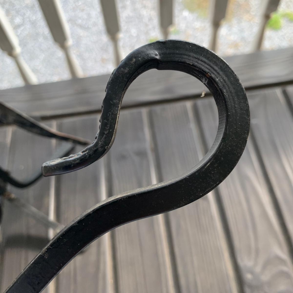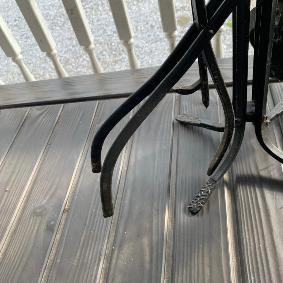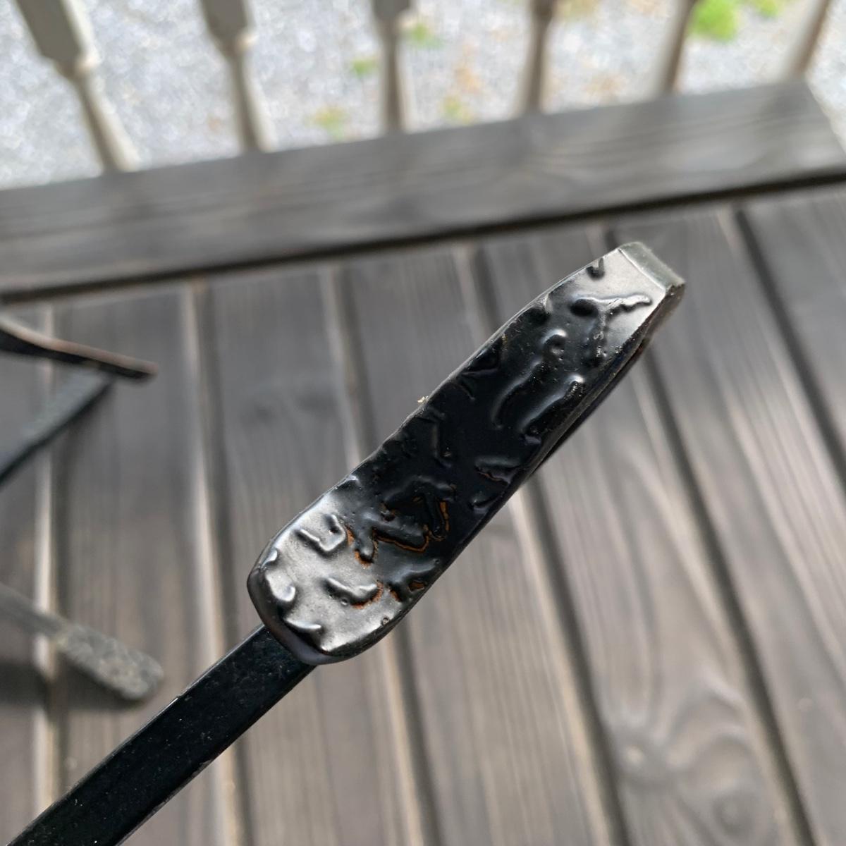 Iron log holder from Pilgrim Hearth measures 16.75” x 15.25” x 13”H. It is very sturdy, but dusty from use and has some scratches. Also included is a set of andirons plus two extra tools.