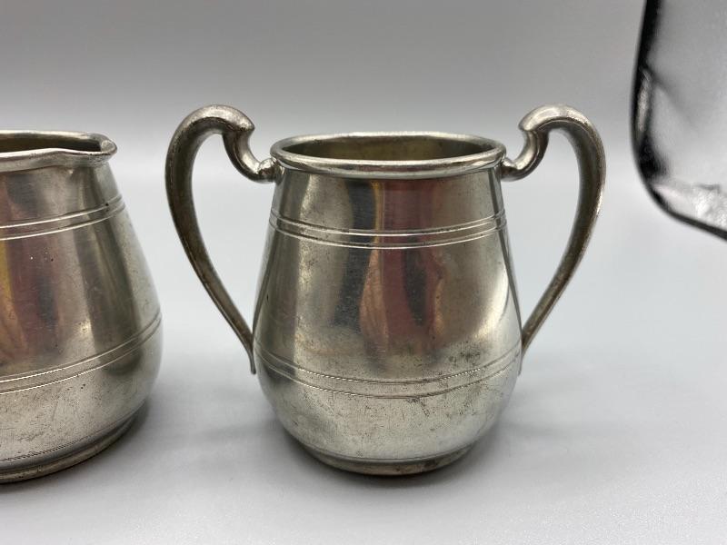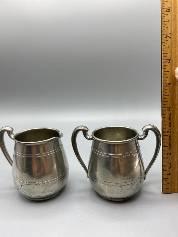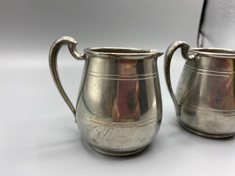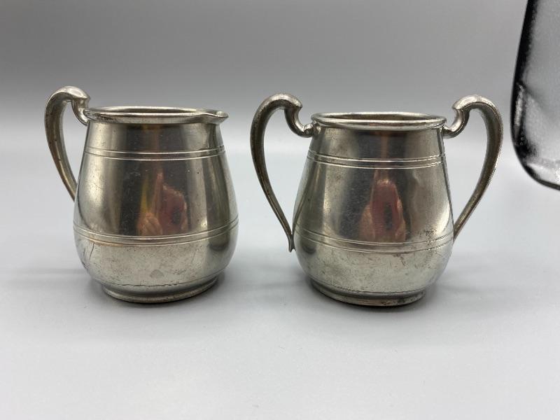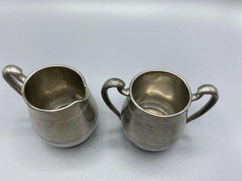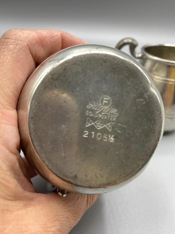 Pewter cream and sugar set by Pilgrim. Has some scratches from use.