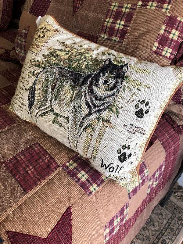 Wolf pillow with faux leather backing.
