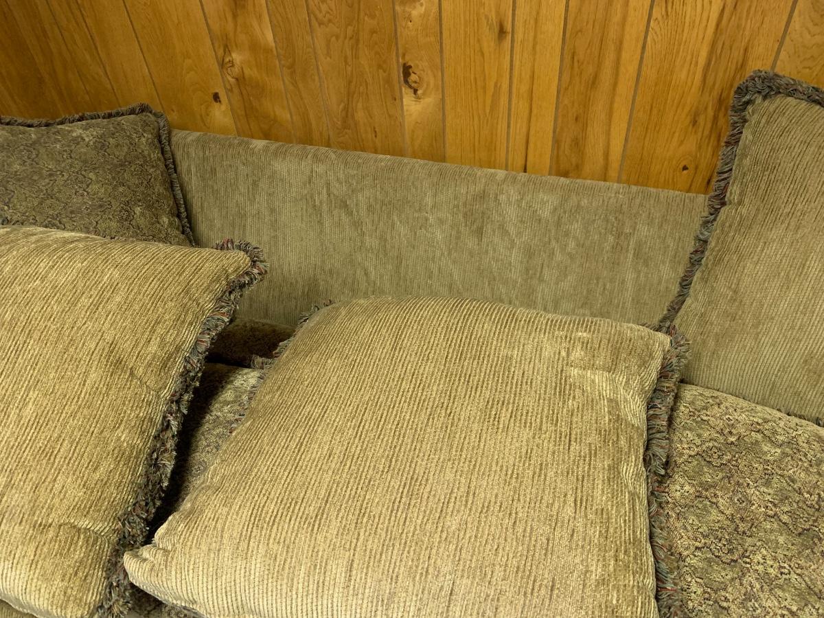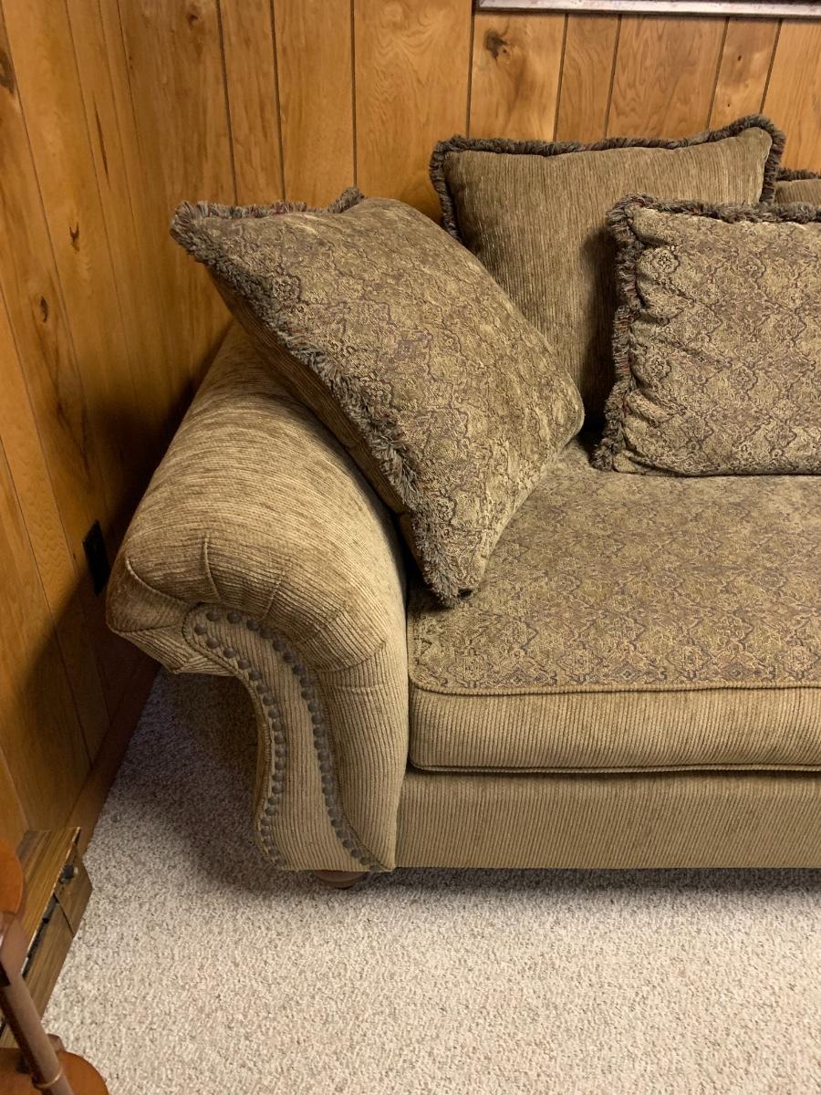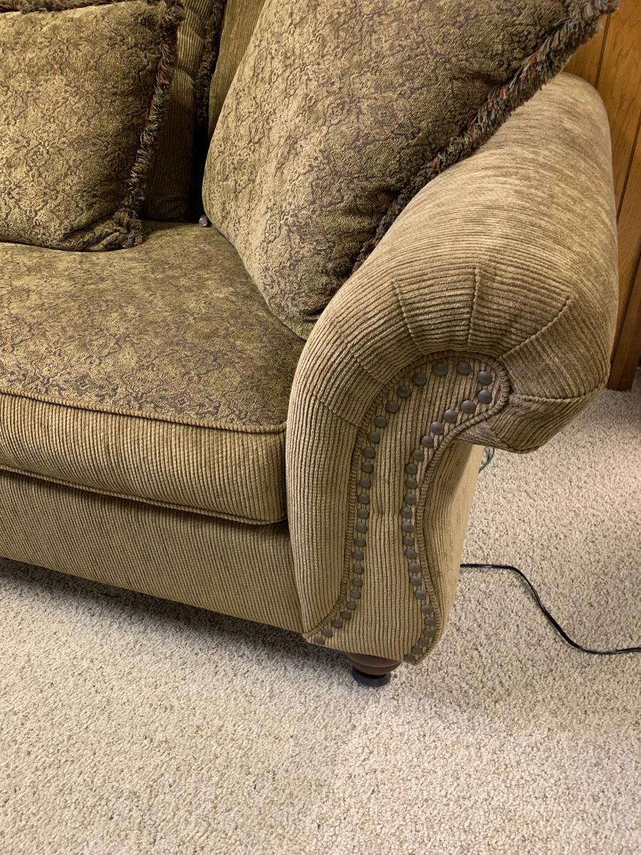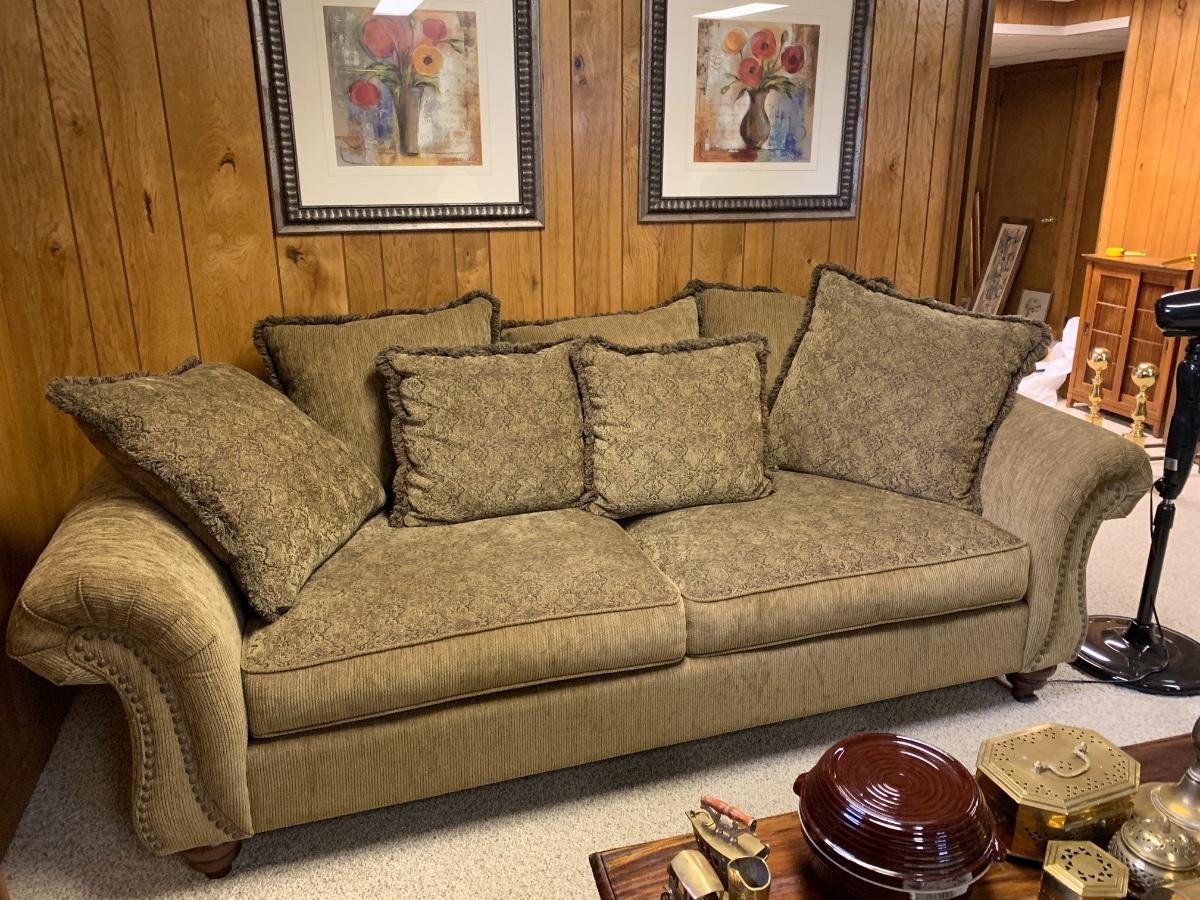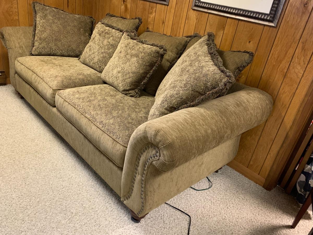 pillow back sofa in an olive upholstery with rolled arms & nail head trim on medium wood feet. Excellent condition 95" long
