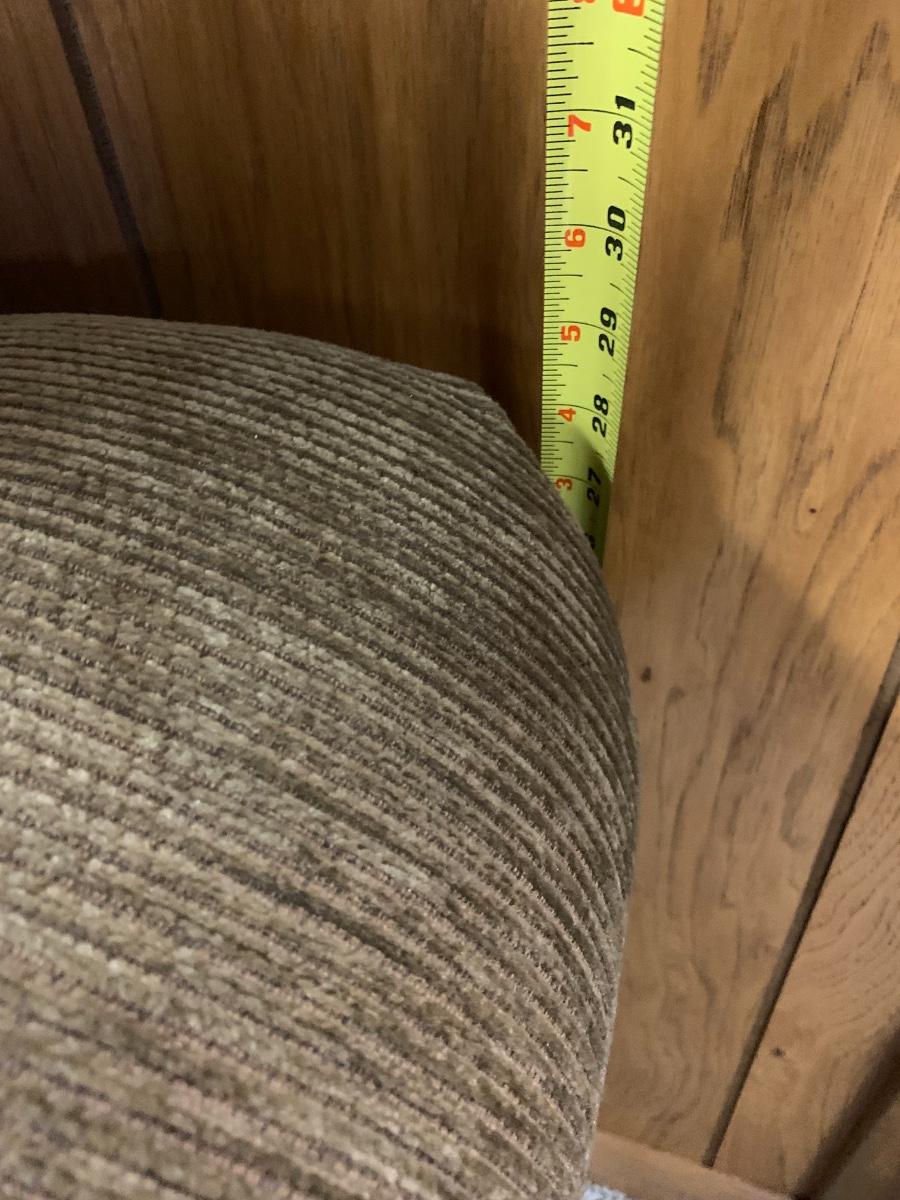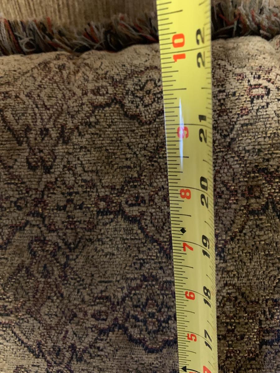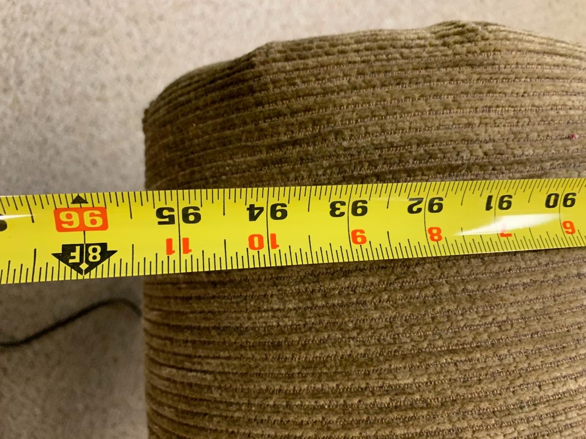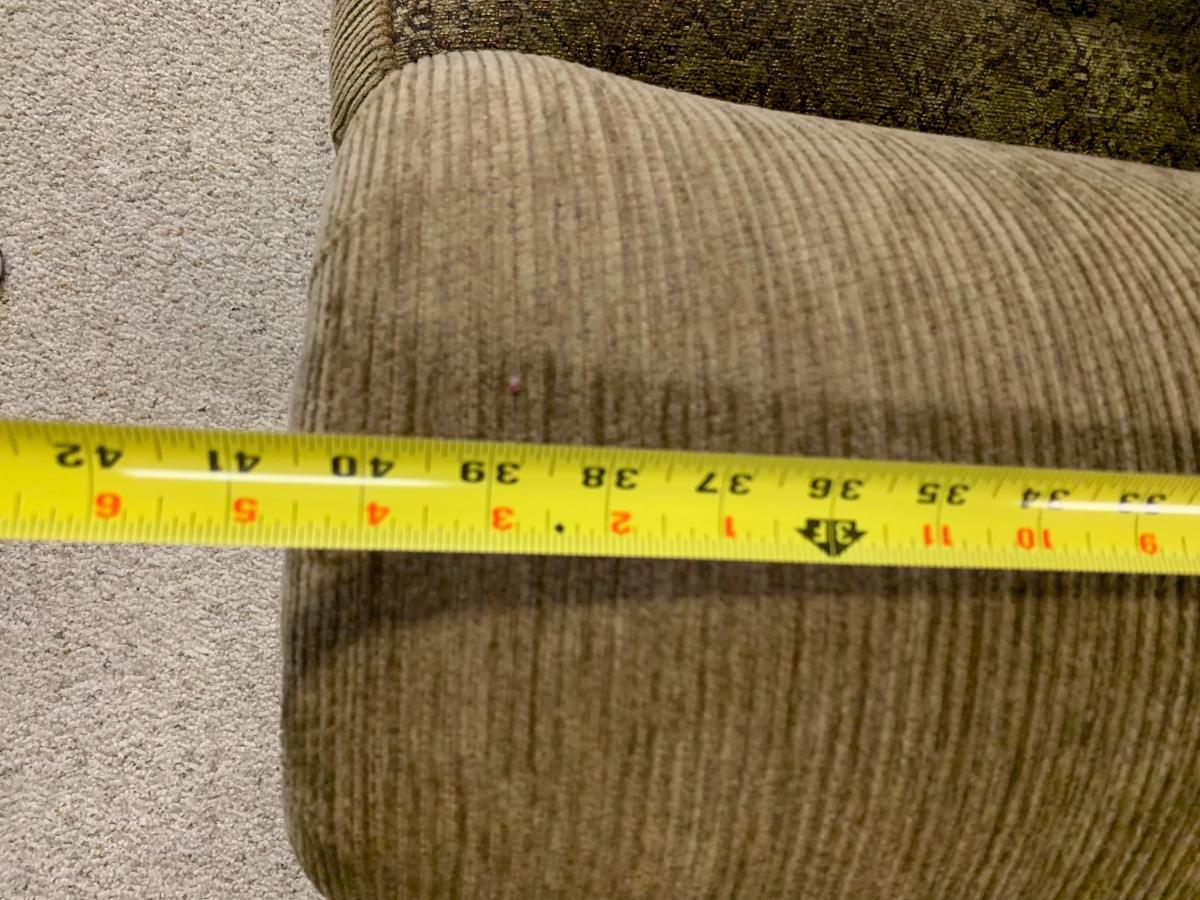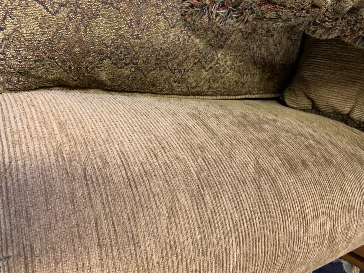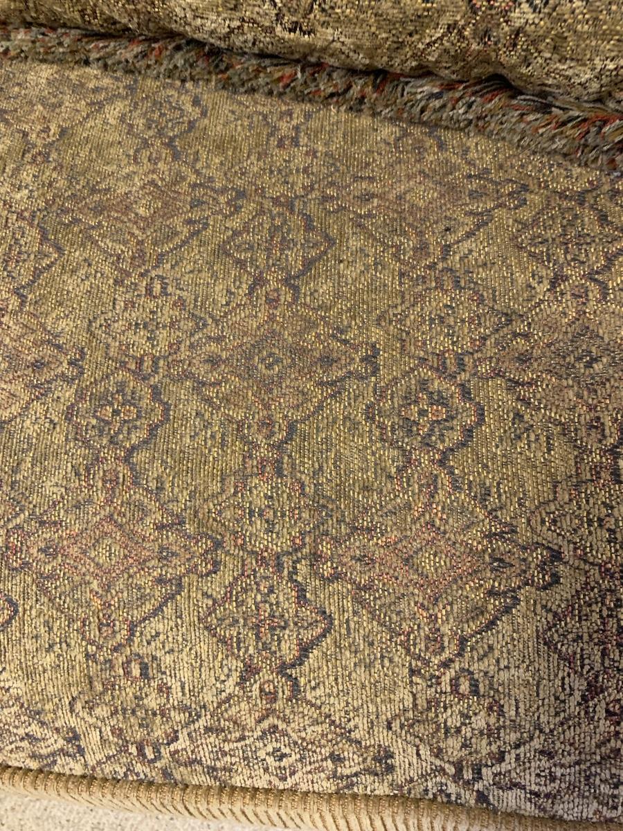 pillow back sofa in an olive upholstery with rolled arms & nail head trim on medium wood feet. Excellent condition 95" long