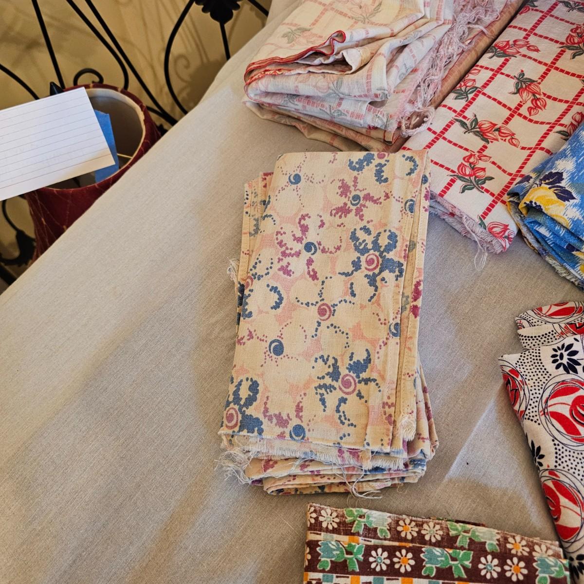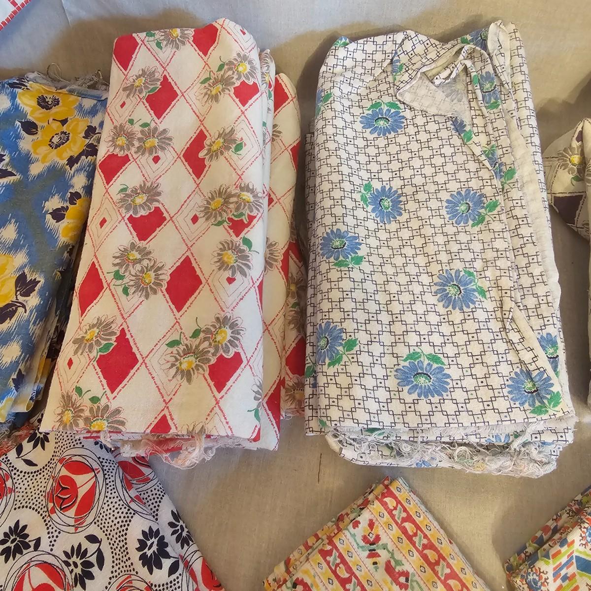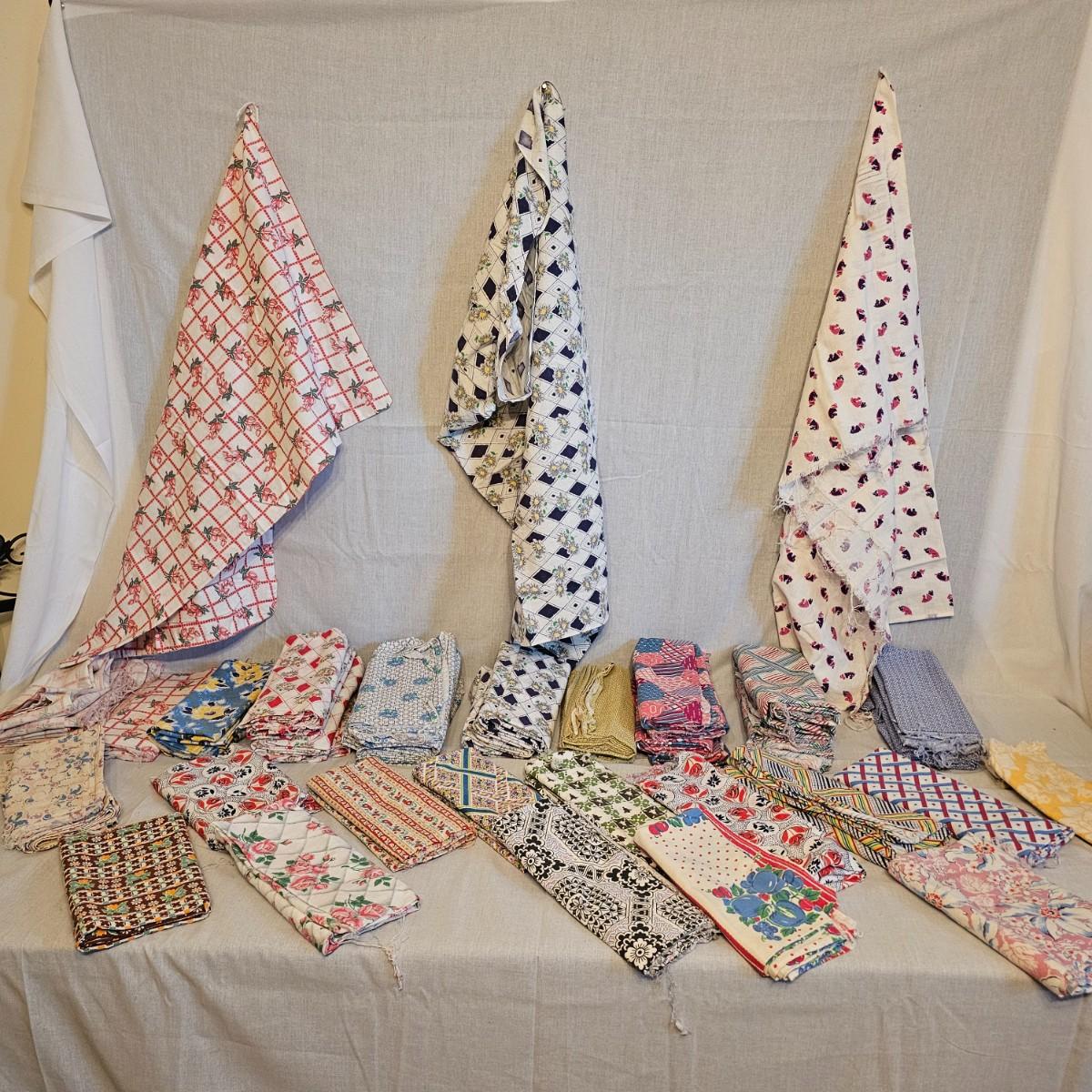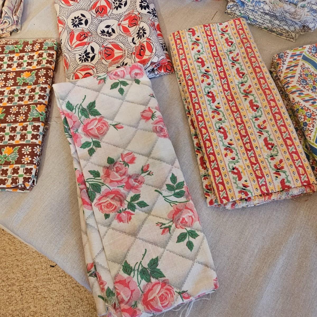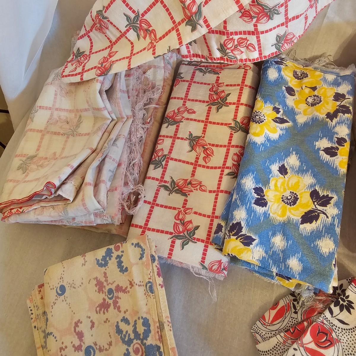 Over 40 pieces of pre-cut fabric to make pillow cases. Brightly colored flowers, fruit and patterns are in singles, twos, threes and fours to make approximately large size pillow cases. Fabric measures on average 42" x 33". Some items near completion, others in work. See photos for details. Shipping available.