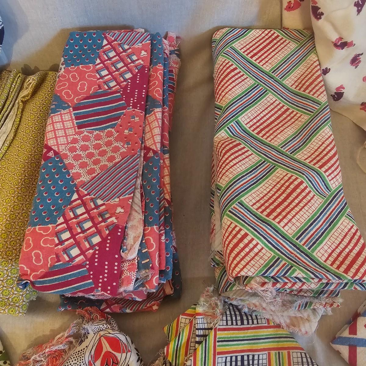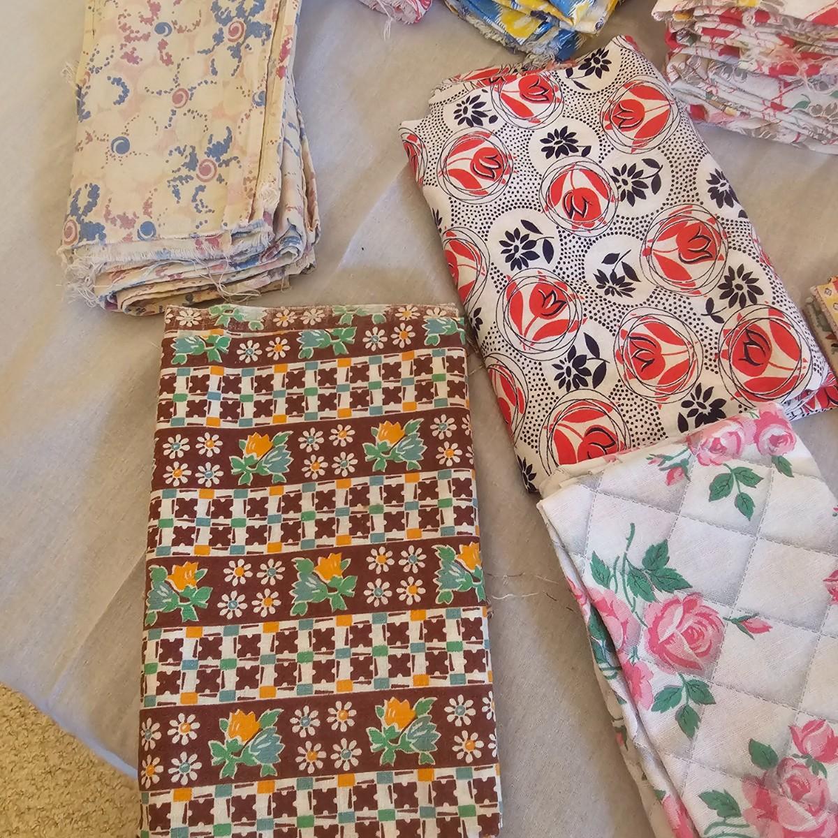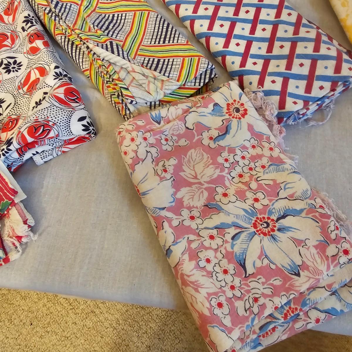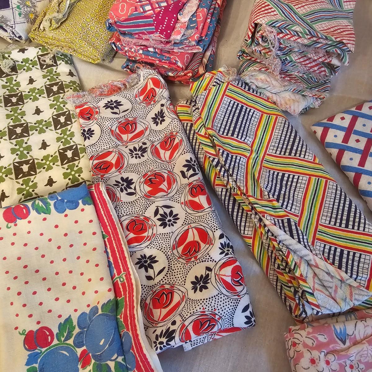 Over 40 pieces of pre-cut fabric to make pillow cases. Brightly colored flowers, fruit and patterns are in singles, twos, threes and fours to make approximately large size pillow cases. Fabric measures on average 42" x 33". Some items near completion, others in work. See photos for details. Shipping available.