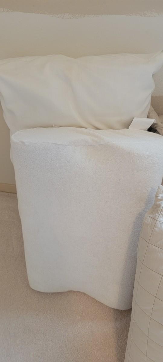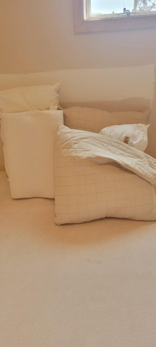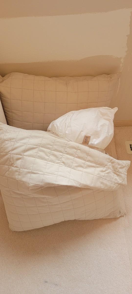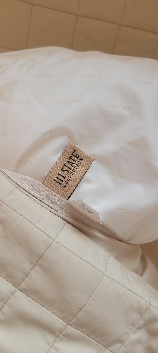 Two Square Calvun Klein pillows with quilted 111 State covers, plus two misc pillows