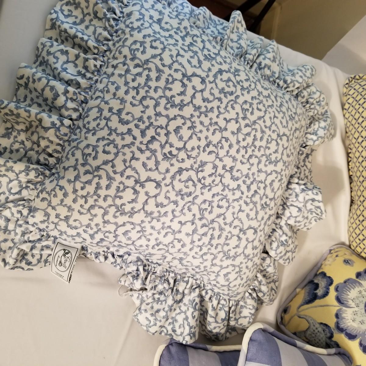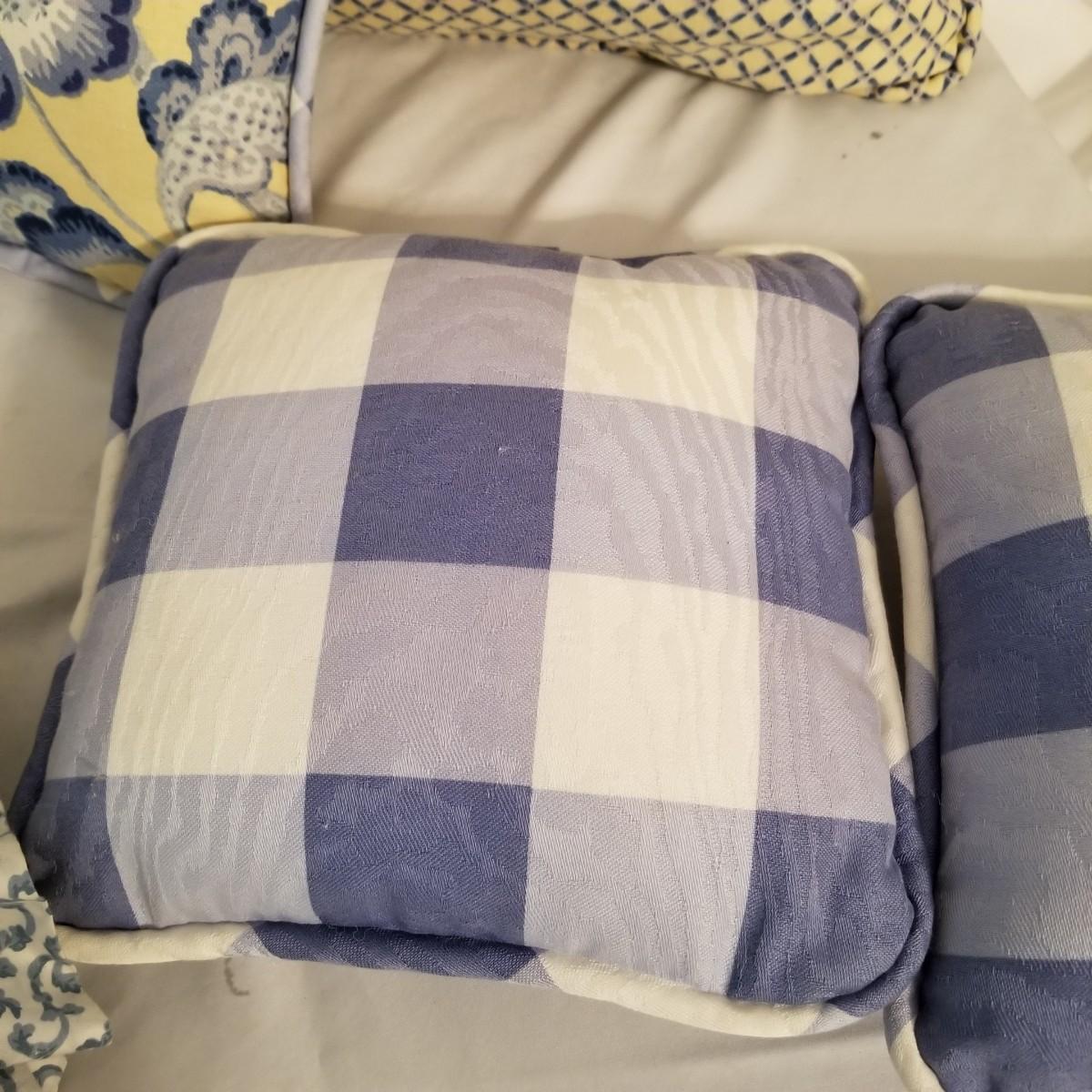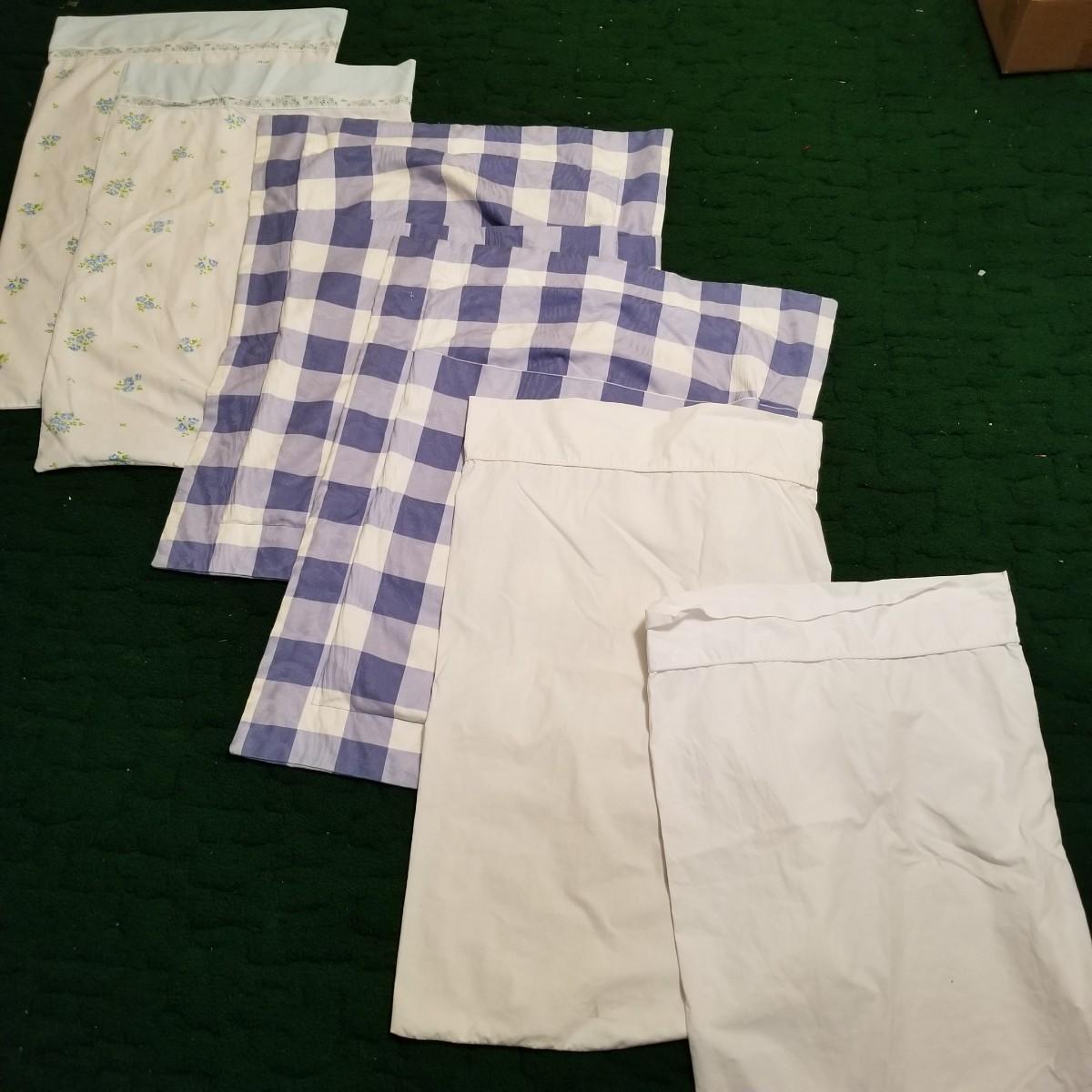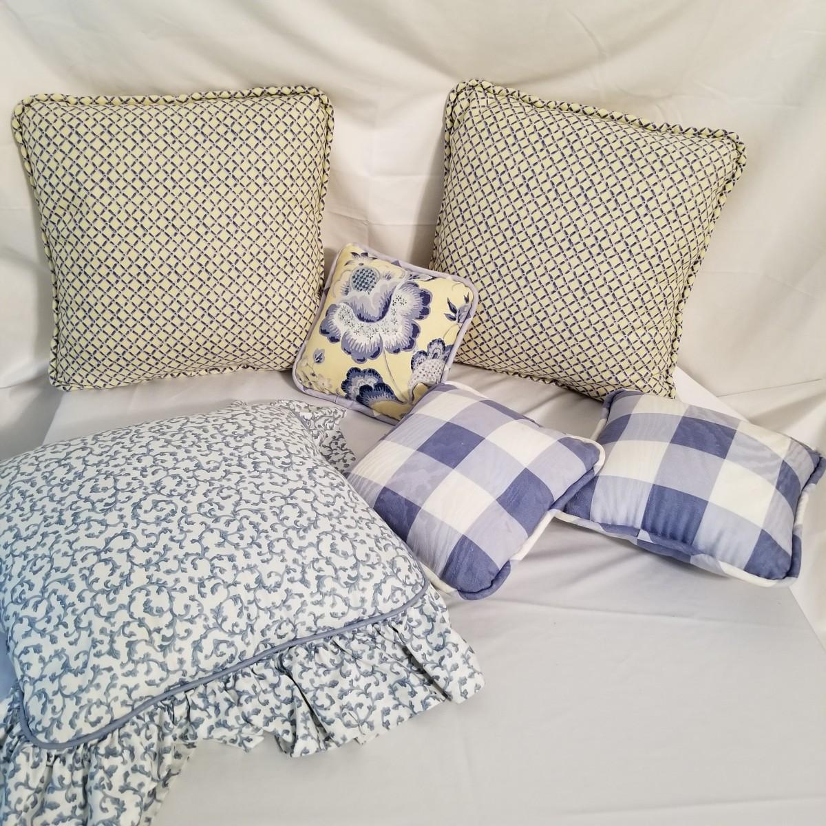 Six throw pillows, four pillowcases and two pillow shams. The pillowcases are for standard size pillows. The blue checked shams are 25" x31", will hold a 19" x25" insert. The smaller throw pillows are 9" square, and the three larger throw pillows are 15" to 21" square. All items in good condition. Local pickup only.