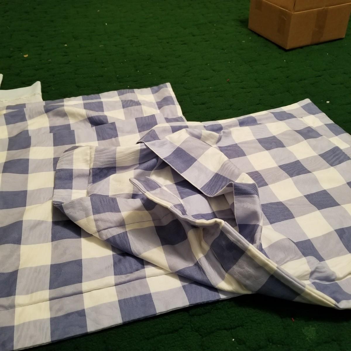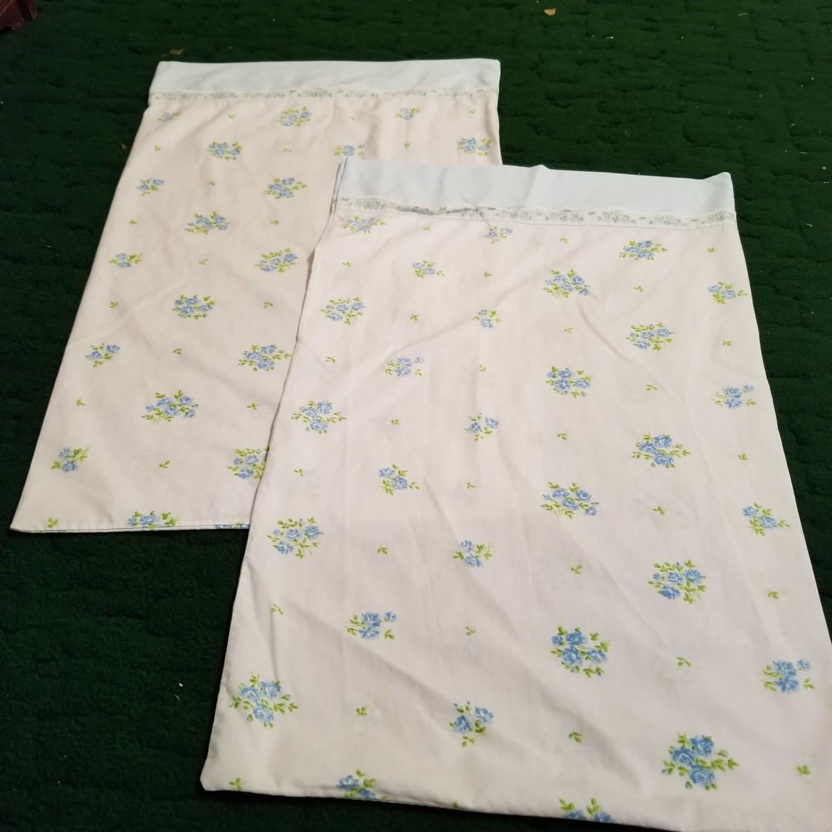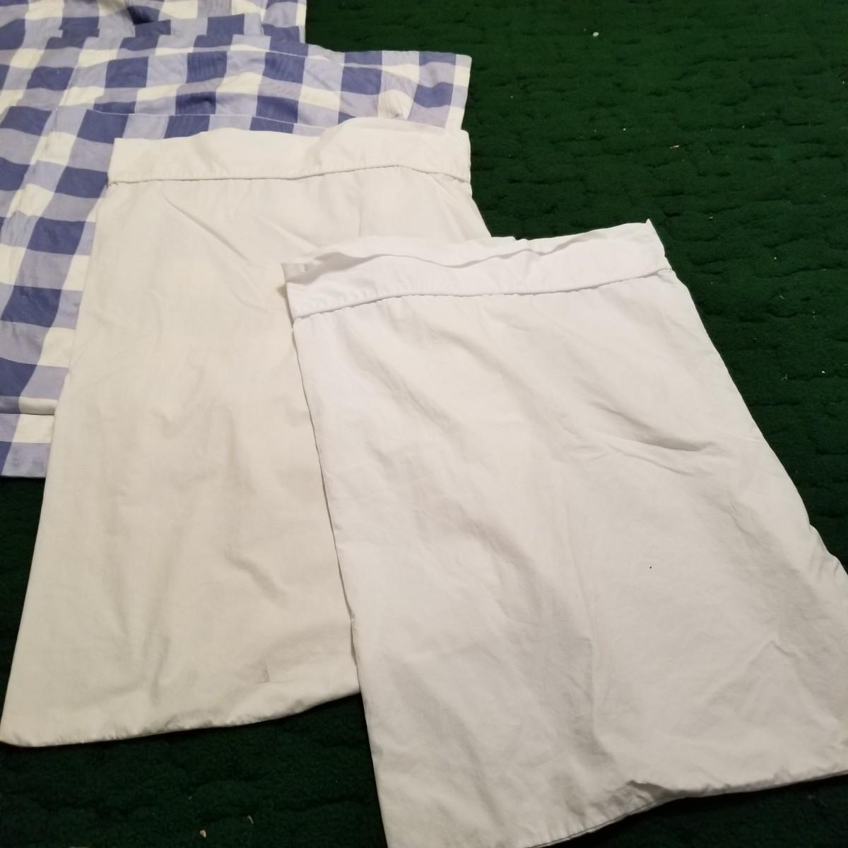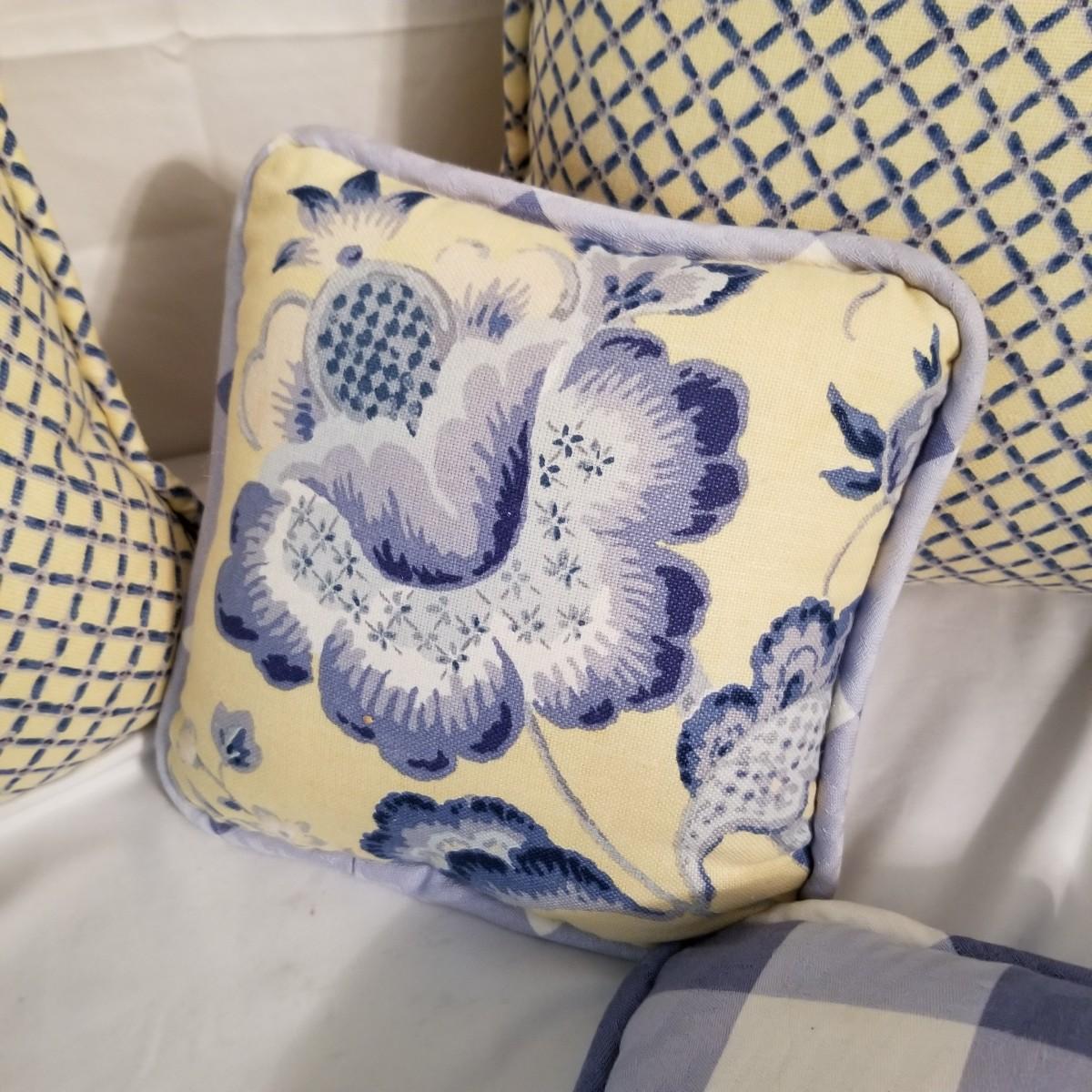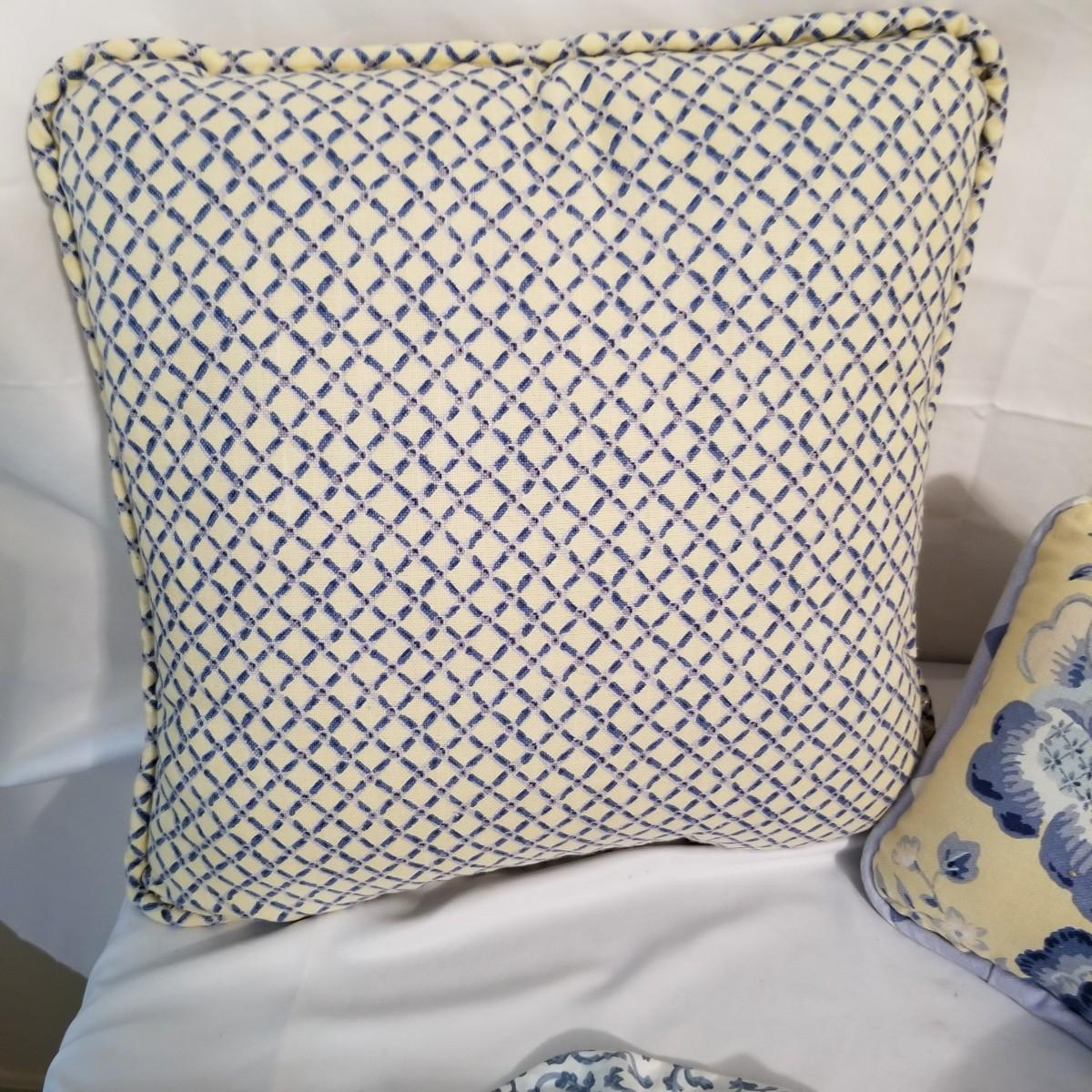 Six throw pillows, four pillowcases and two pillow shams. The pillowcases are for standard size pillows. The blue checked shams are 25" x31", will hold a 19" x25" insert. The smaller throw pillows are 9" square, and the three larger throw pillows are 15" to 21" square. All items in good condition. Local pickup only.