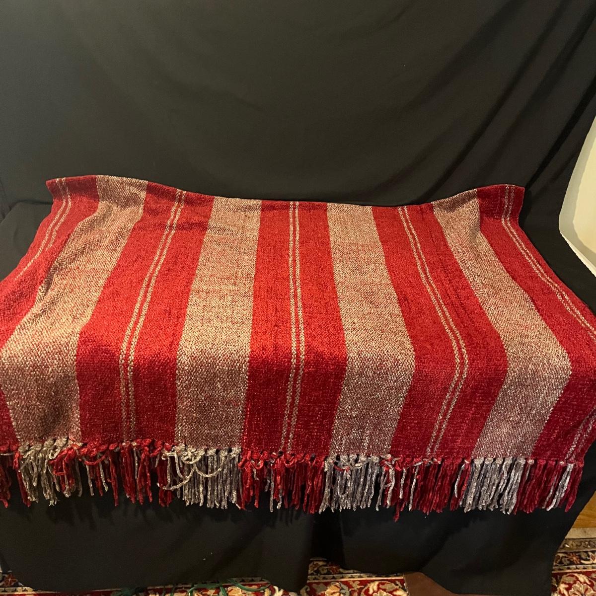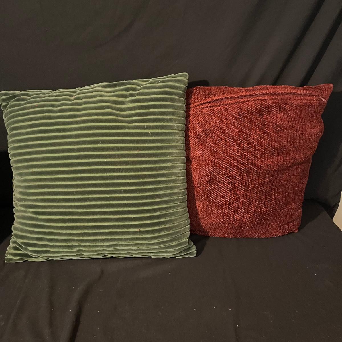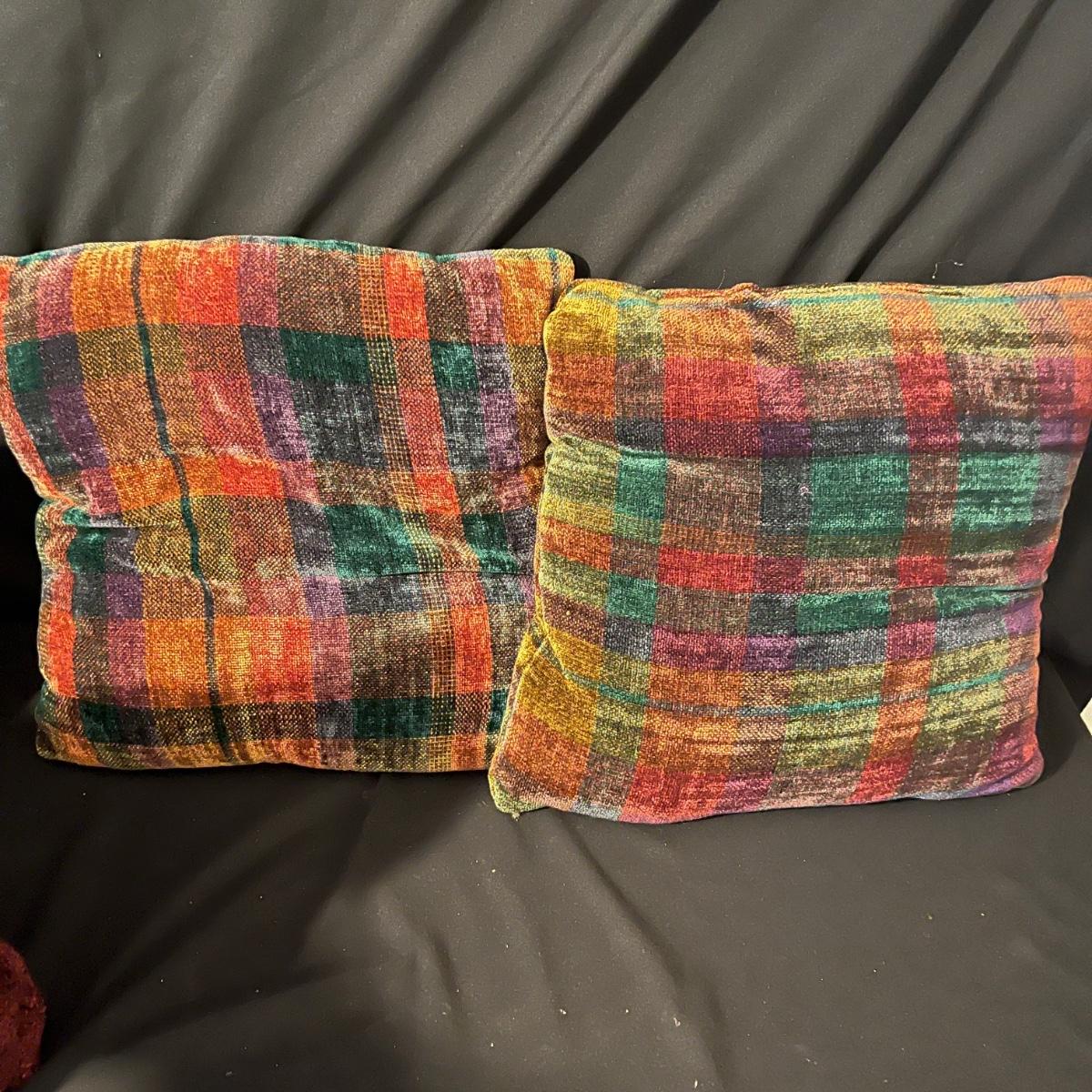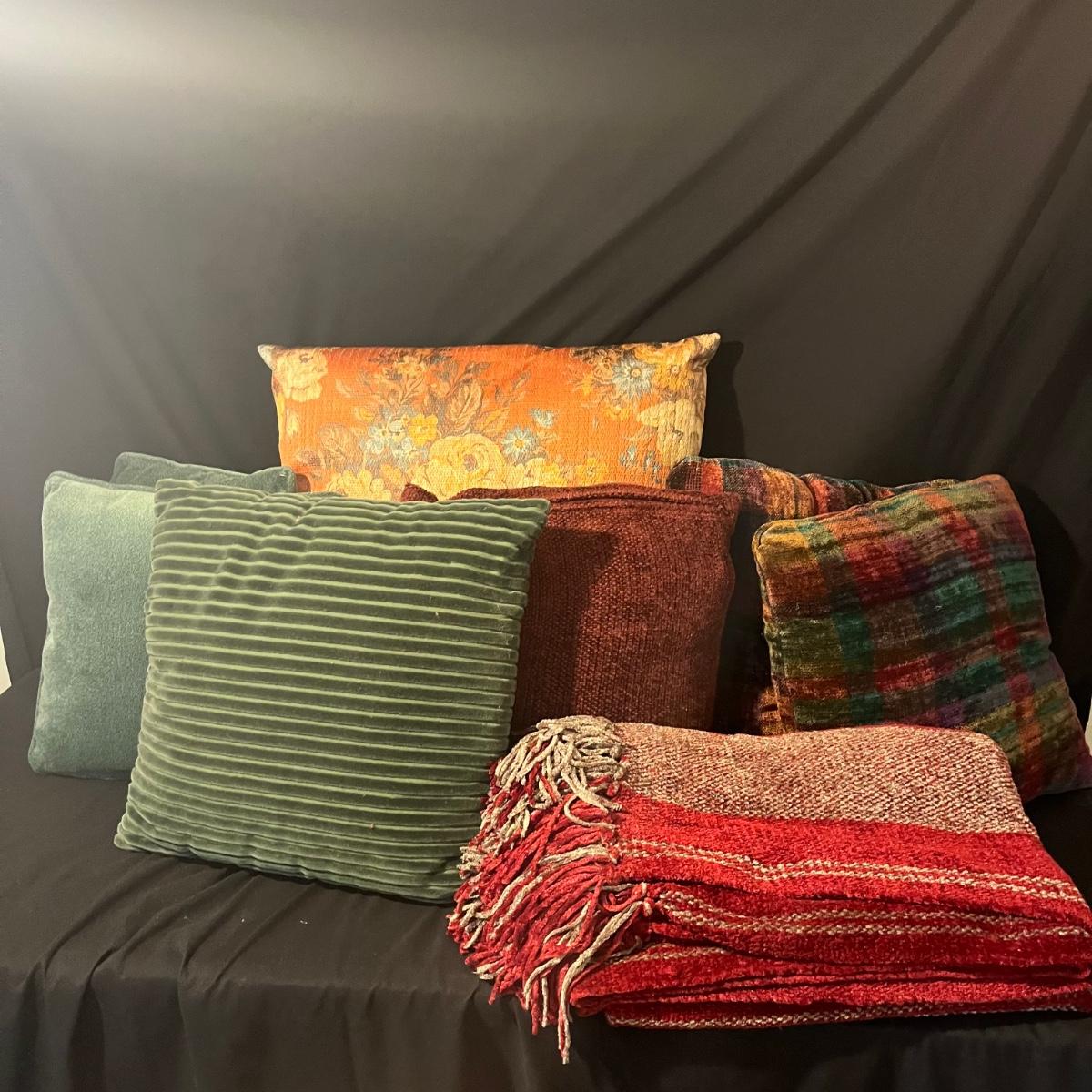 Lot includes seven pillows in a variety of sizes and a throw that measures 50” x 86”. Largest pillow measures 24” x 24”.
