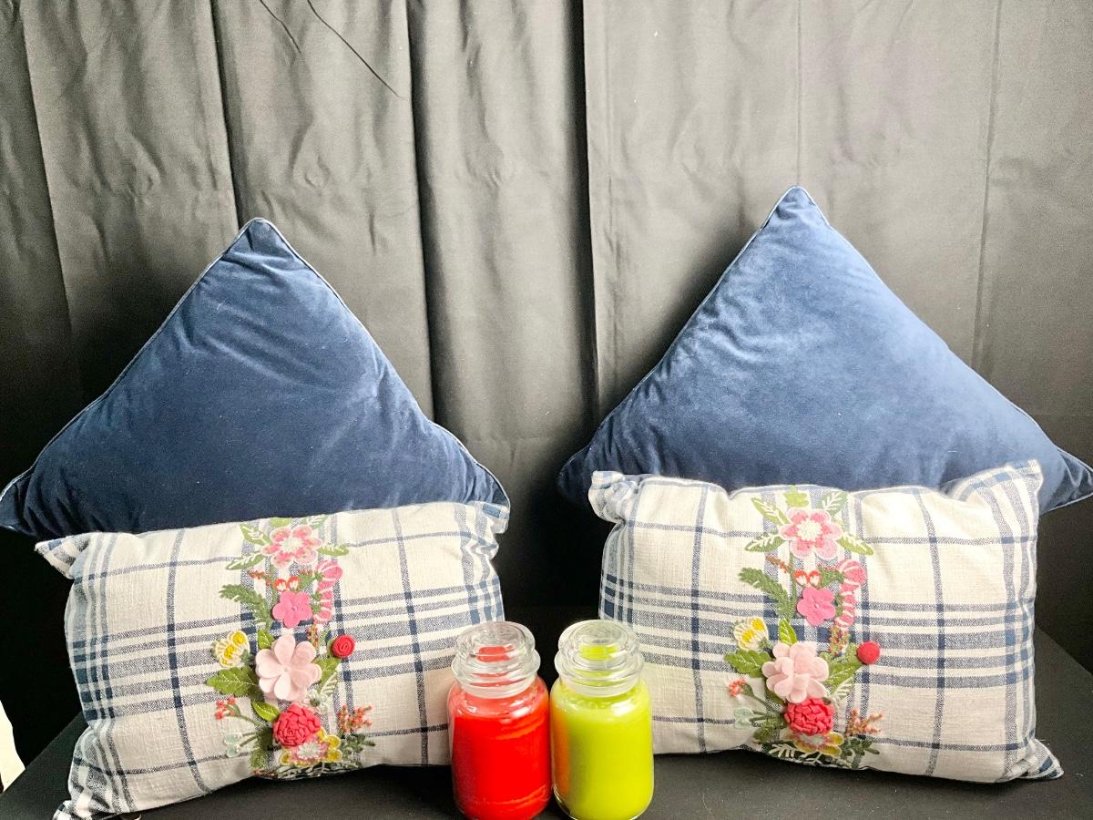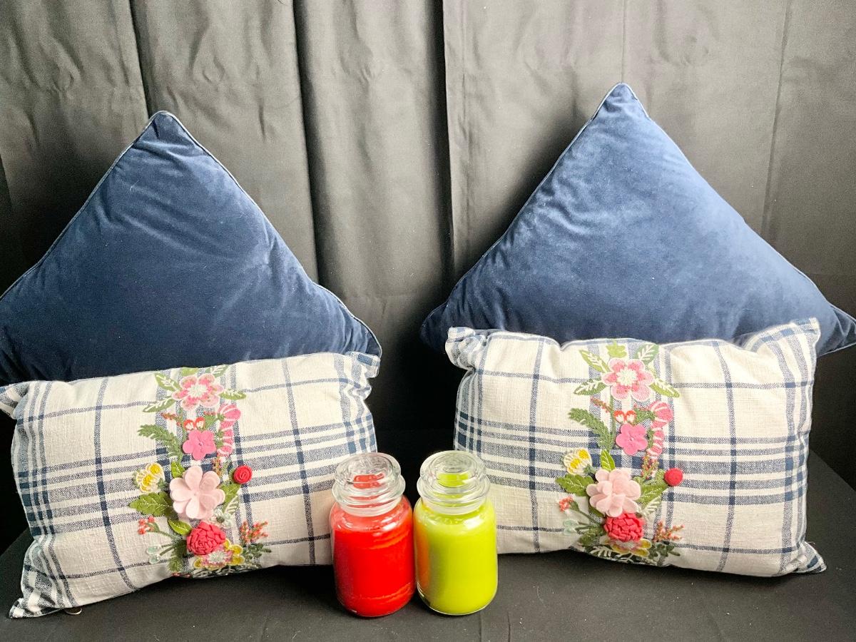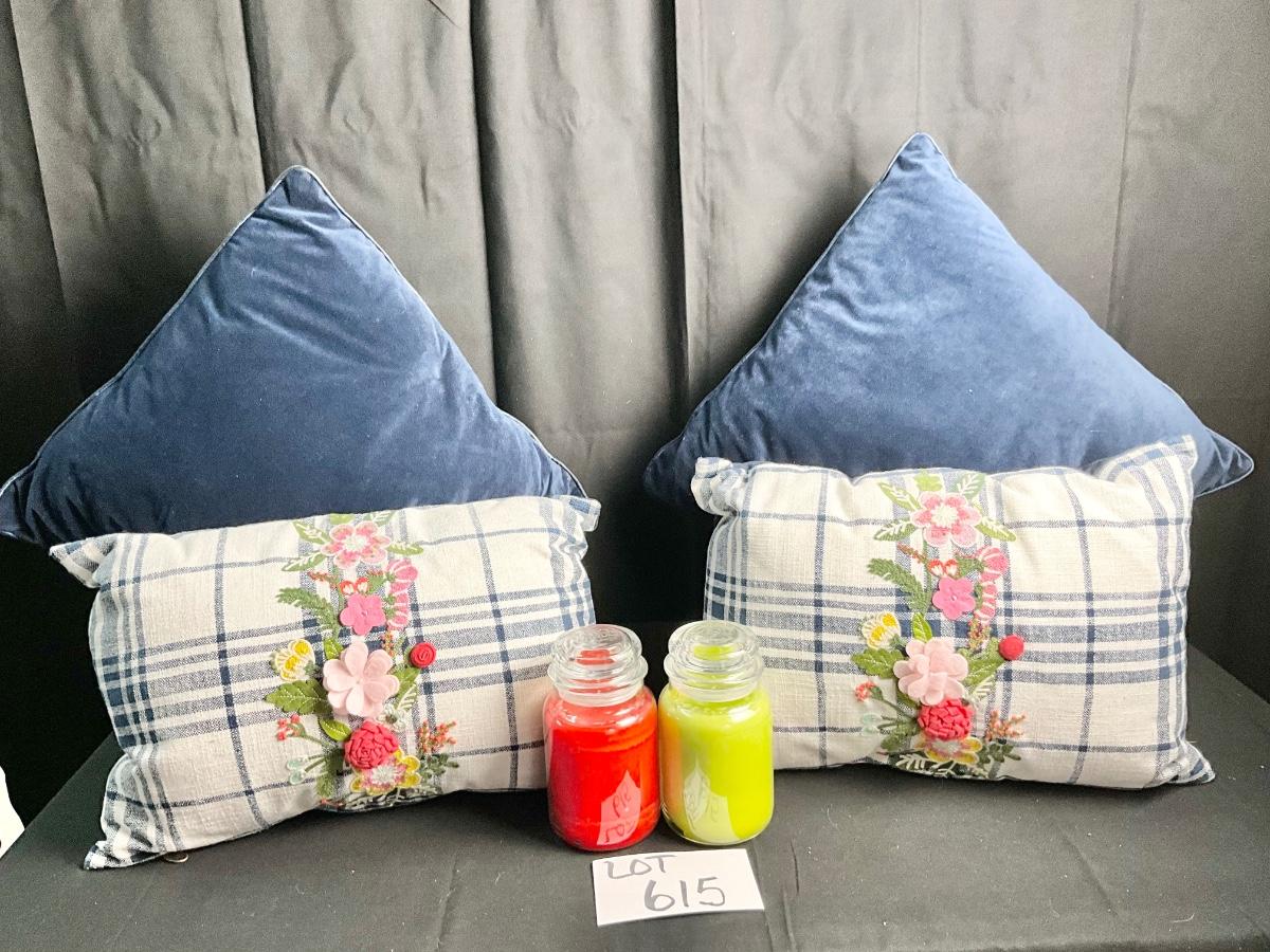 PillowsLot U 615 A Pair of Navy Blue Pier 1 Throw Pillows, & A Pair of Navy/White Plaid w/Floral Pier 1 Throw Pillows, Two Candles