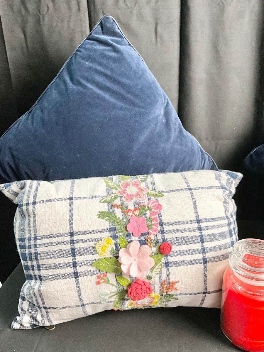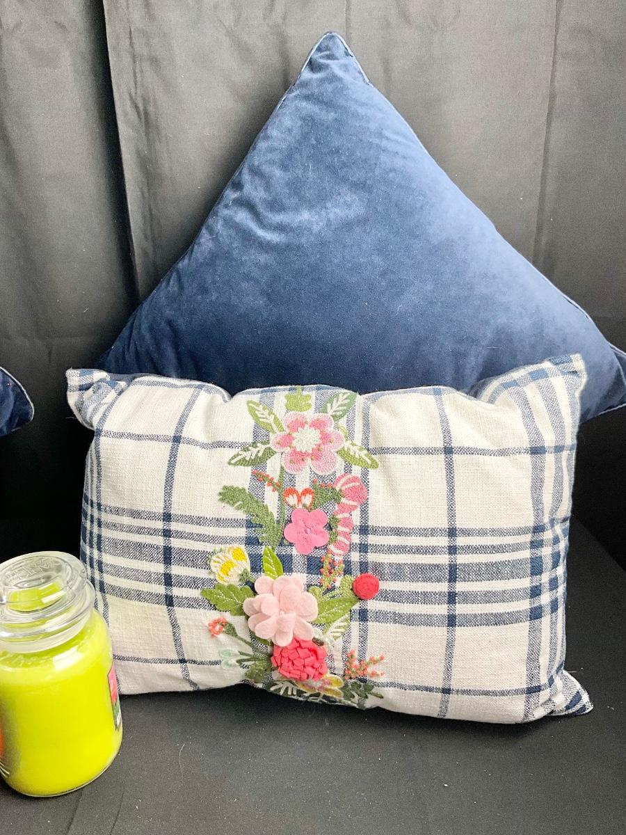 A Pair of Navy/White Plaid w/Floral Pier 1 Throw Pillows,