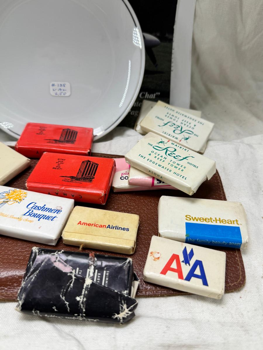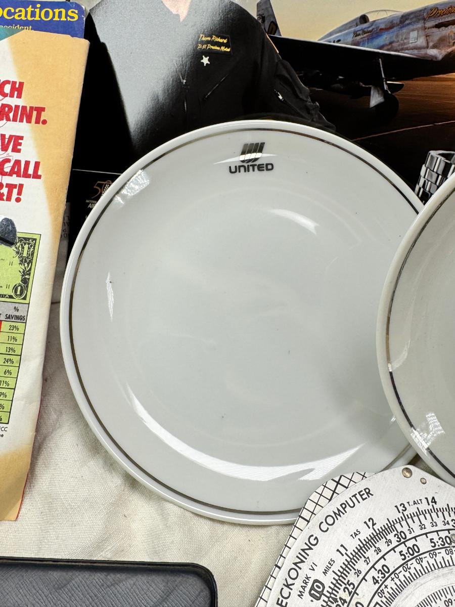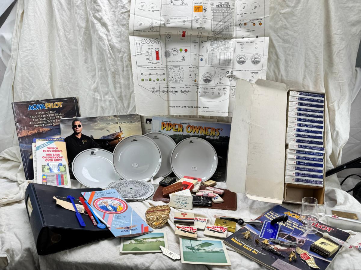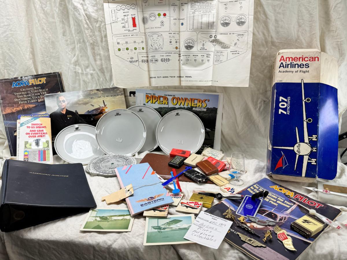 Huge collection including, flight computer, American Airlines training cassettes, 4 United airline first class desert plates, AA binder, many pins and plastic propeller blades, Magazines, Aircraft photos, ticket stubs, dashboard diagram. Vintage travel soaps,