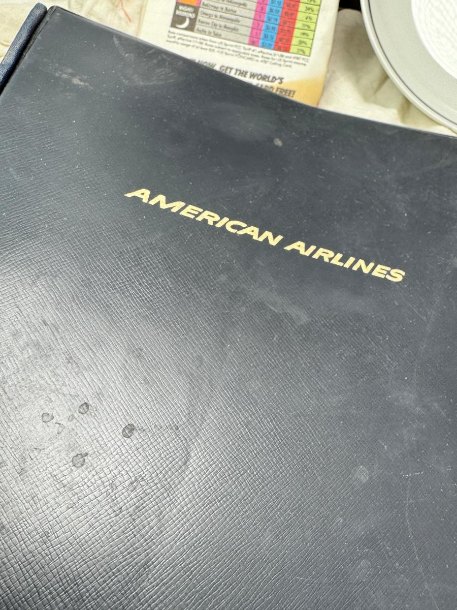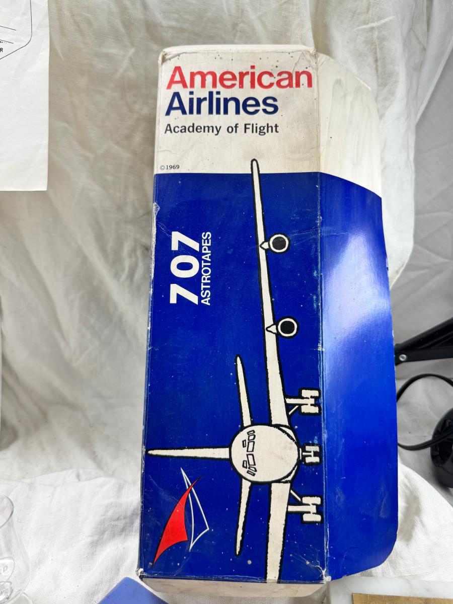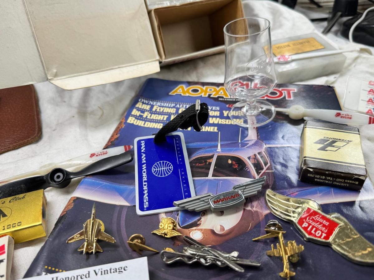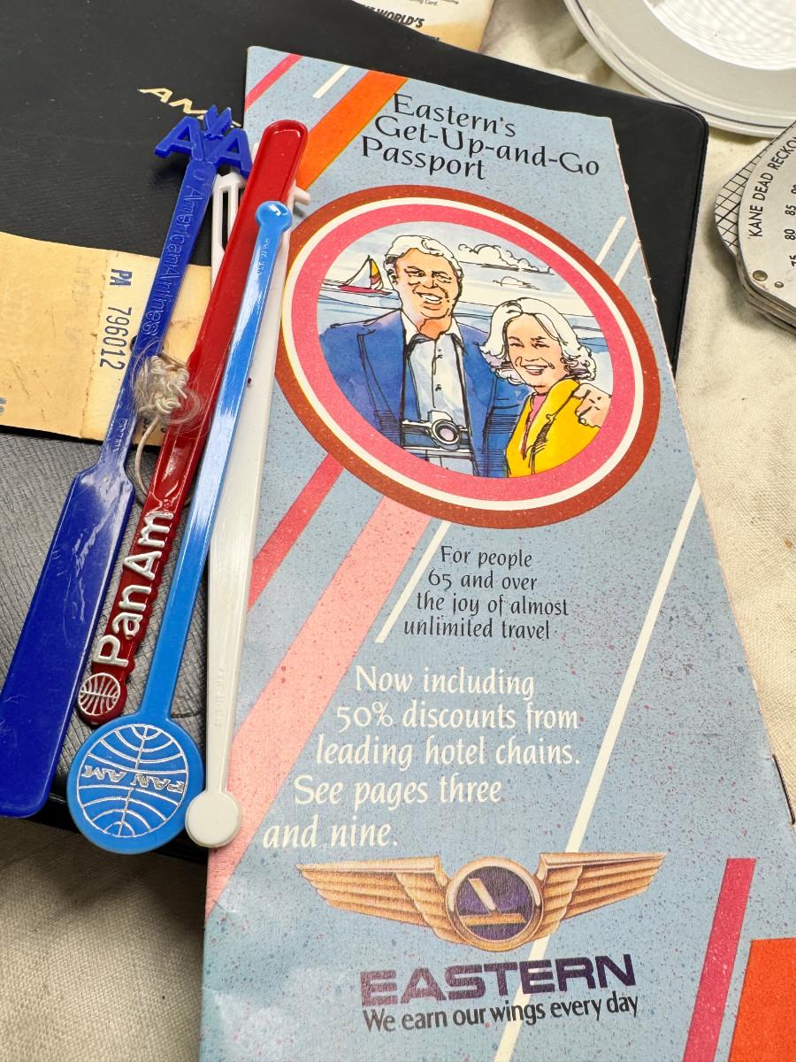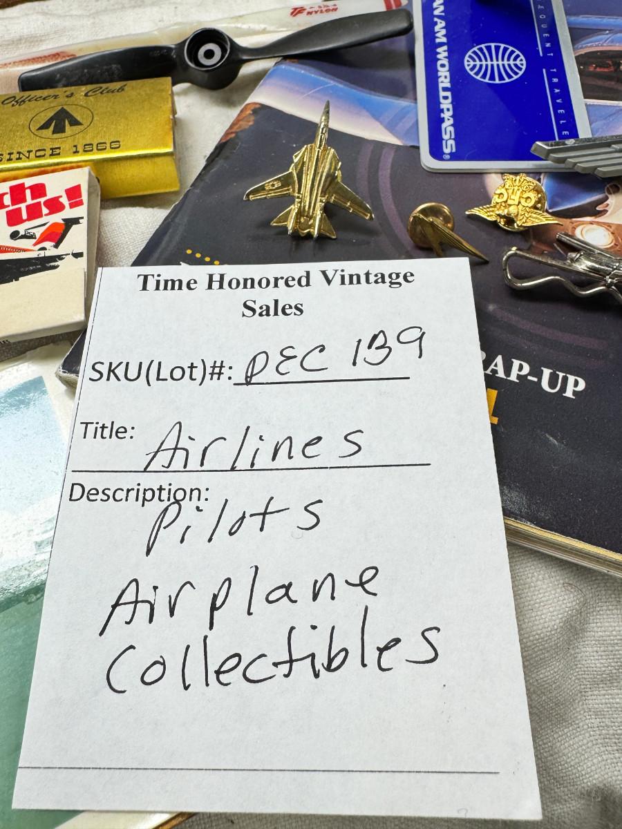 Huge collection including, flight computer, American Airlines training cassettes, 4 United airline first class desert plates, AA binder, many pins and plastic propeller blades, Magazines, Aircraft photos, ticket stubs, dashboard diagram. Vintage travel soaps,