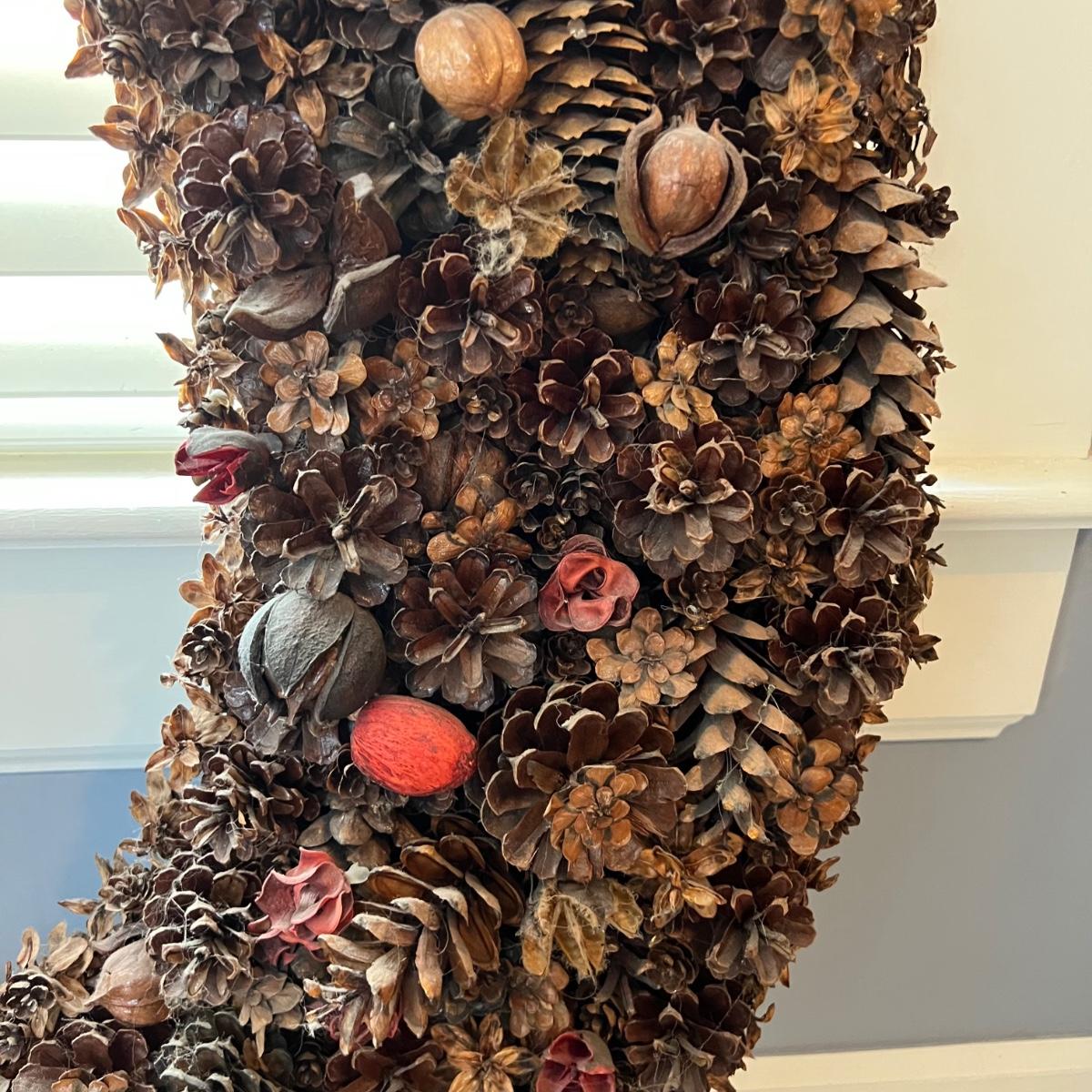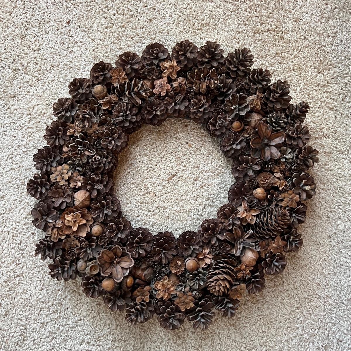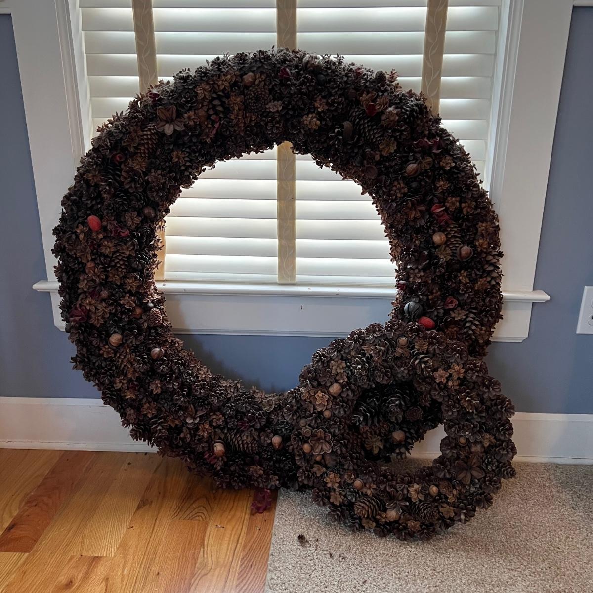 Charming rustic decor pine cone wreaths. A large wreath measures 36” D and the smaller one is 17”D. Arguably perfect for year-round enjoyment. They are both in good condition and in need of some dusting but otherwise lovely. Shipping available. Shipping art can be costly. We suggest calling our local UPS with dimensions and getting an estimate before bidding: (828) 252-6930.