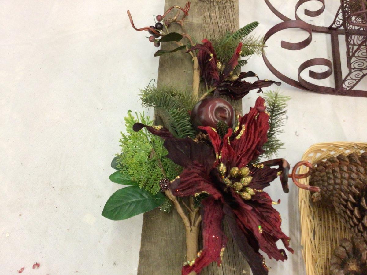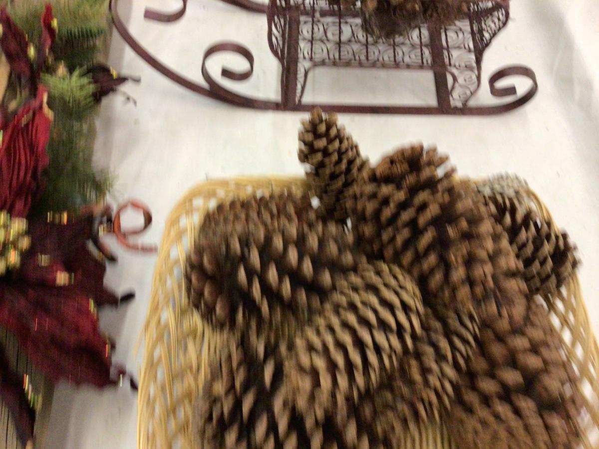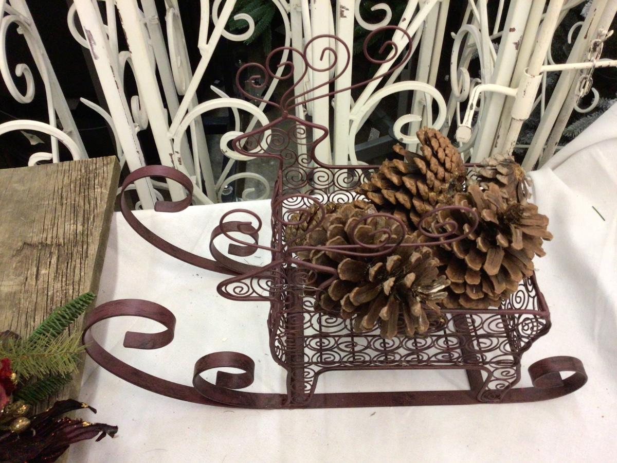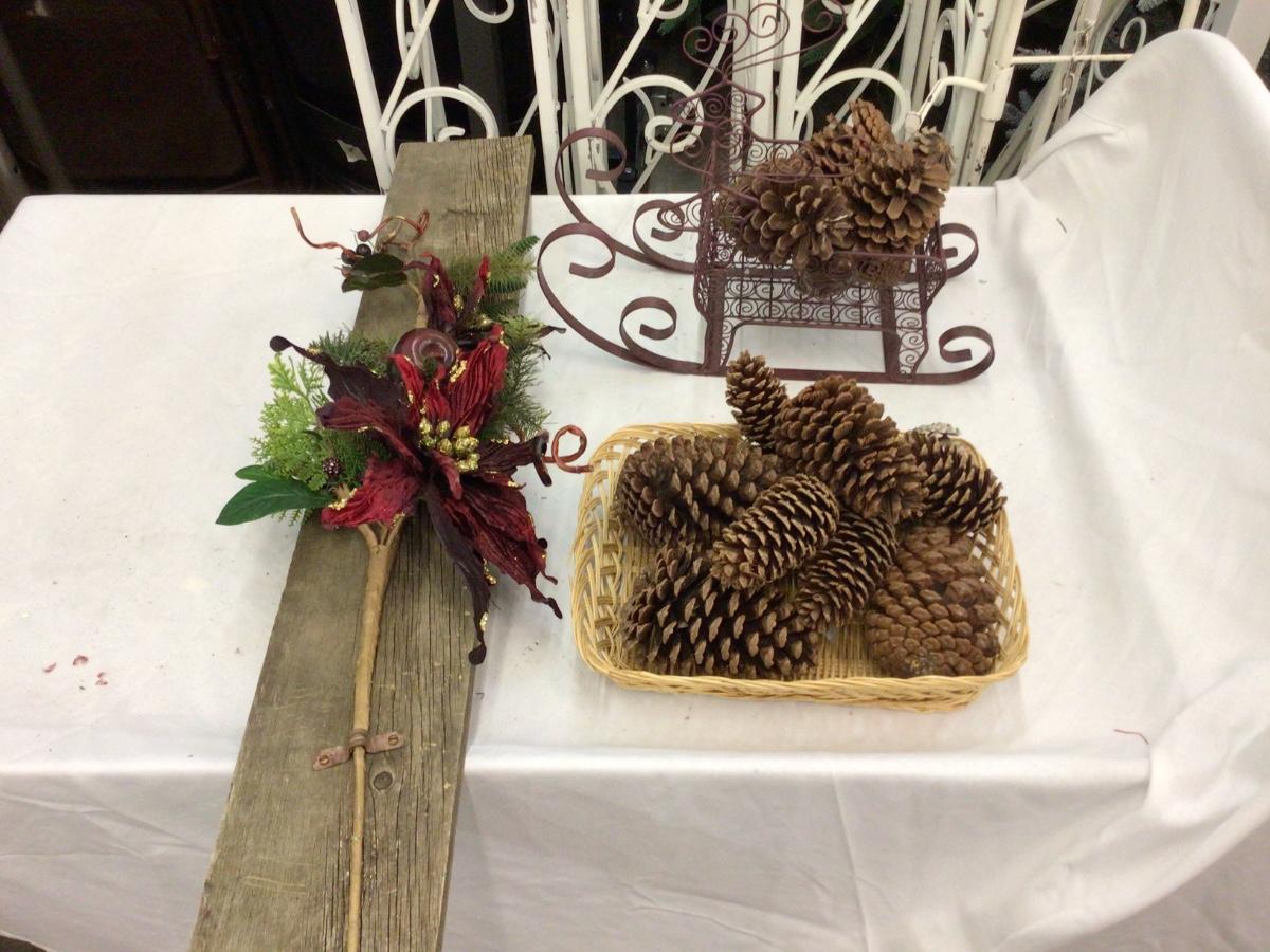 You get nice vintage wood board decor, metal reindeer sleigh with pine cones, and a basket with pine cones.