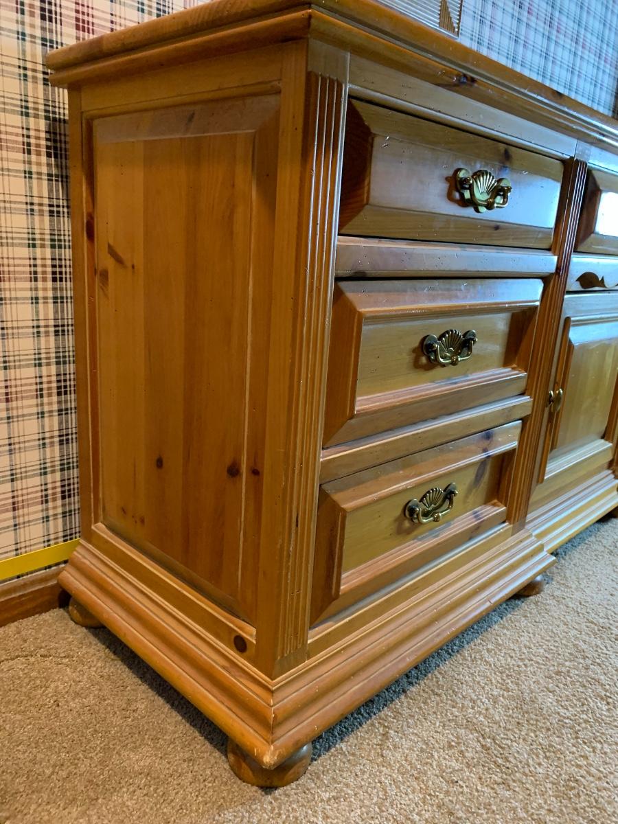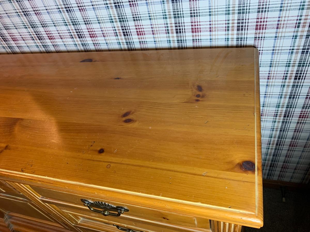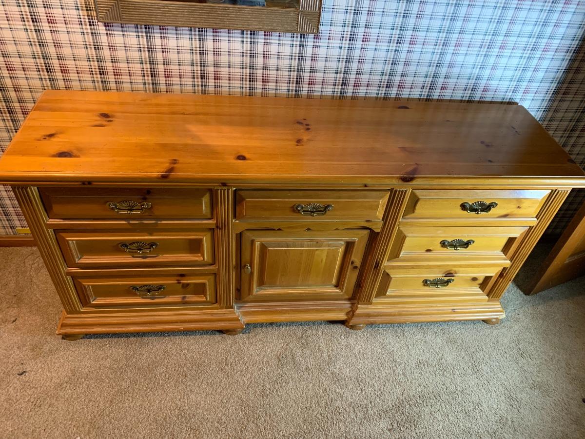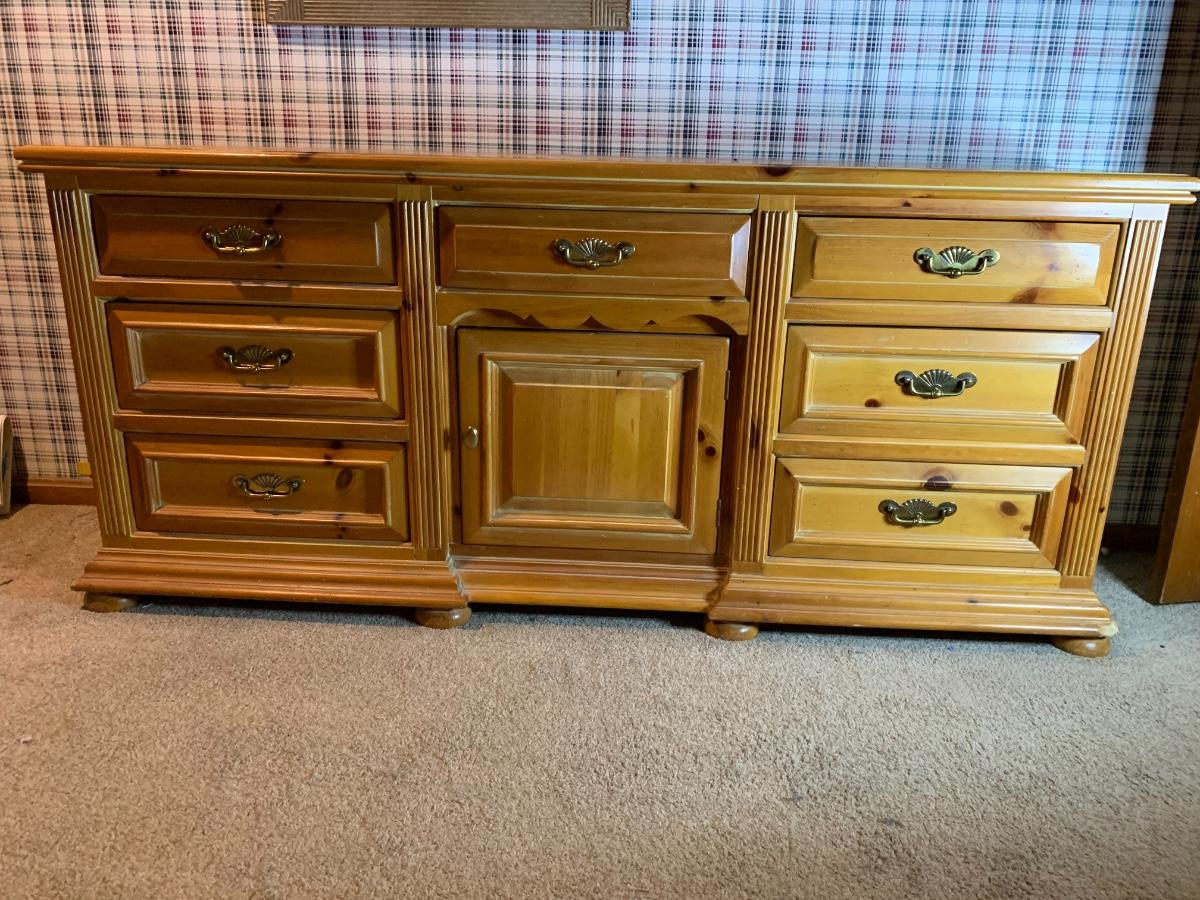 Pine Dresser with seven drawers and one cabinet. In fair condition with some chew marks on the feet and some scratches overall (73 inches in length, 32 1/2 inches in height, 19 1/2 inches in depth)