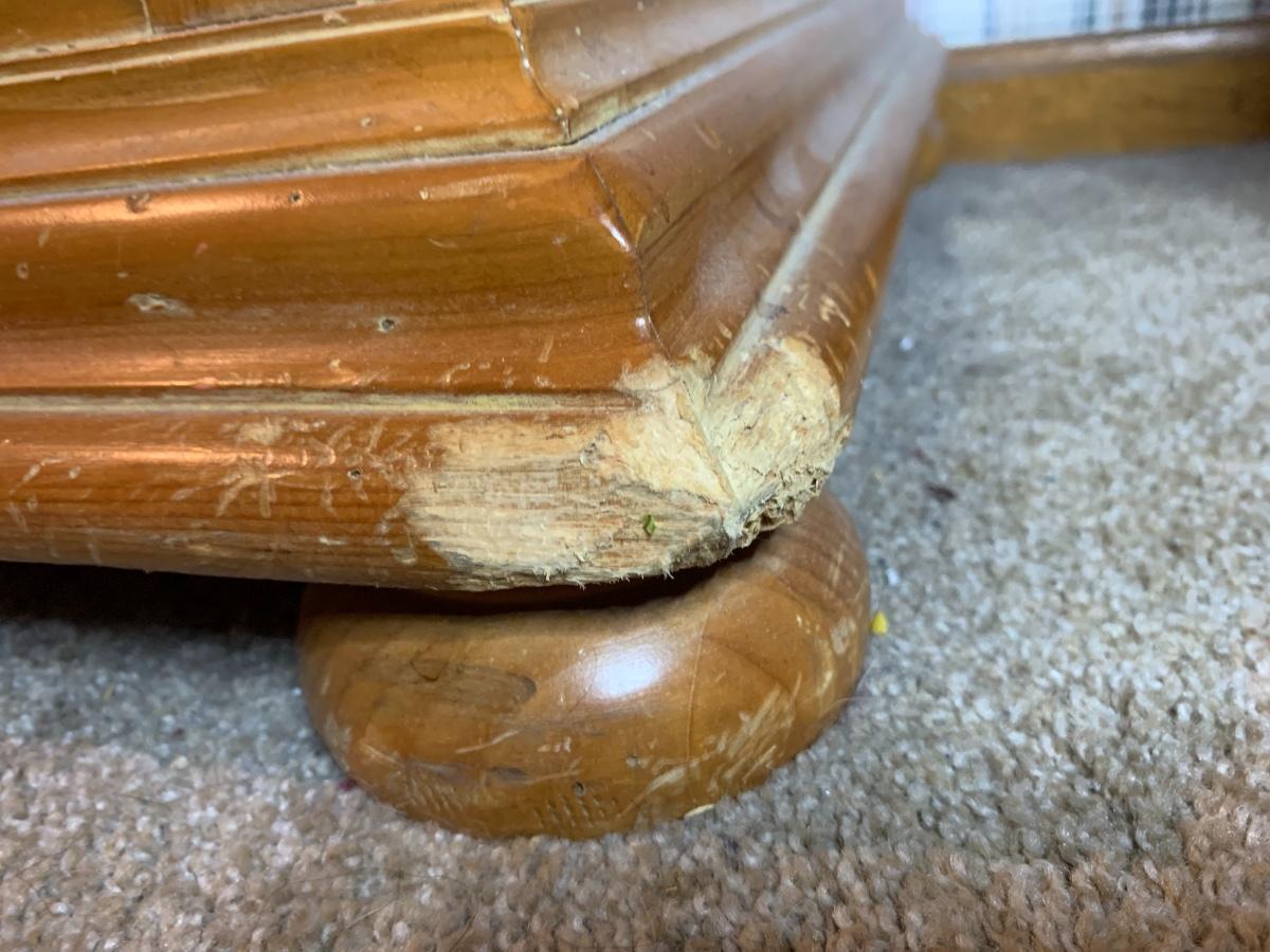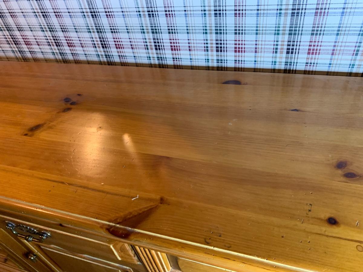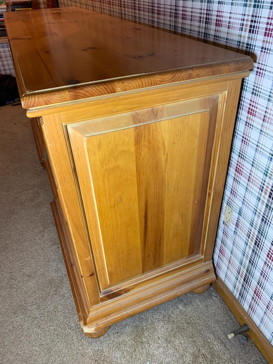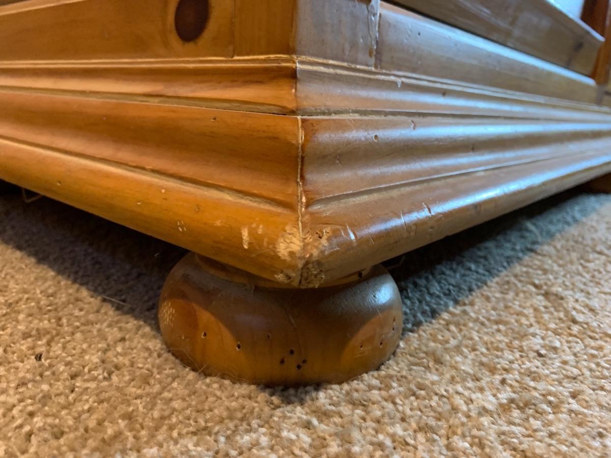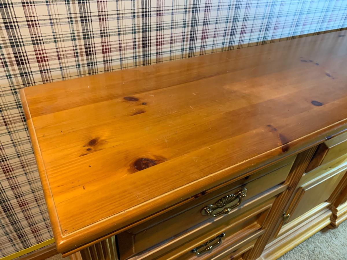 Pine Dresser with seven drawers and one cabinet. In fair condition with some chew marks on the feet and some scratches overall (73 inches in length, 32 1/2 inches in height, 19 1/2 inches in depth)