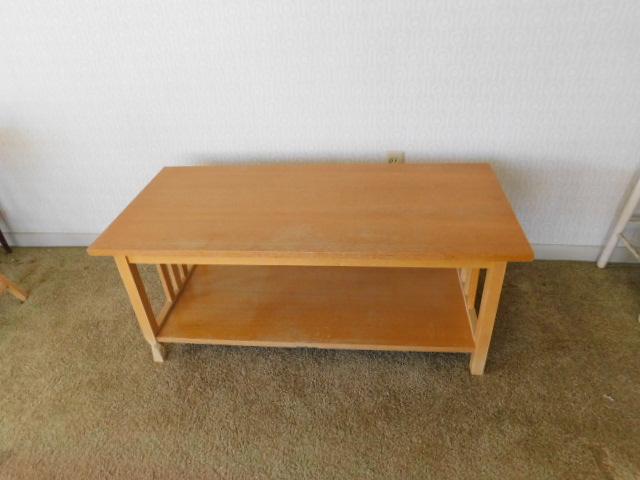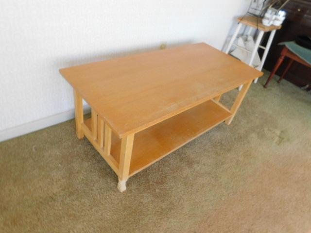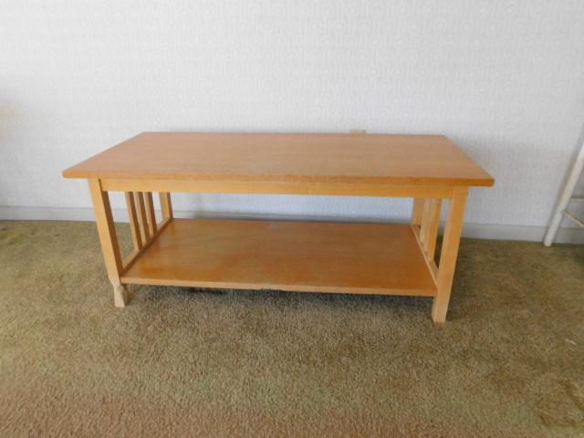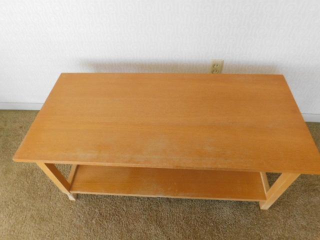 Pine Finish Mission Style Coffee Table 44"x21"x18" has copious wear to surface and some nicks. Can be refinished.