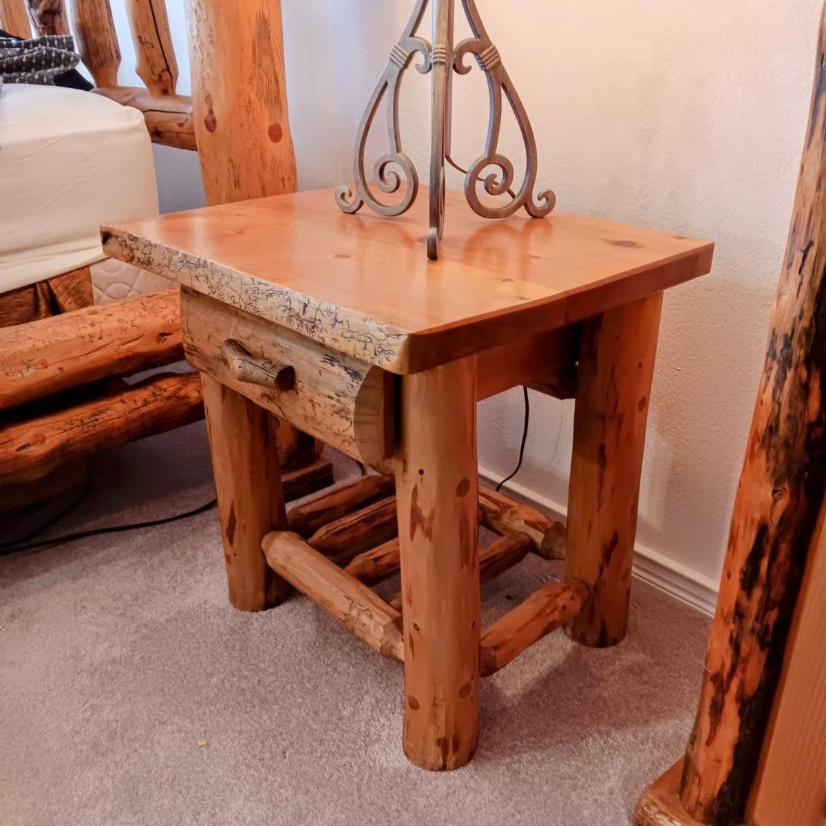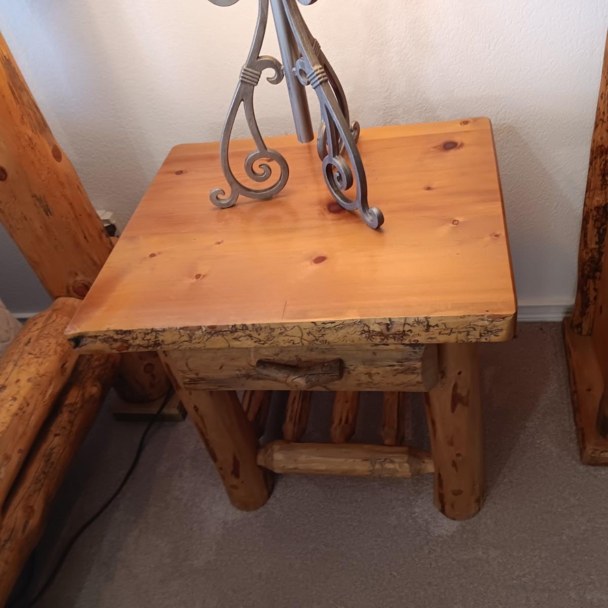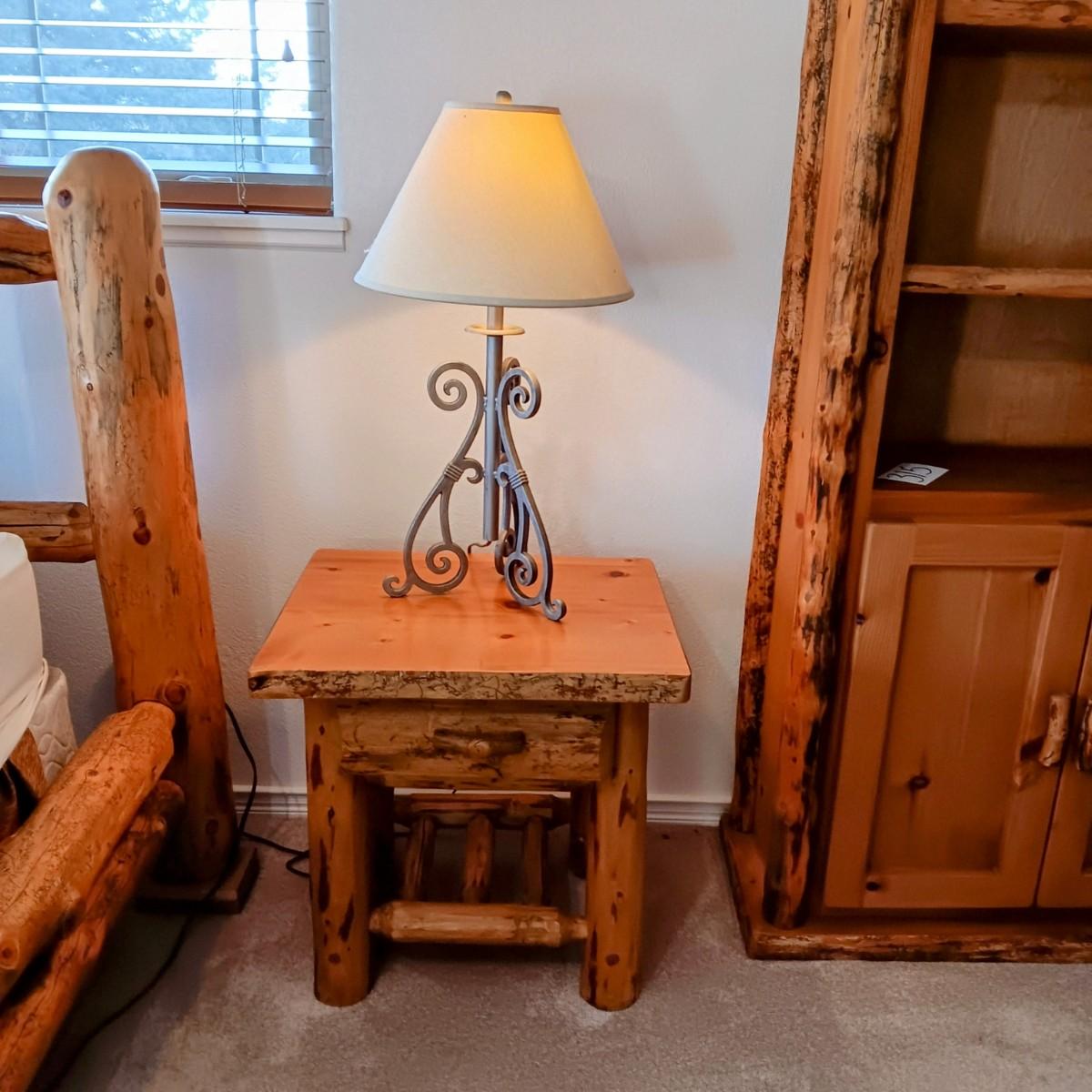 PINE LOG NIGHT STAND WITH 1 DRAWER AND IRON BASE LAMP