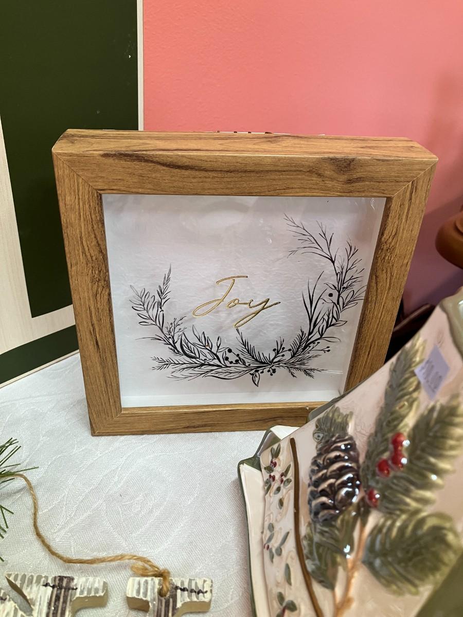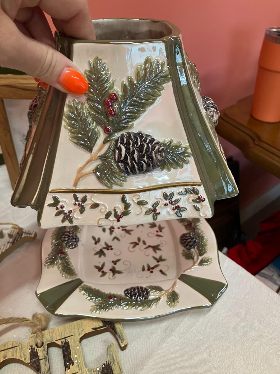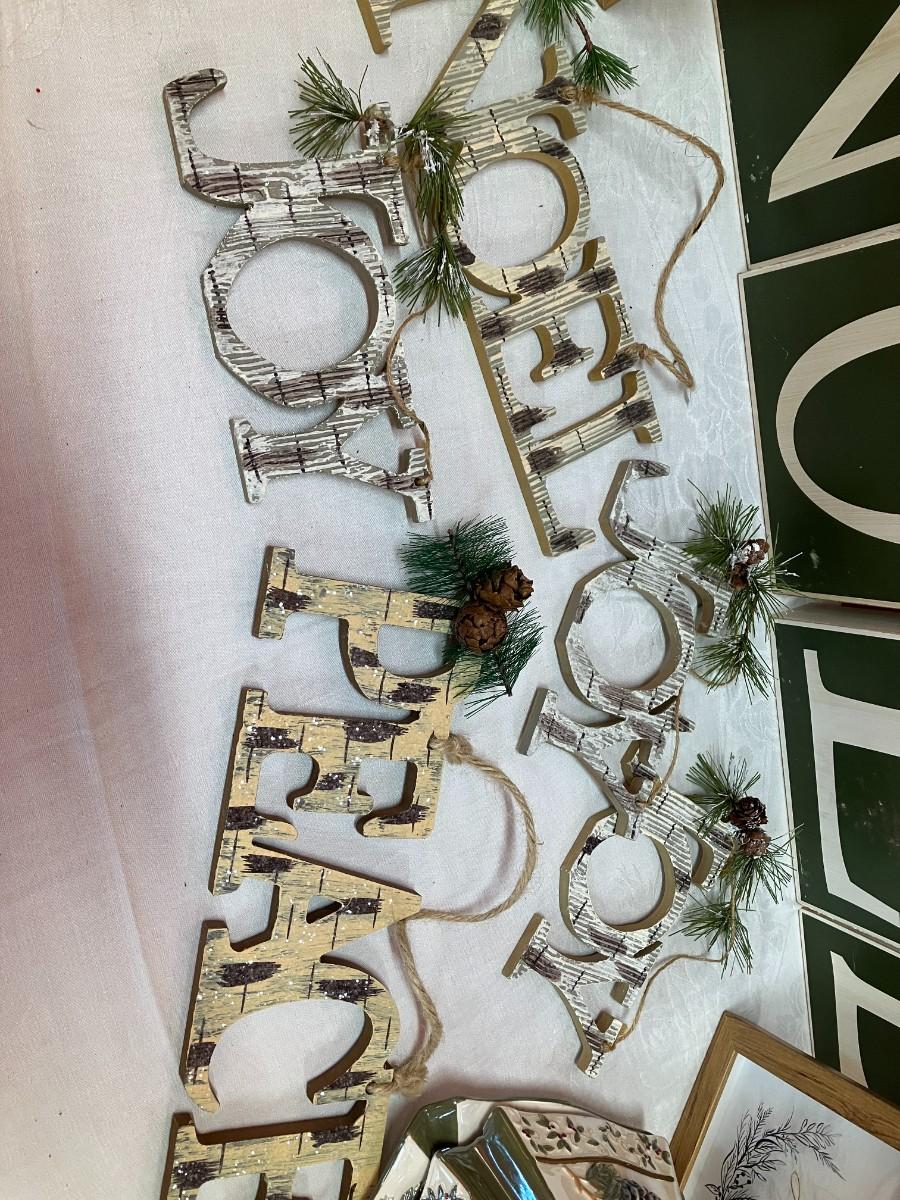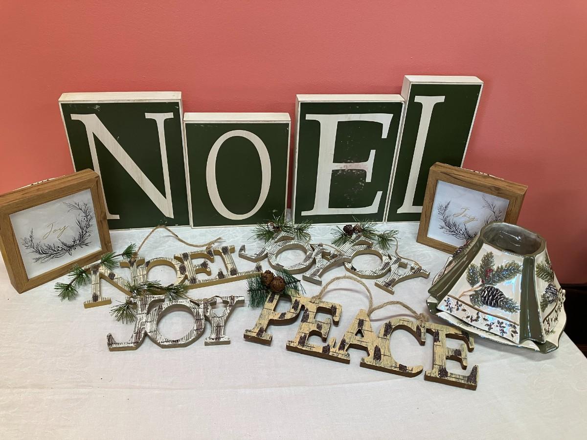 Grouping of pine tree themed holiday decor including: Large NOEL block letters, 5 word hanging decor pieces, 2 small shadow boxes and a Yankee candle plate/topper set