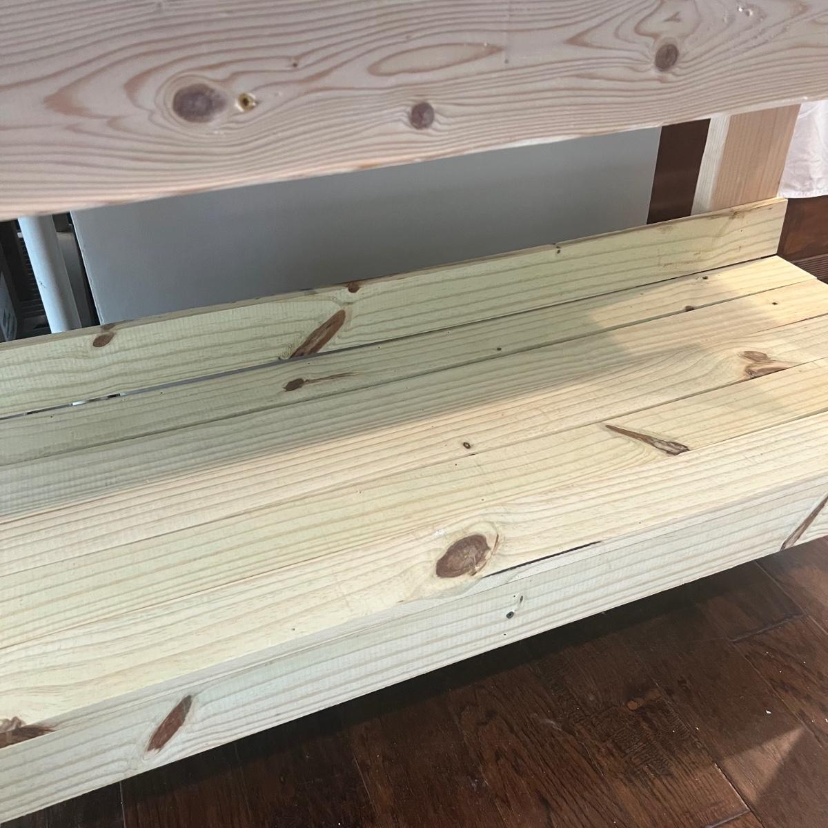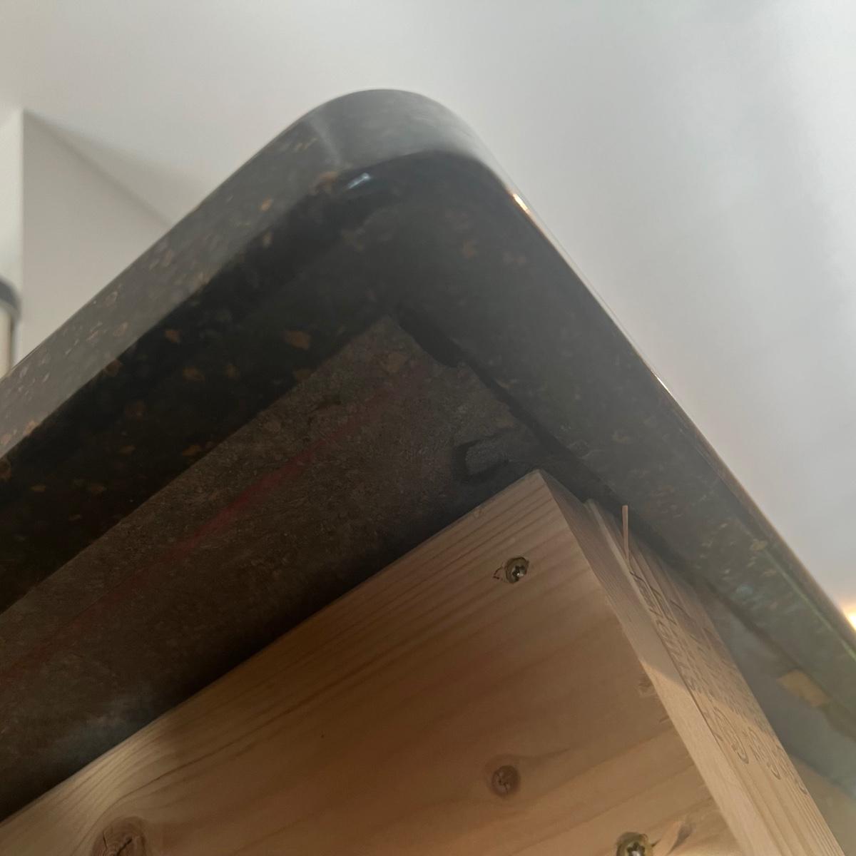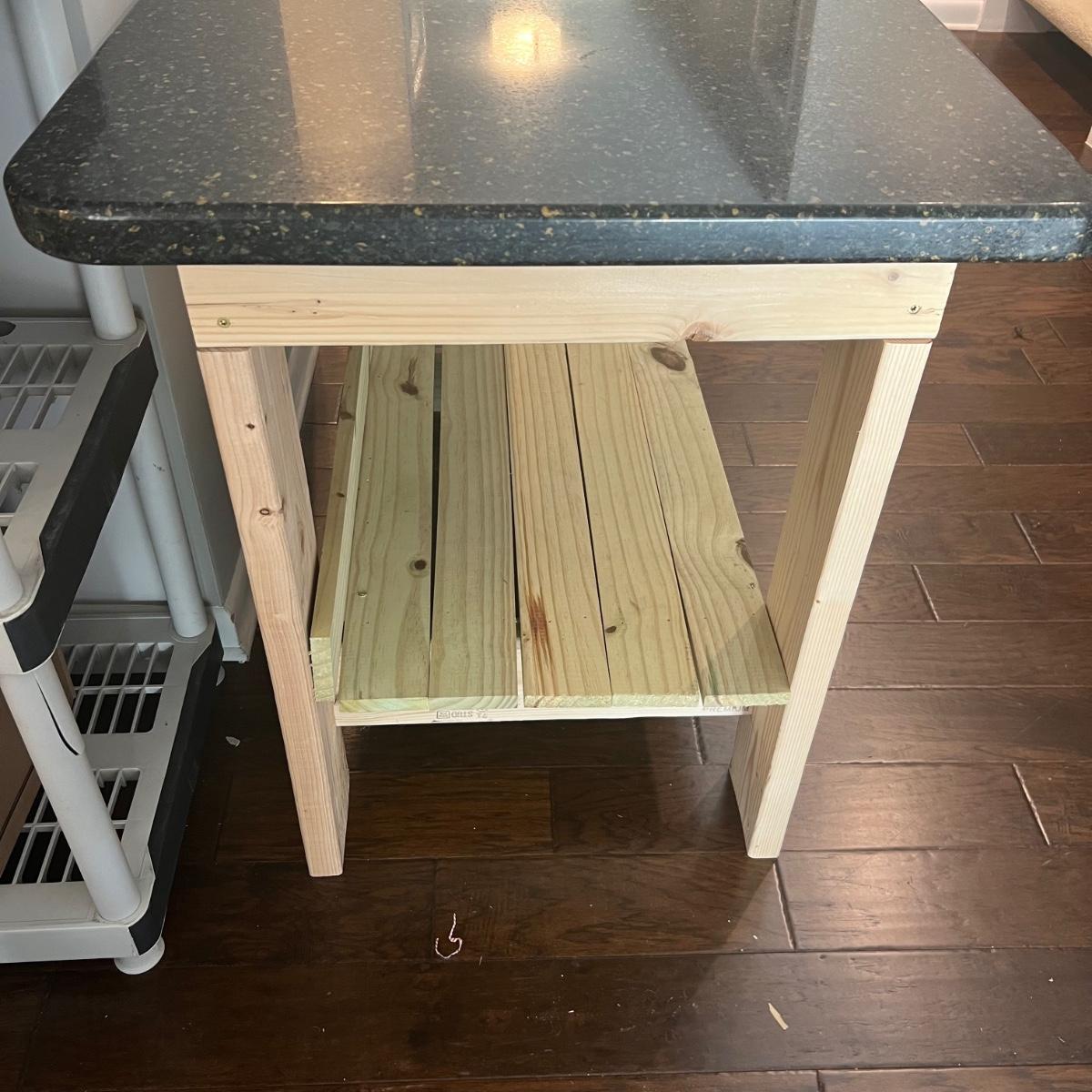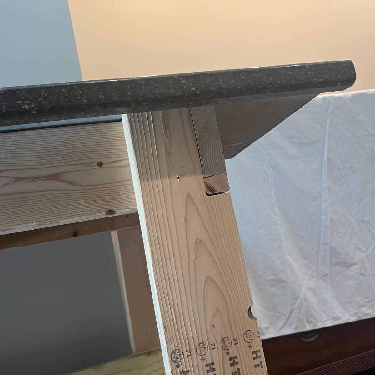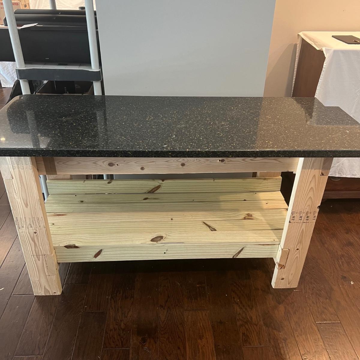 This large sturdy untreated pine work bench has a granite top. Top rests on frame and is not glued down; a 3" x 6" notch has been cut out of the corner, see image.