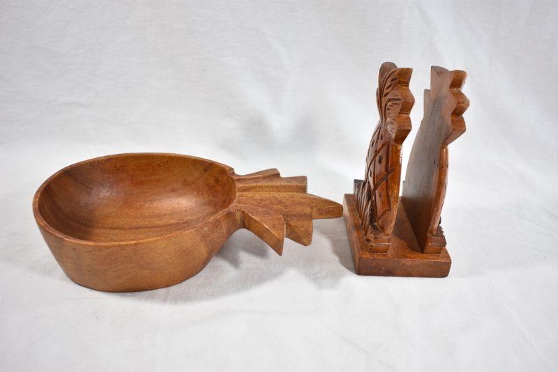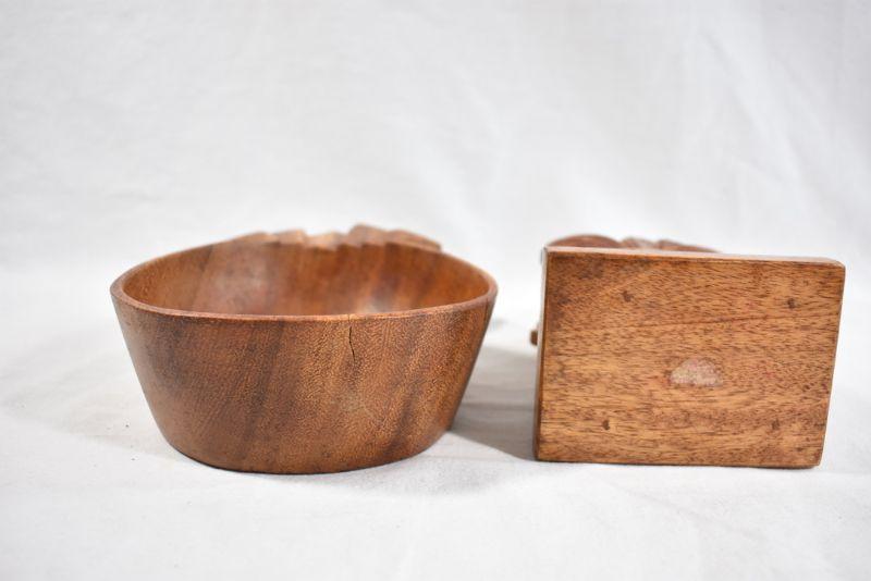 Bowl is marked "Moore International, Honolulu, Monkeypod Wood Bowl - 9.5 x 2.25"; napkin holder is 6.25" high