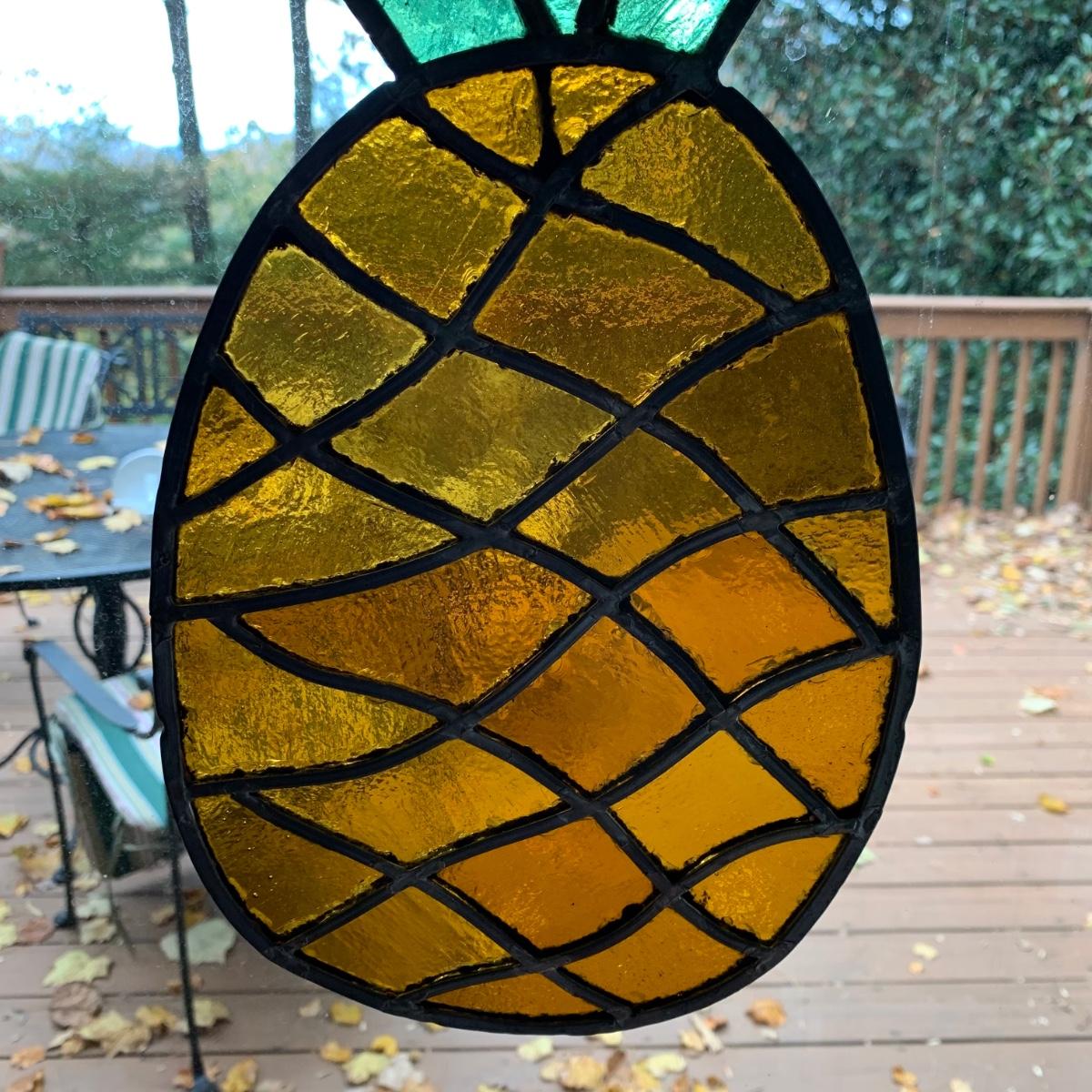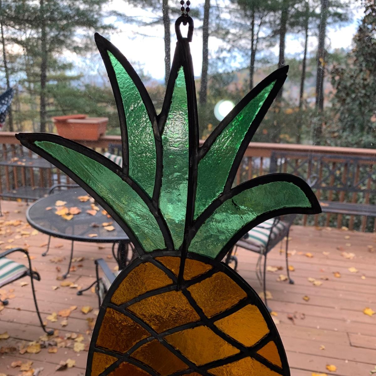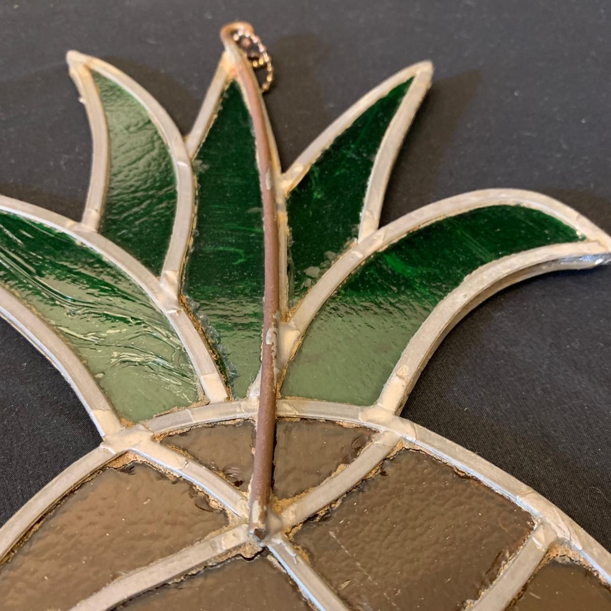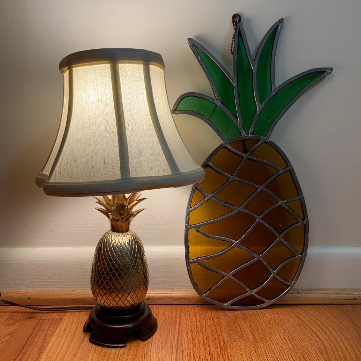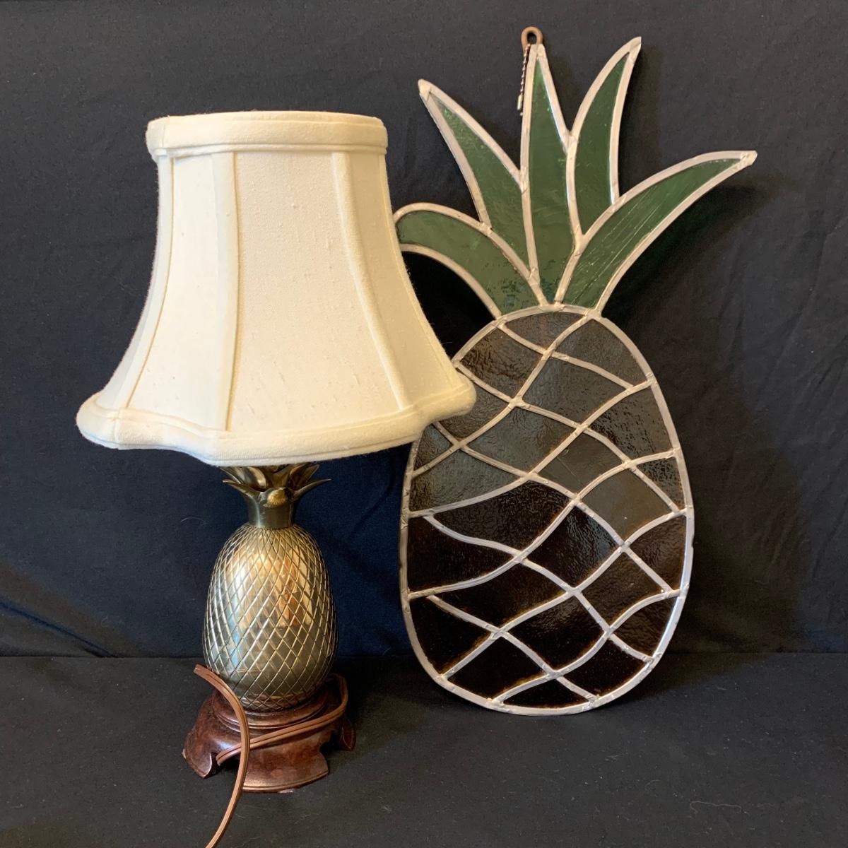 This lot has some fun pineapple decor! There is a pineapple stained glass art and a pineapple lamp. The stained glass measures approximately 8” x 17.5”. The pineapple lamp has a wood base. The pineapple itself is metal. It has an in-line switch. Lamp turned on when tested.