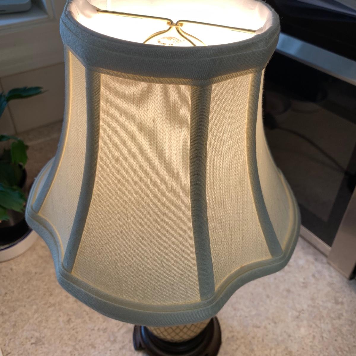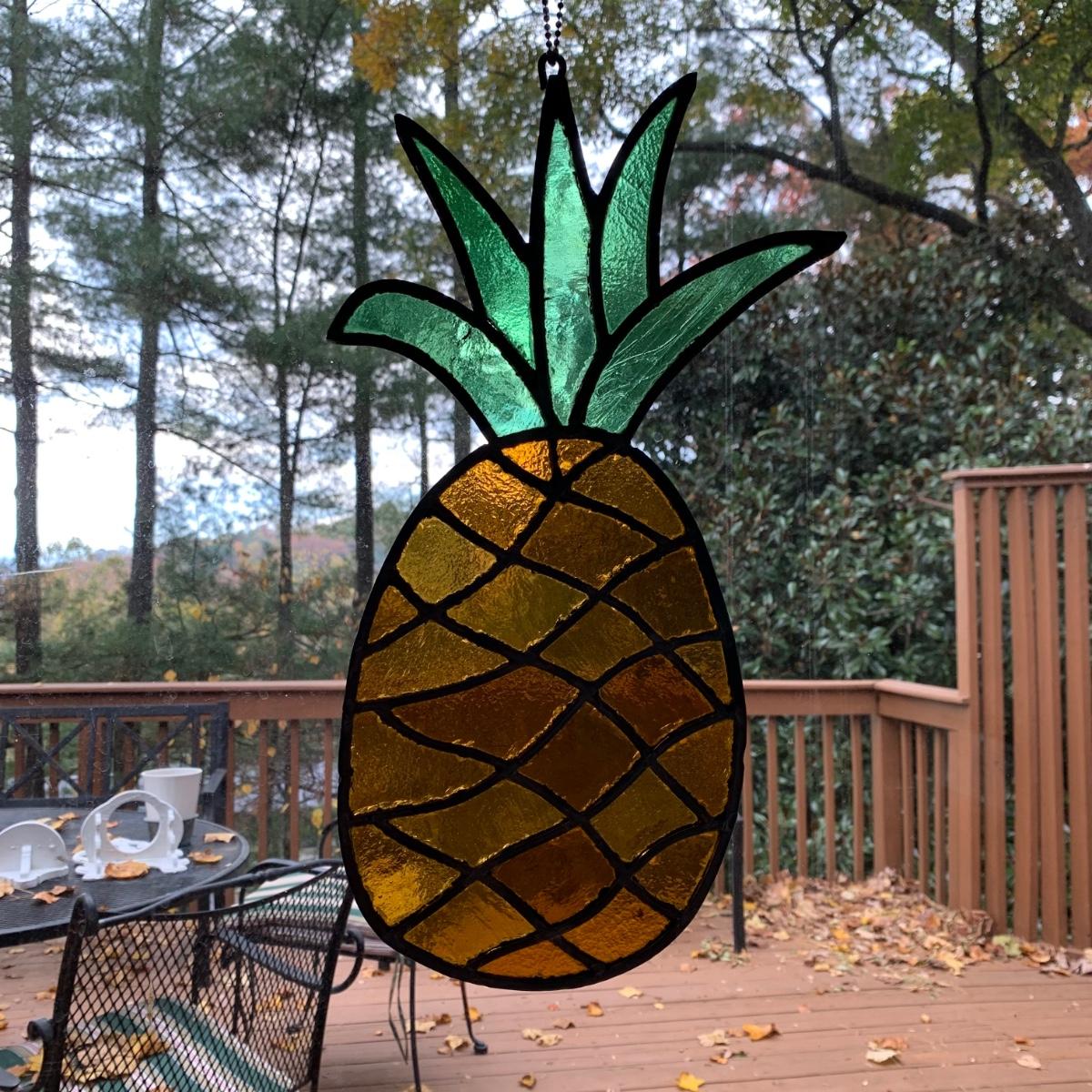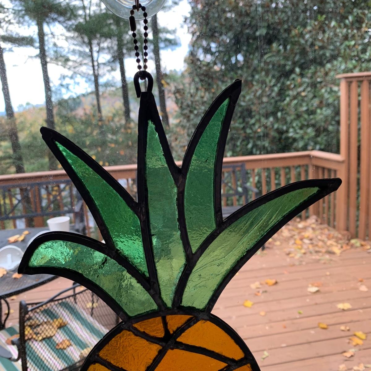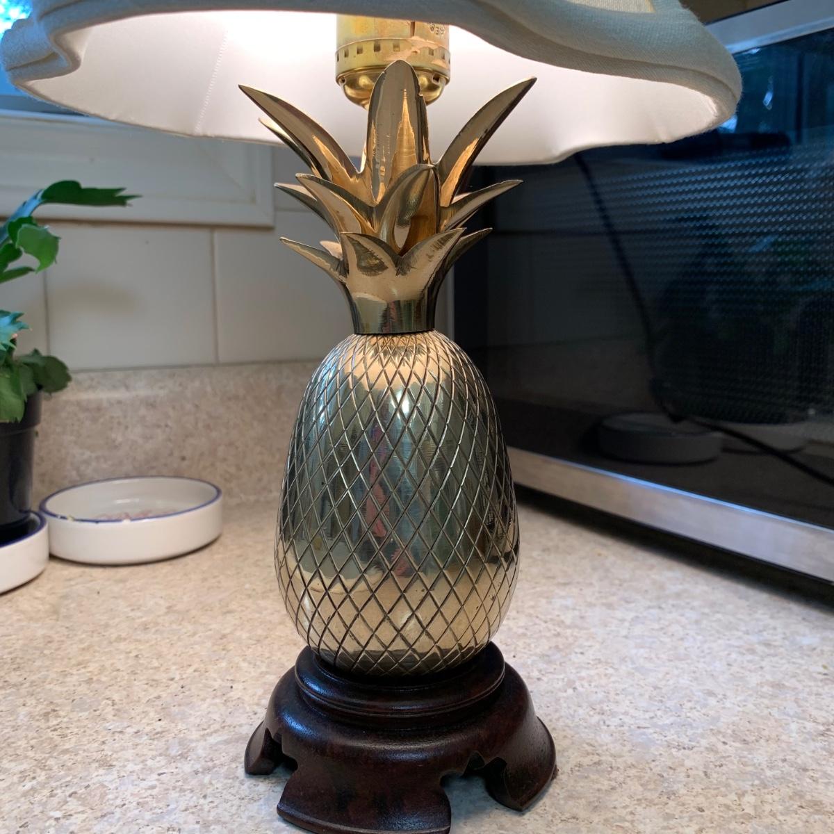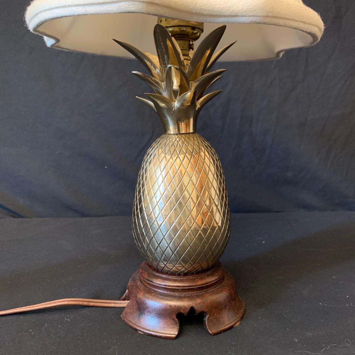 This lot has some fun pineapple decor! There is a pineapple stained glass art and a pineapple lamp. The stained glass measures approximately 8” x 17.5”. The pineapple lamp has a wood base. The pineapple itself is metal. It has an in-line switch. Lamp turned on when tested.