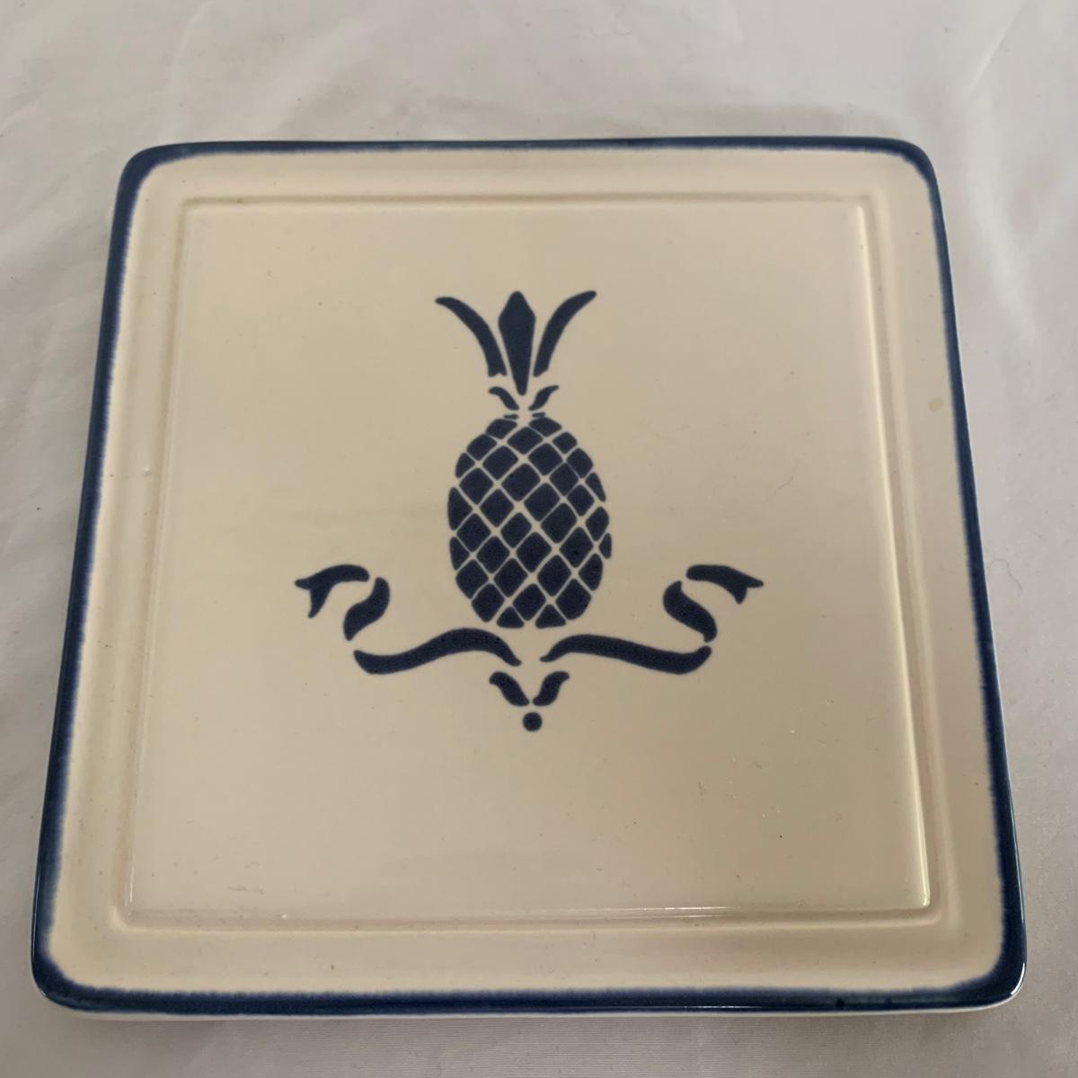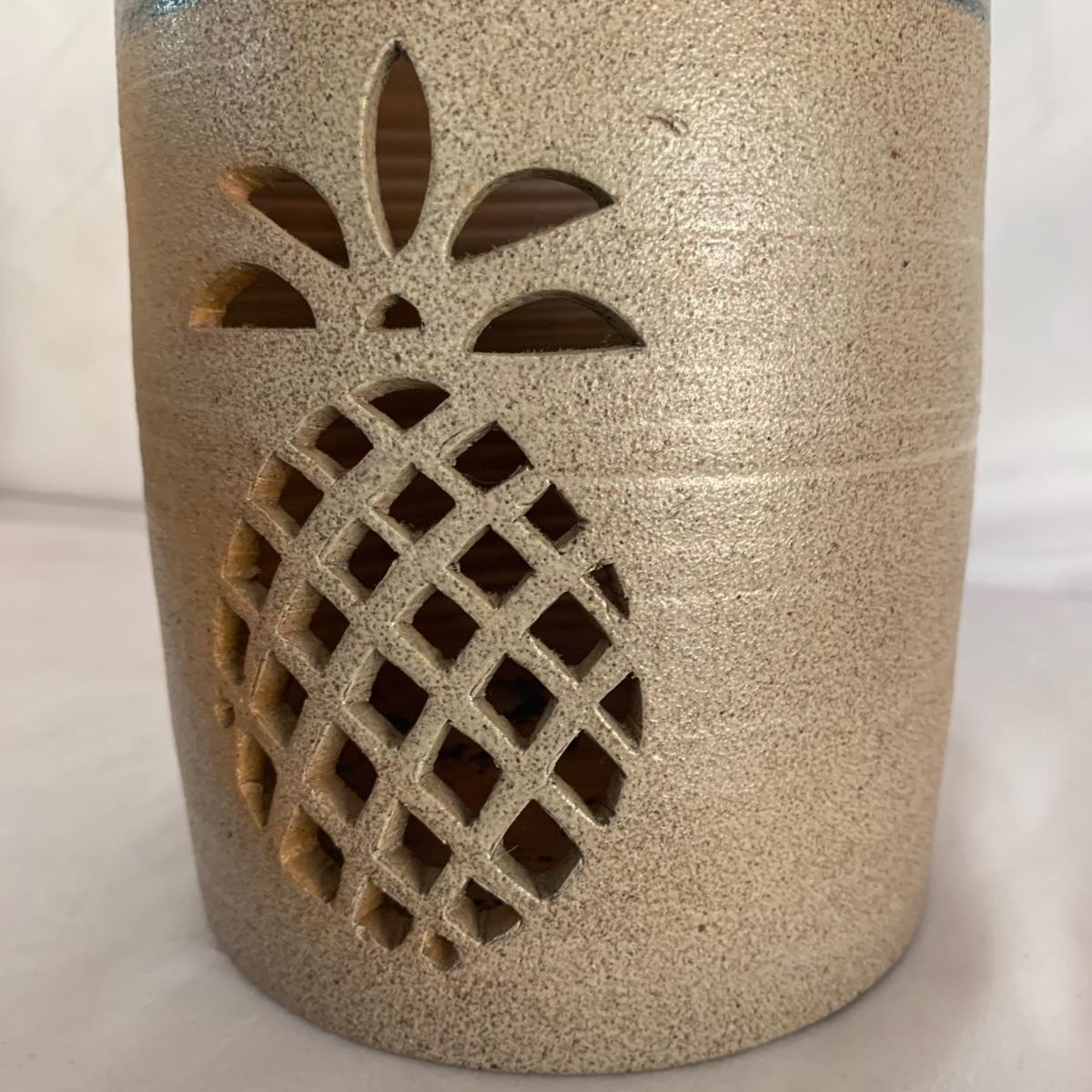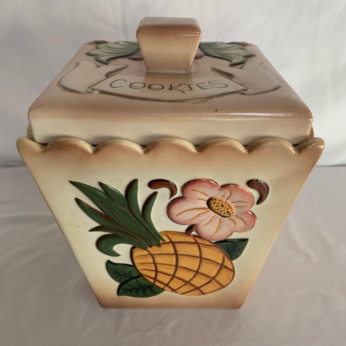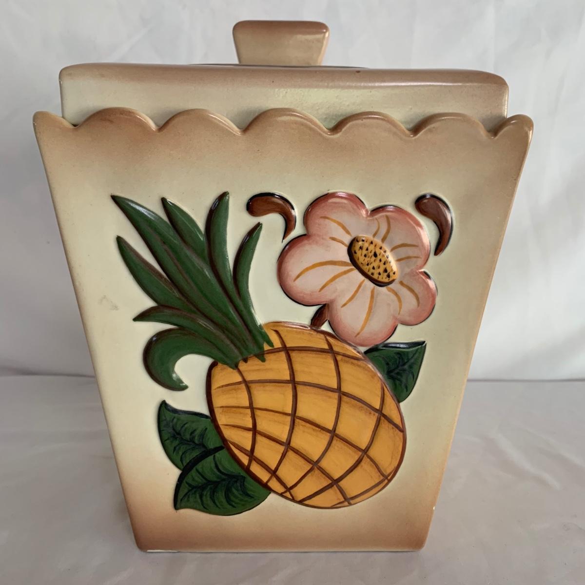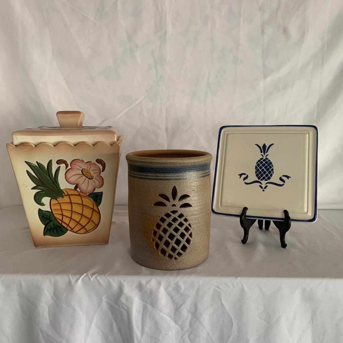 Three ceramic items with pineapple motifs. One is a signed pottery canister that is 5.5”d x 7”h. The signature reads “Keaton 1986”. The cookie jar is signed “Lois Collins 1964”. The blue and white trivet is by Pfaltzgraff. All three items are in good condition.