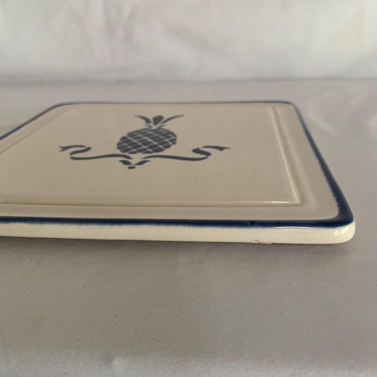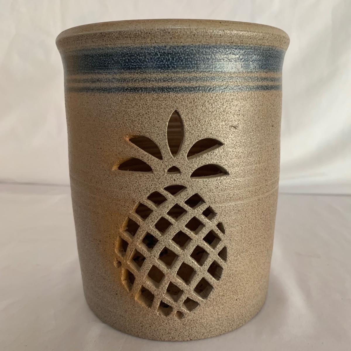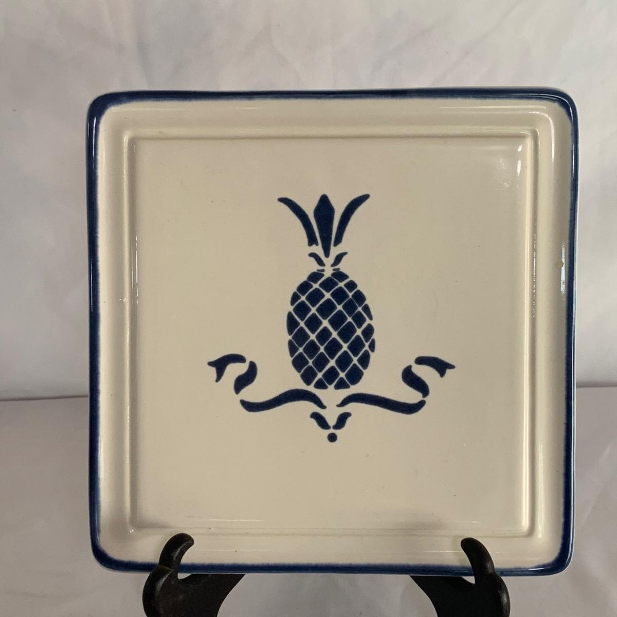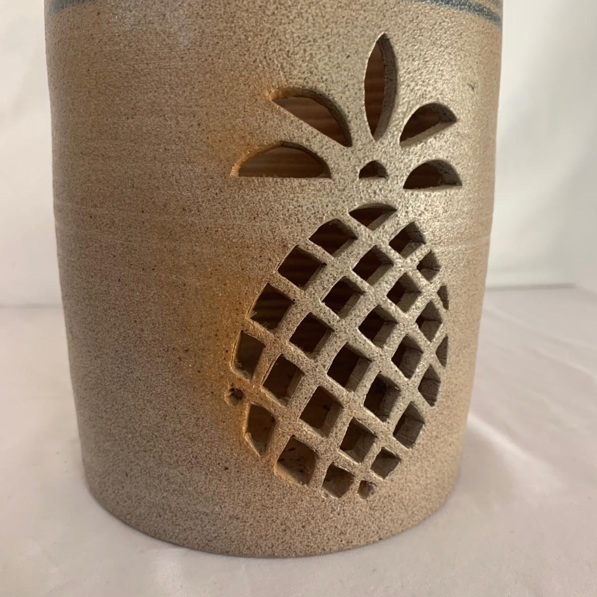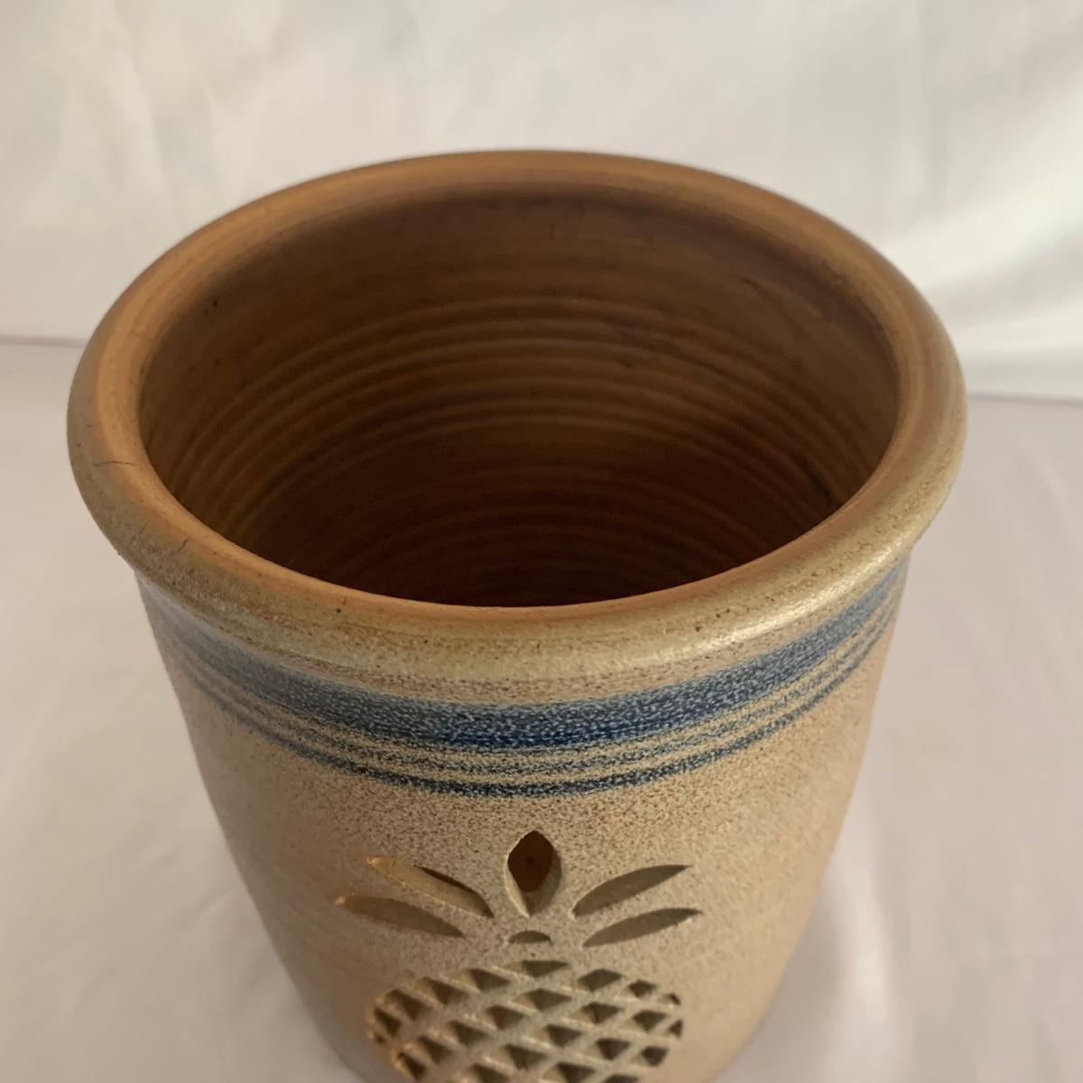 Three ceramic items with pineapple motifs. One is a signed pottery canister that is 5.5”d x 7”h. The signature reads “Keaton 1986”. The cookie jar is signed “Lois Collins 1964”. The blue and white trivet is by Pfaltzgraff. All three items are in good condition.