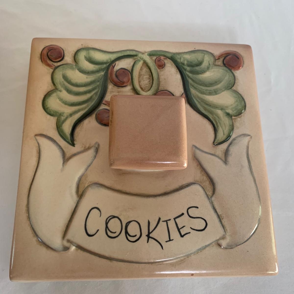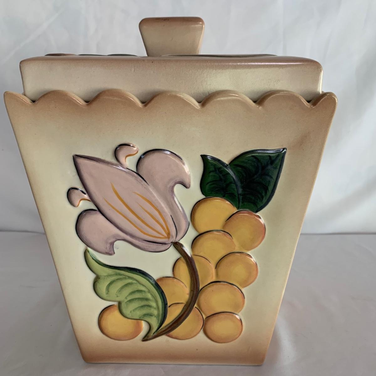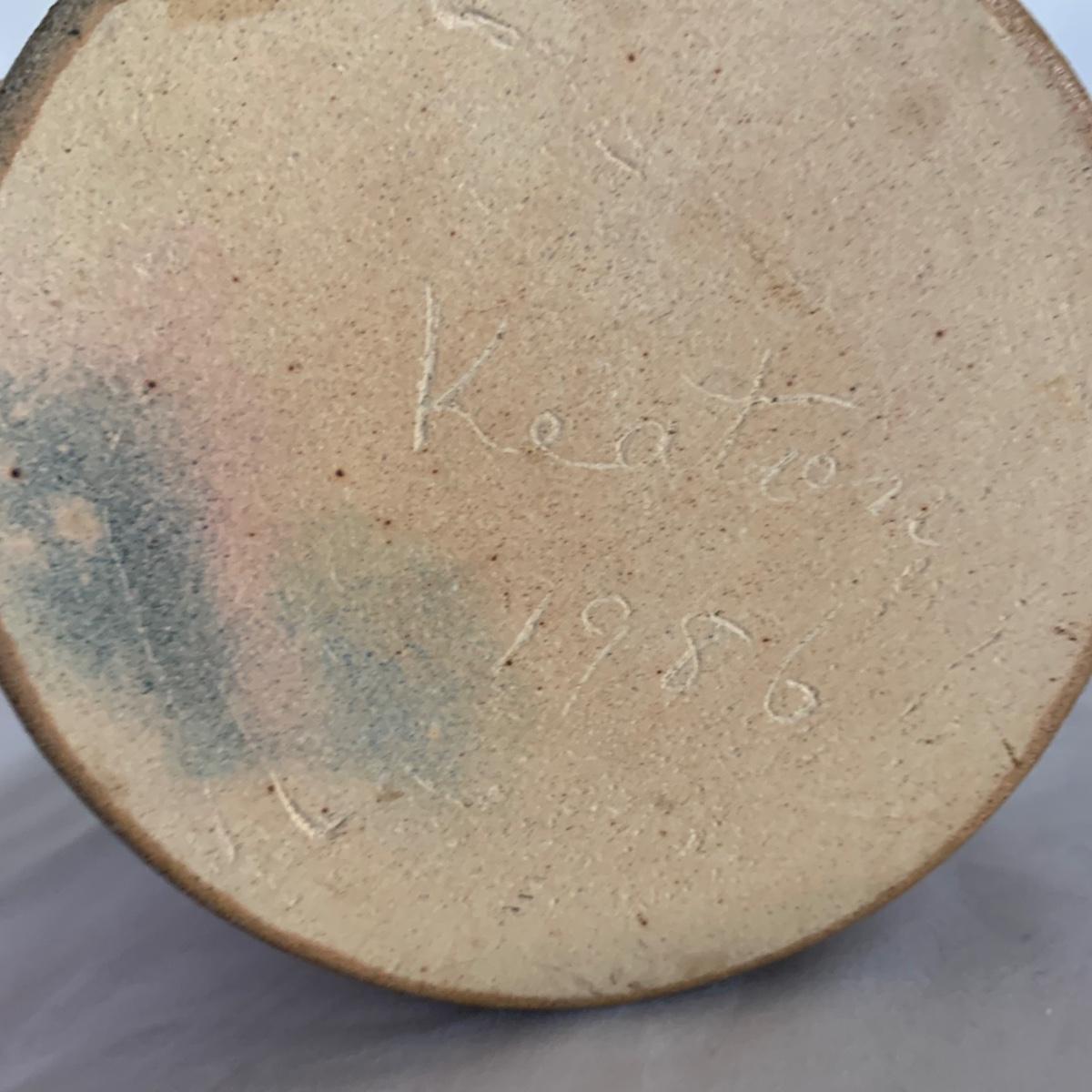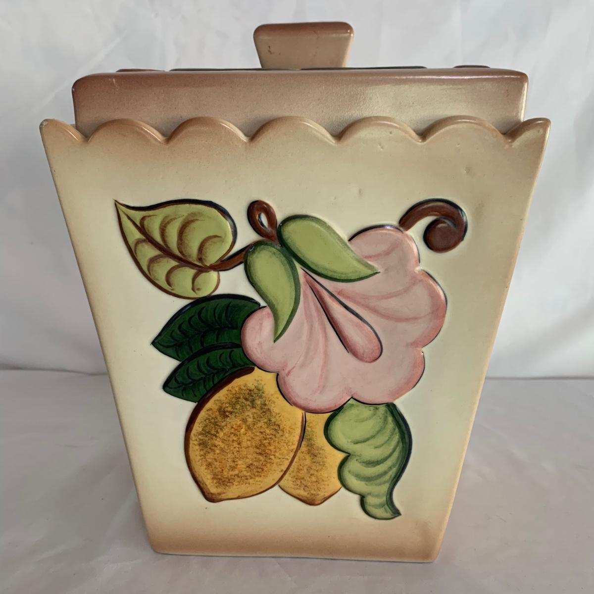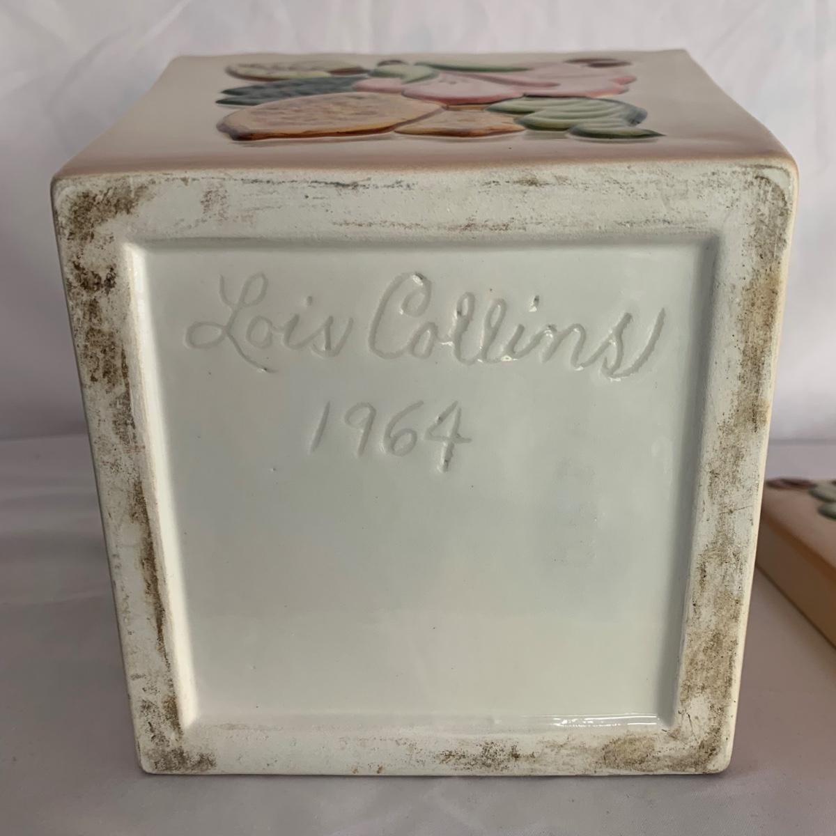 Three ceramic items with pineapple motifs. One is a signed pottery canister that is 5.5”d x 7”h. The signature reads “Keaton 1986”. The cookie jar is signed “Lois Collins 1964”. The blue and white trivet is by Pfaltzgraff. All three items are in good condition.