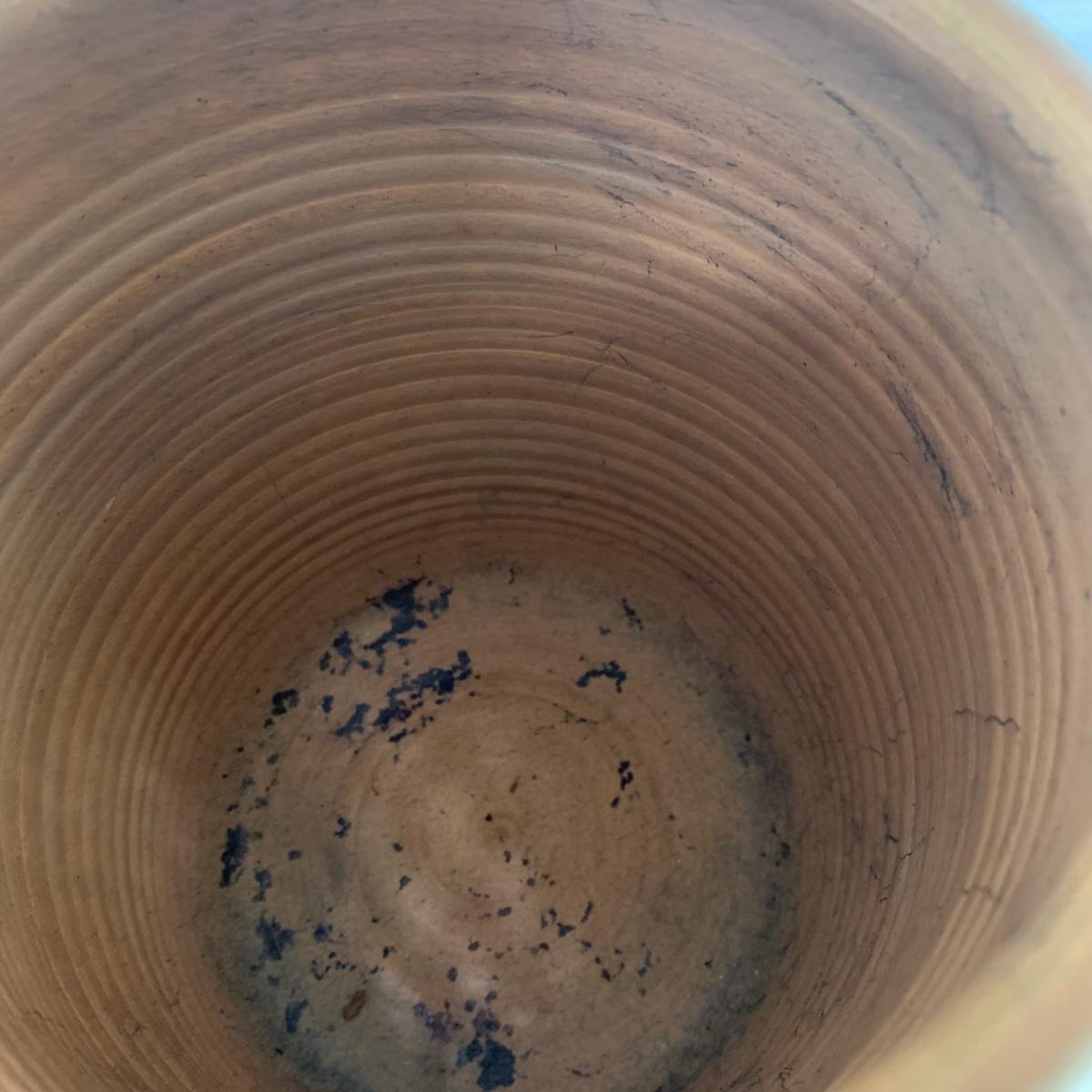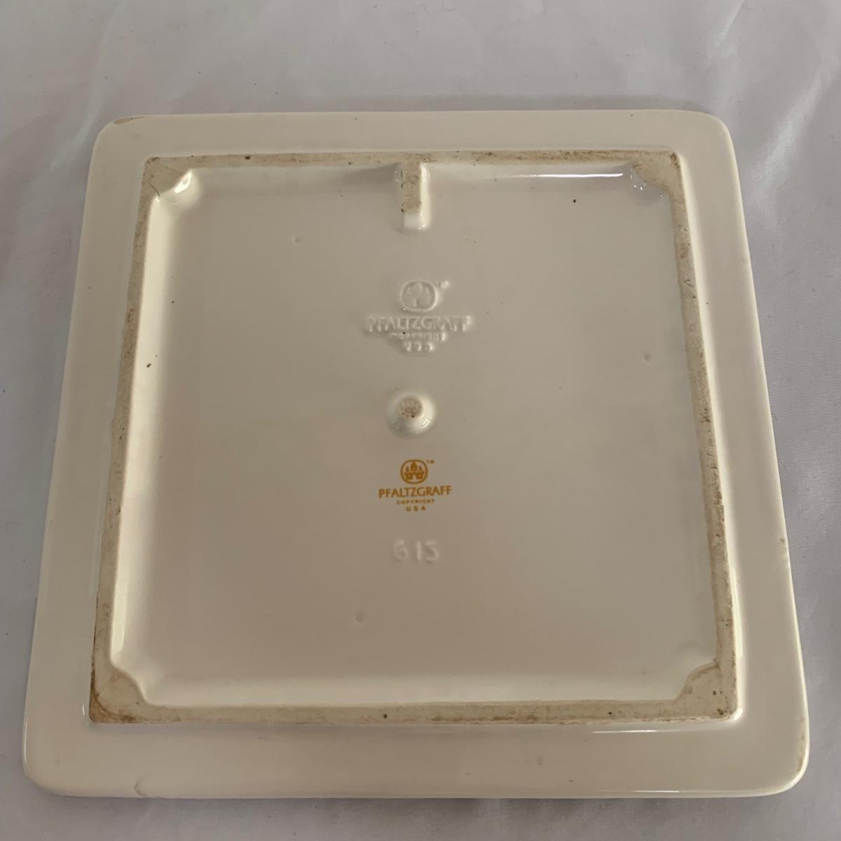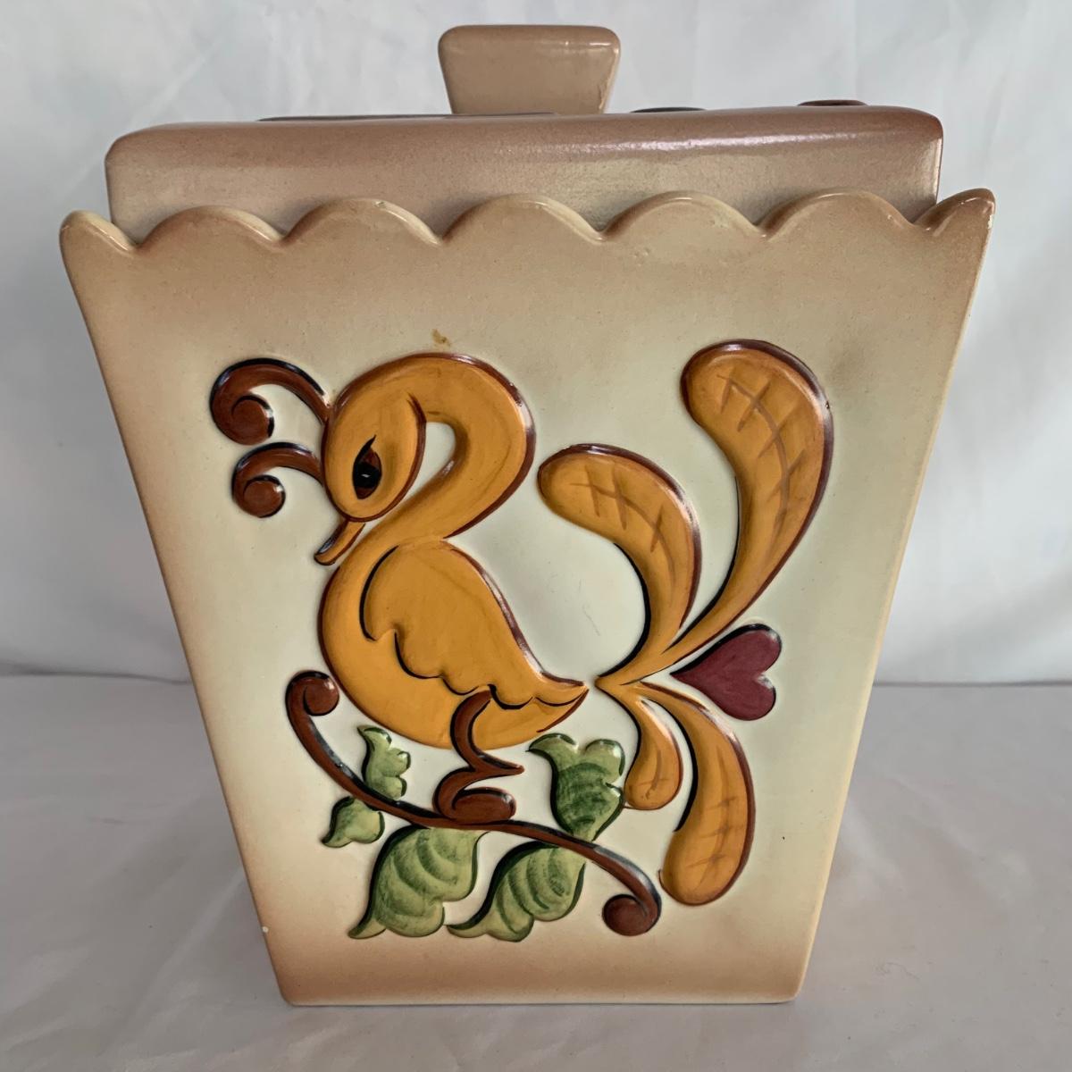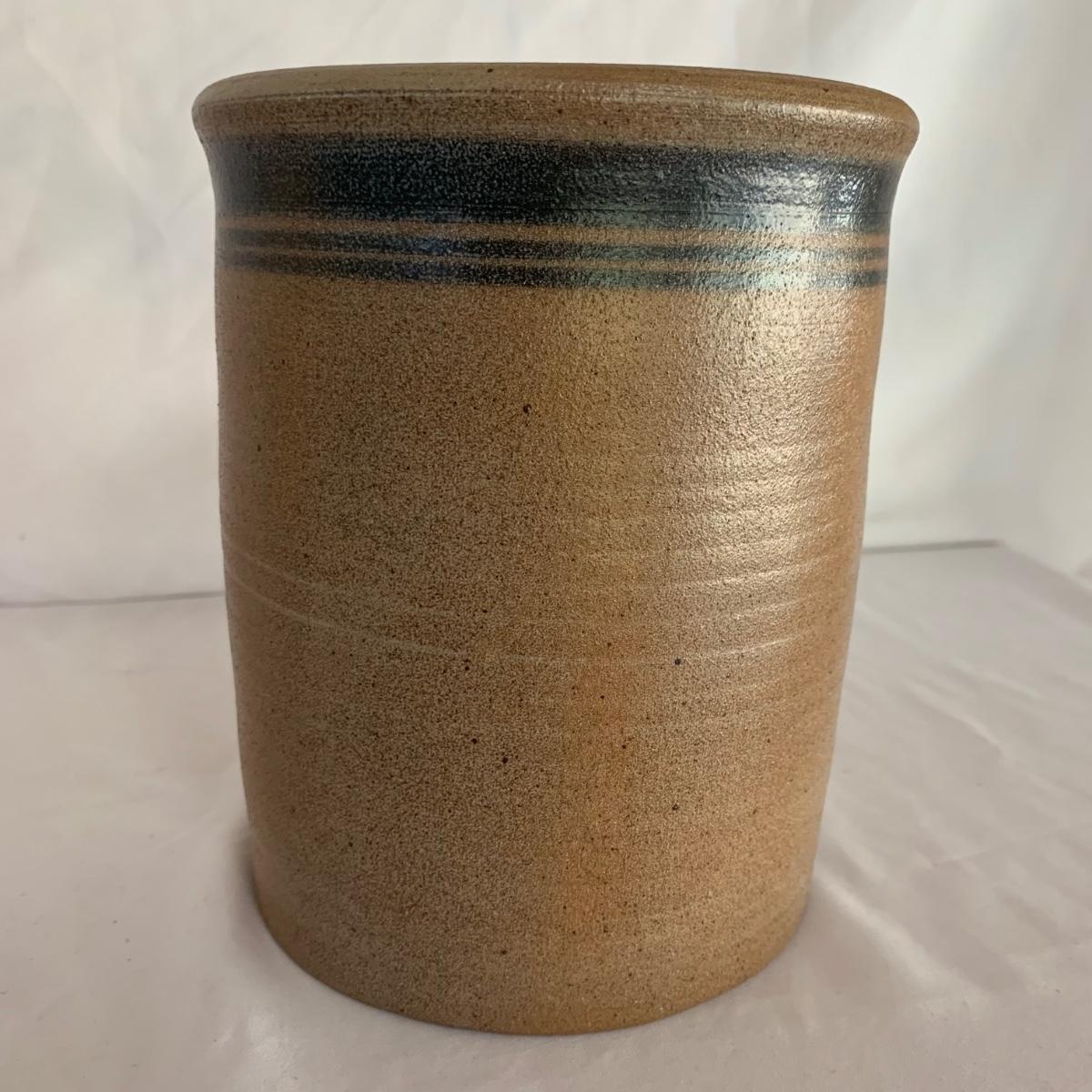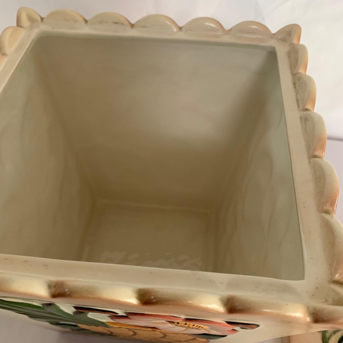 Three ceramic items with pineapple motifs. One is a signed pottery canister that is 5.5”d x 7”h. The signature reads “Keaton 1986”. The cookie jar is signed “Lois Collins 1964”. The blue and white trivet is by Pfaltzgraff. All three items are in good condition.