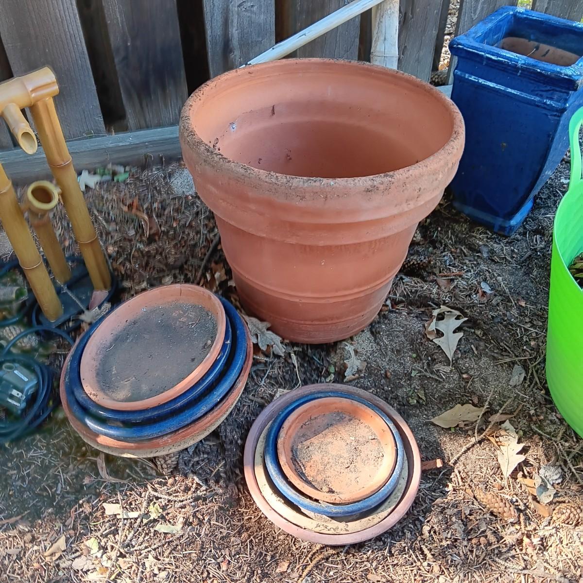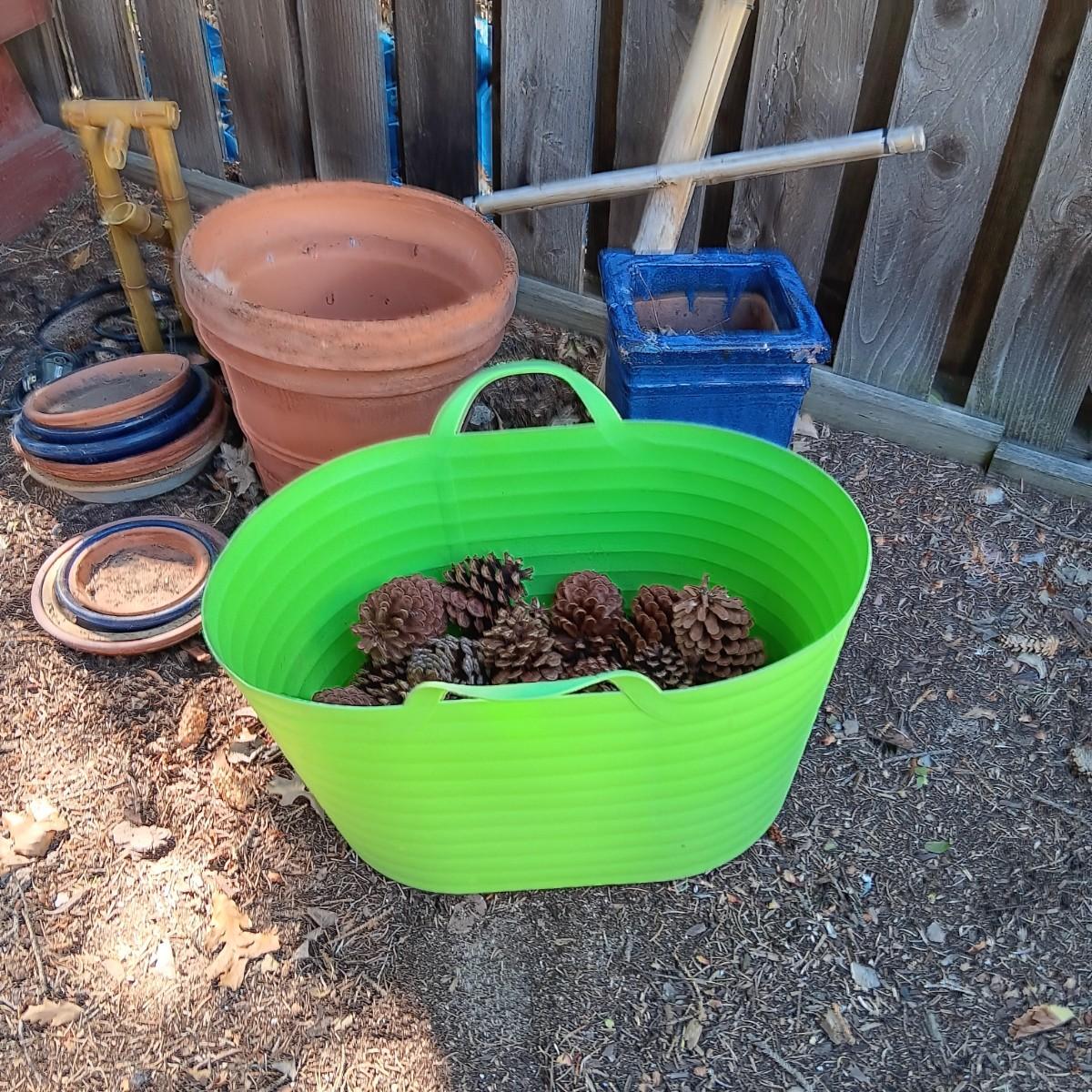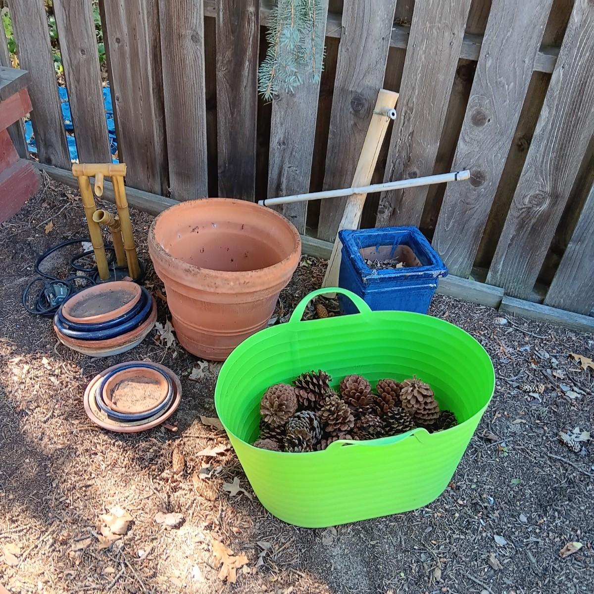 PINECONES, CLAY FLOWER POTS, WATER FOUNTAIN TOPS AND MANY POT SAUCERS