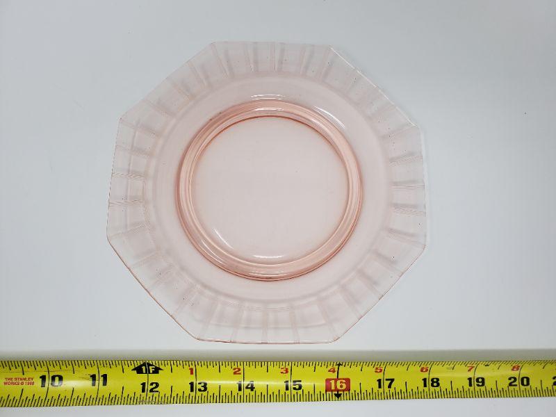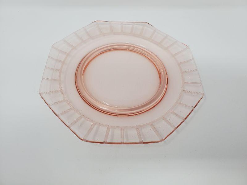 Pretty little pink glass plate, decorative etching around the rim. Good condition but has been used.