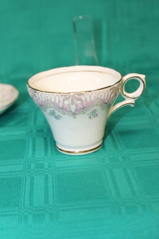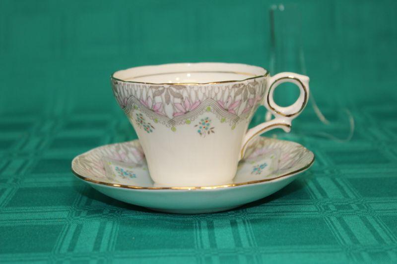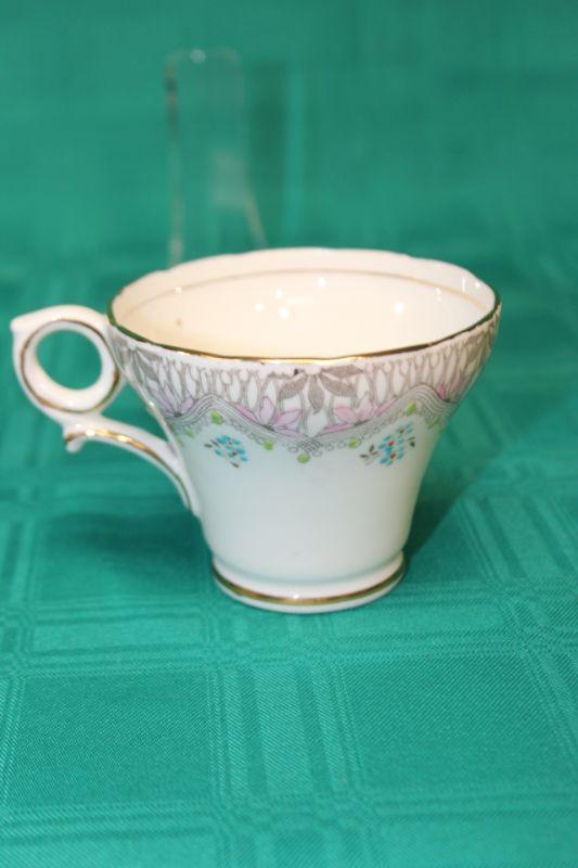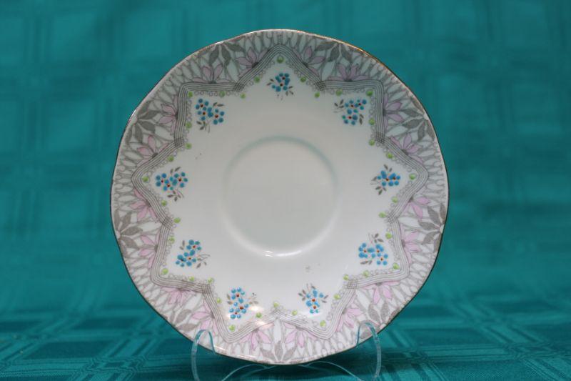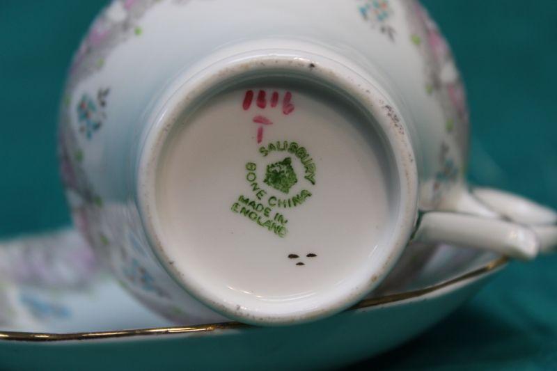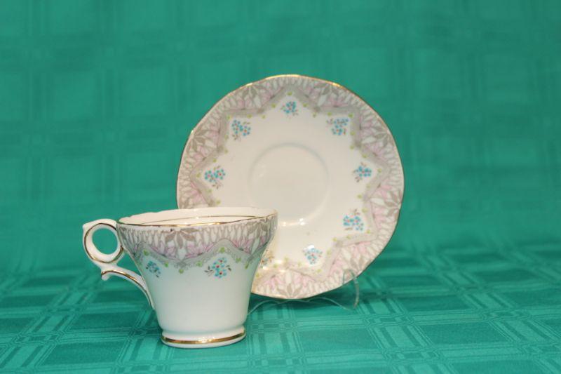 Pale pink with bright blue floral pattern tea cup and saucer. Gold details. Salisbury Fine China, Made in England. No Chips.