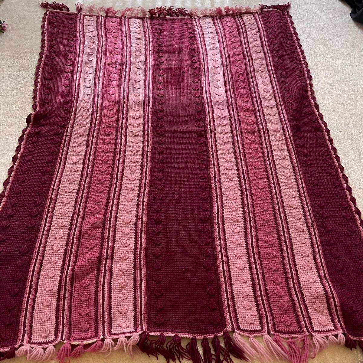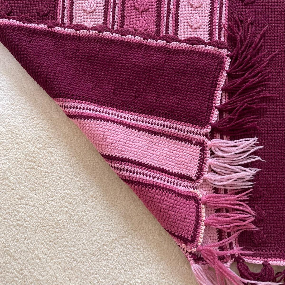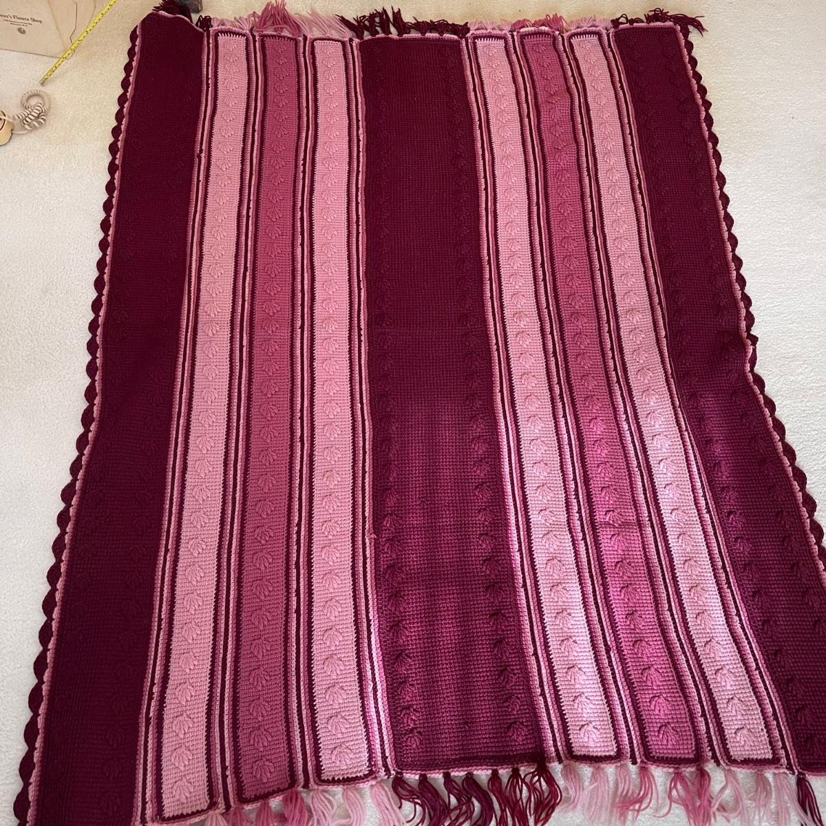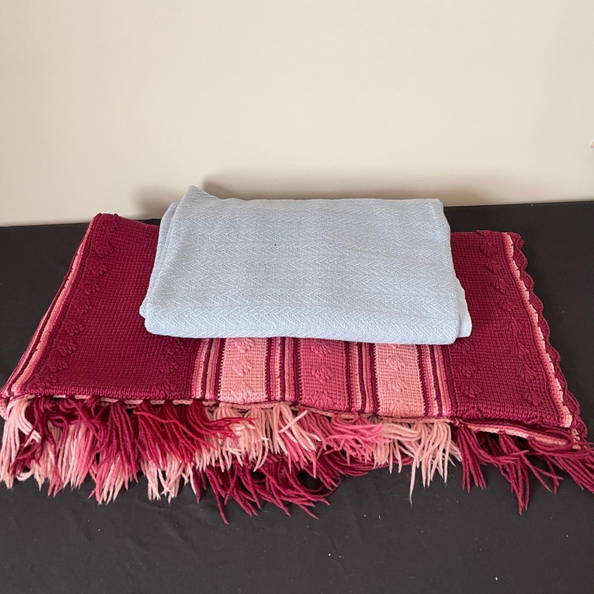 This pair of throw blankets consists of one handmade blanket with different shades of pink and a thinner solid colored light blue blanket. The pink afghan is smaller than the blue blanket, which is a standard size throw.