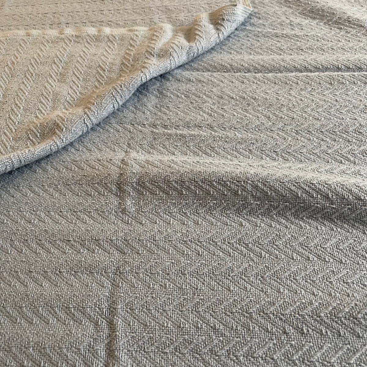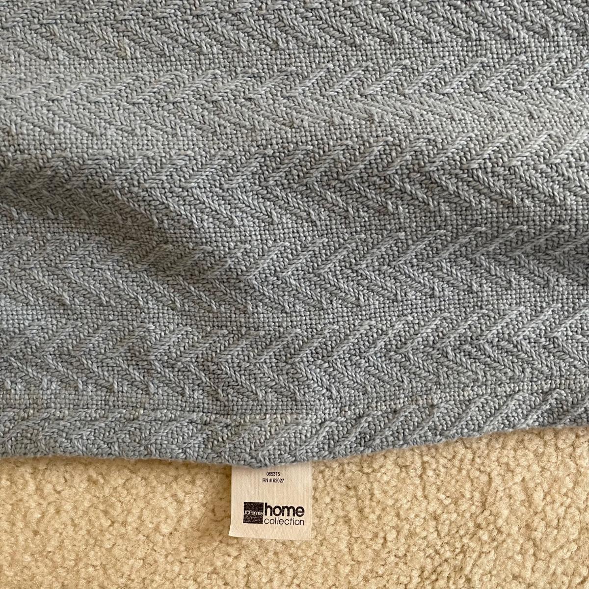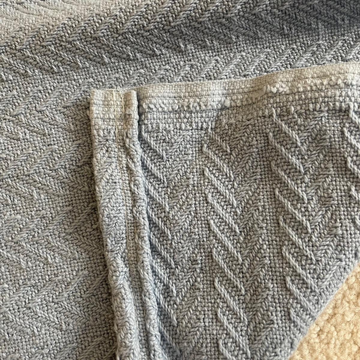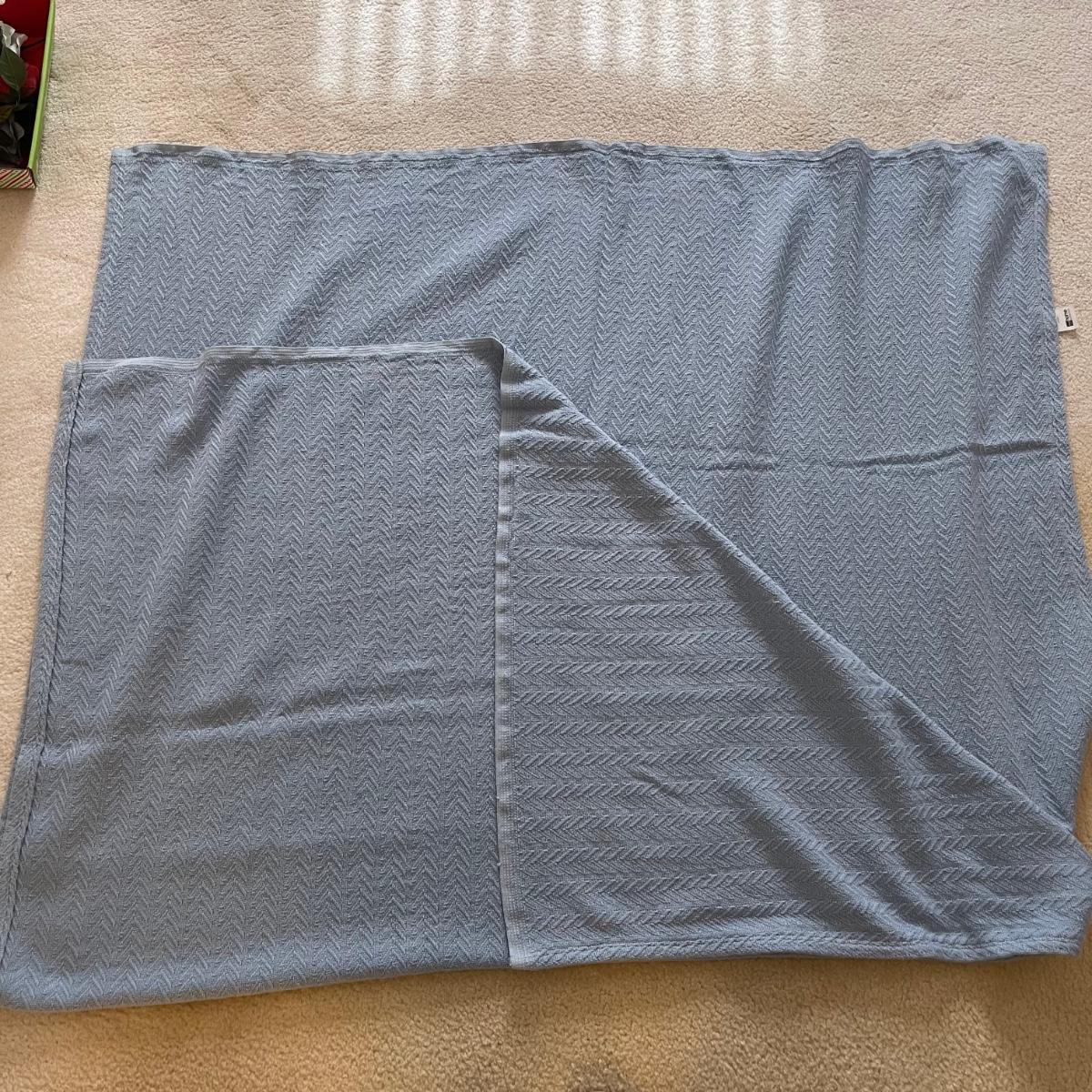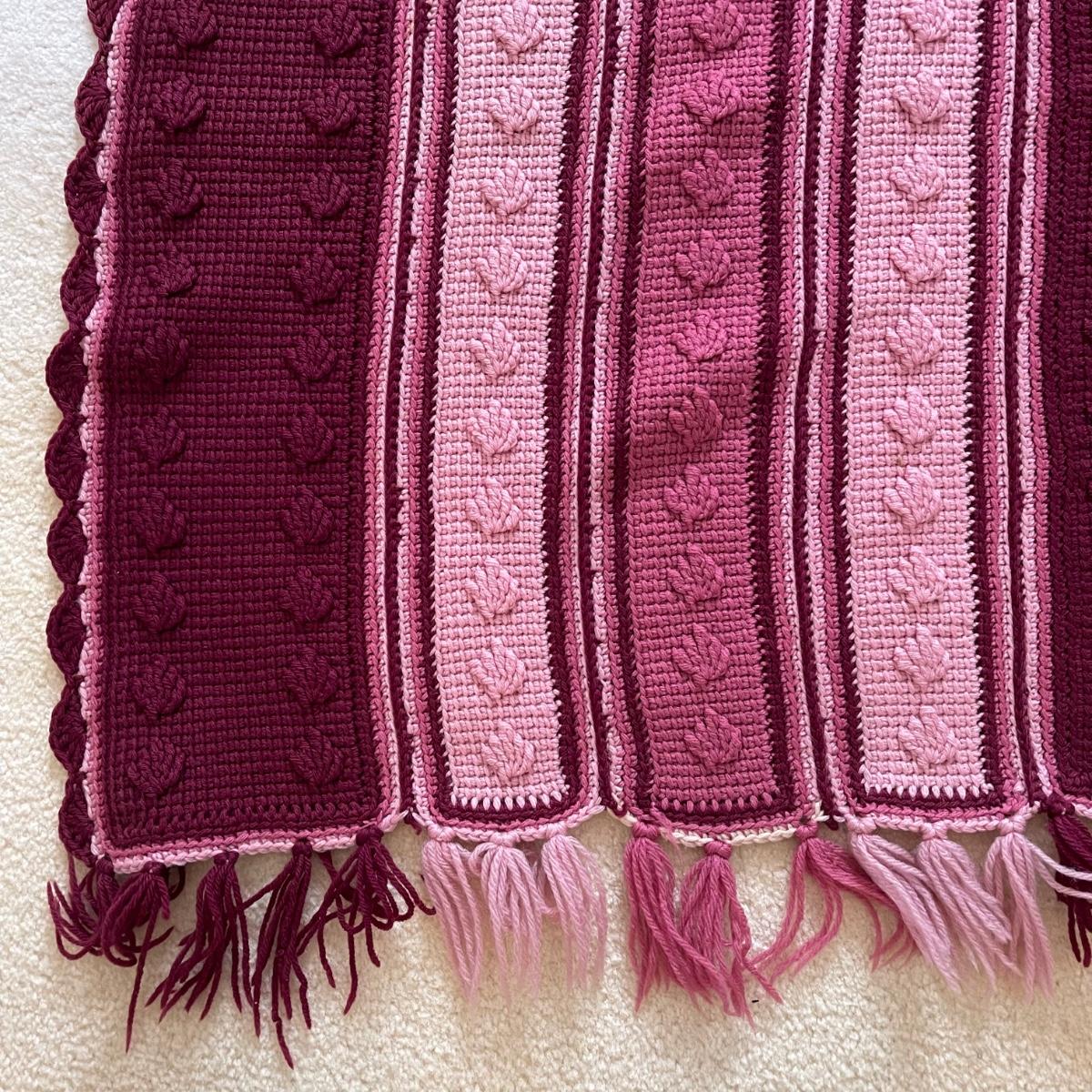 This pair of throw blankets consists of one handmade blanket with different shades of pink and a thinner solid colored light blue blanket. The pink afghan is smaller than the blue blanket, which is a standard size throw.