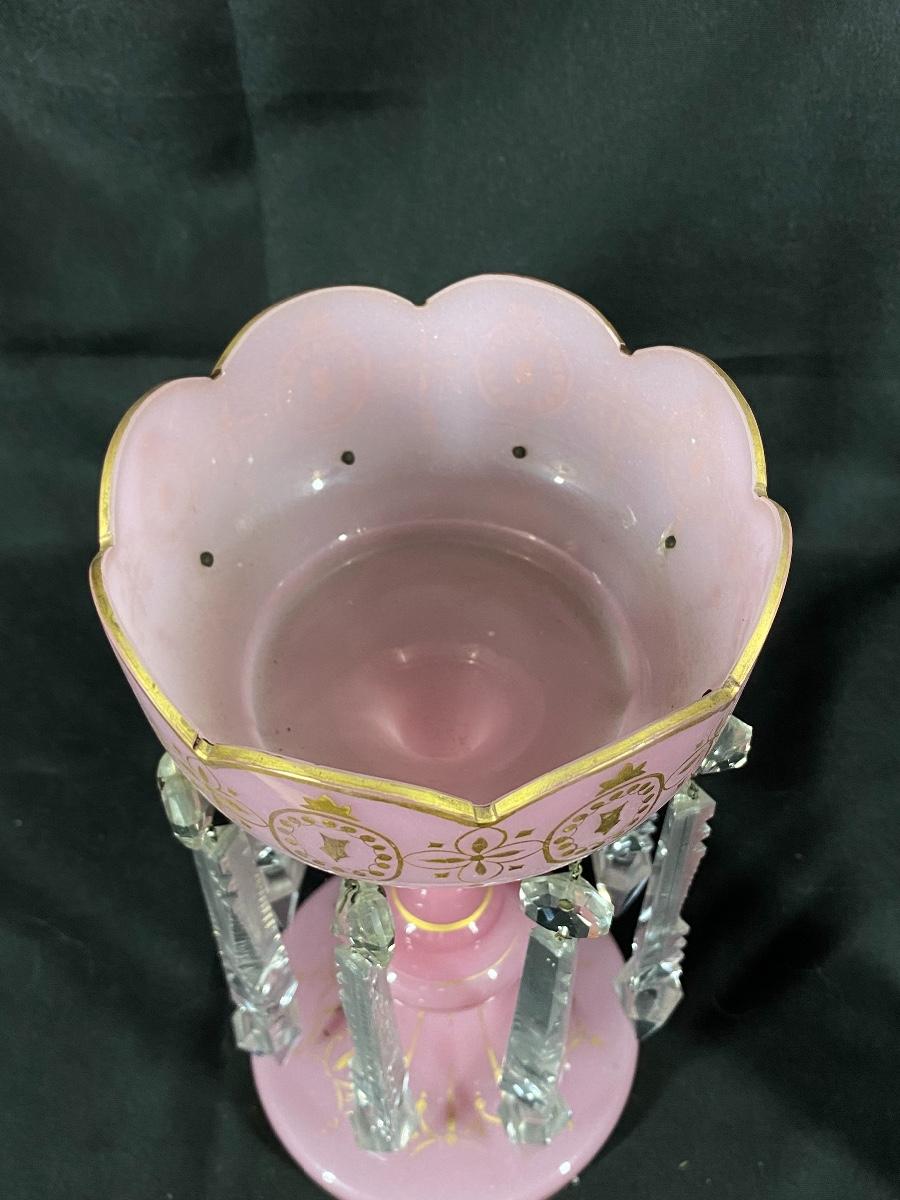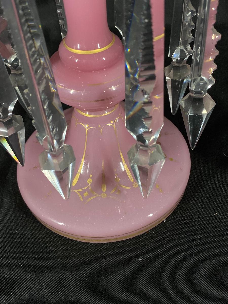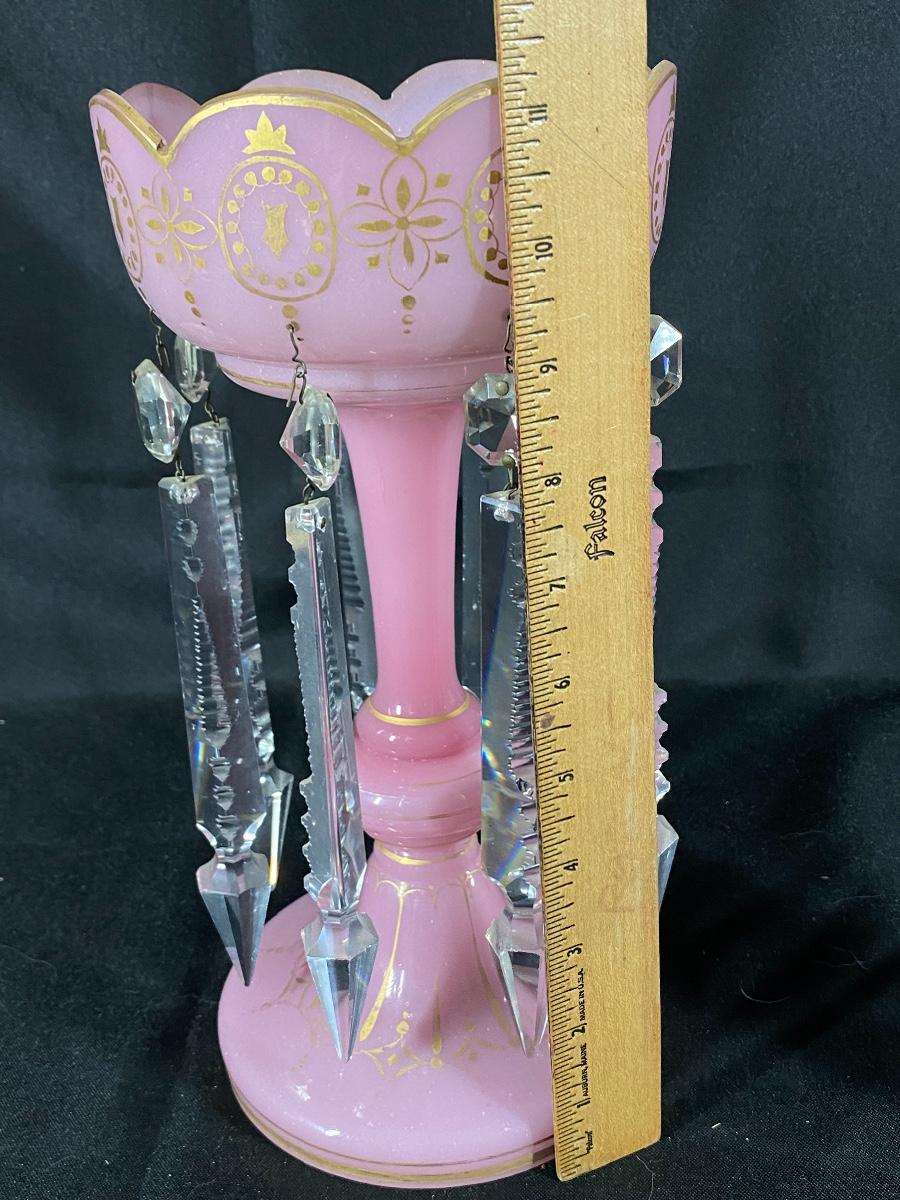Pink bohemian style mantle lustre. About 11" tall with 7" crystals. Excellent condition overall. The gold paint exhibits wear in most places; see pictures