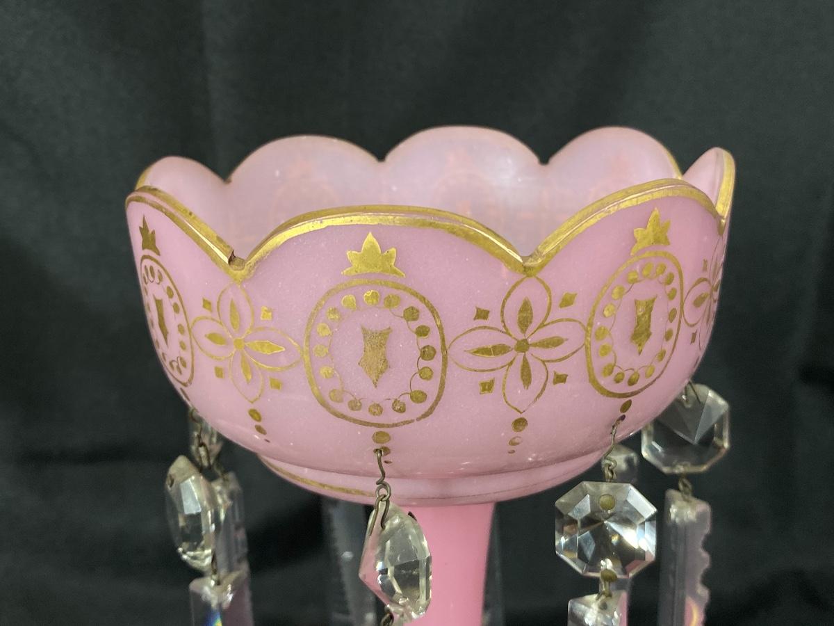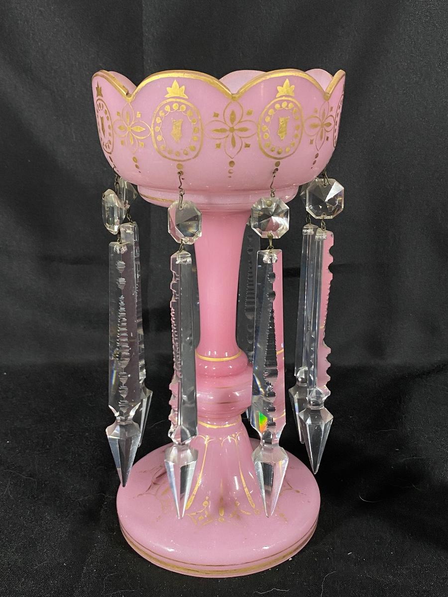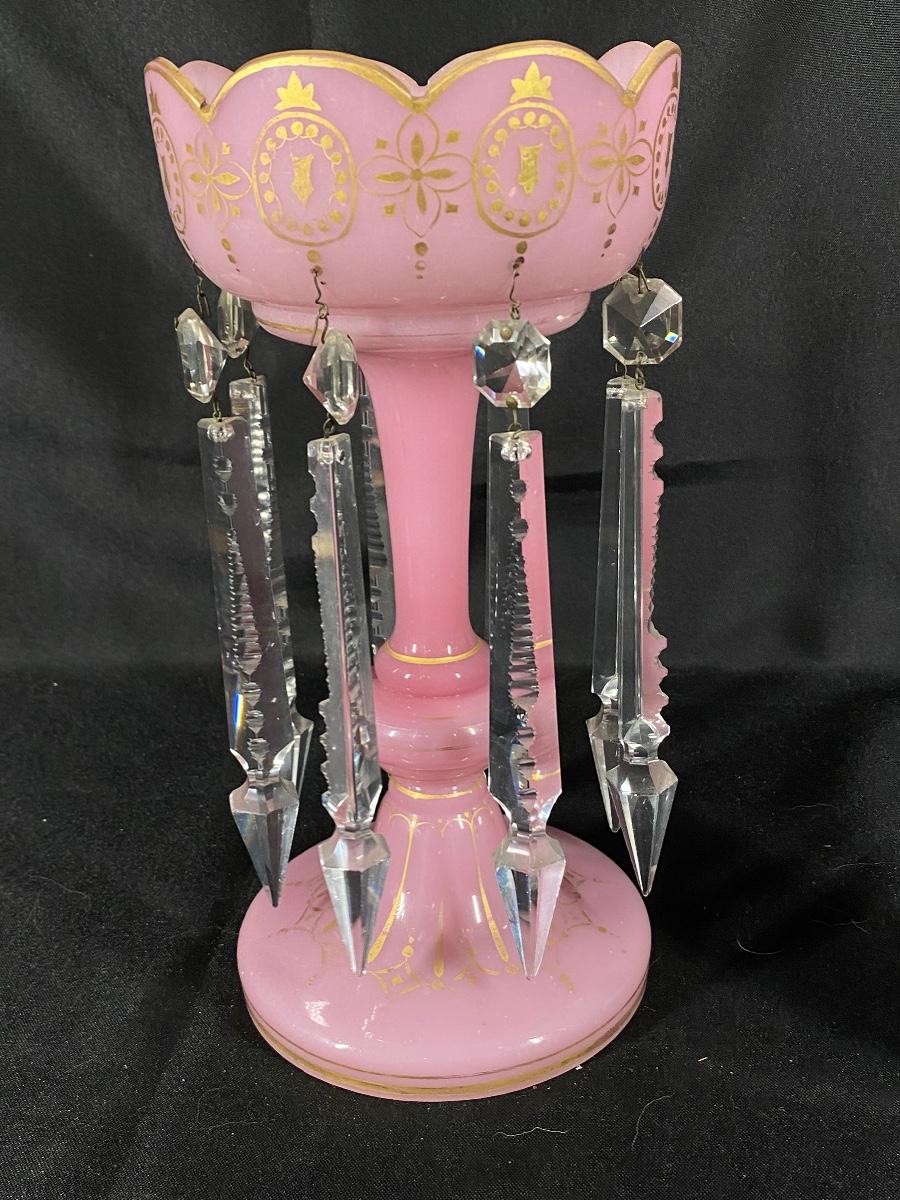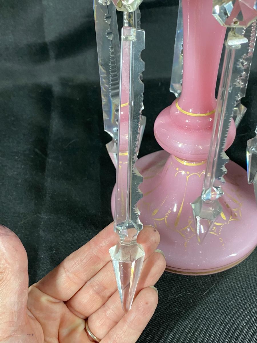 Pink bohemian style mantle lustre. About 11" tall with 7" crystals. Excellent condition overall. The gold paint exhibits wear in most places; see pictures