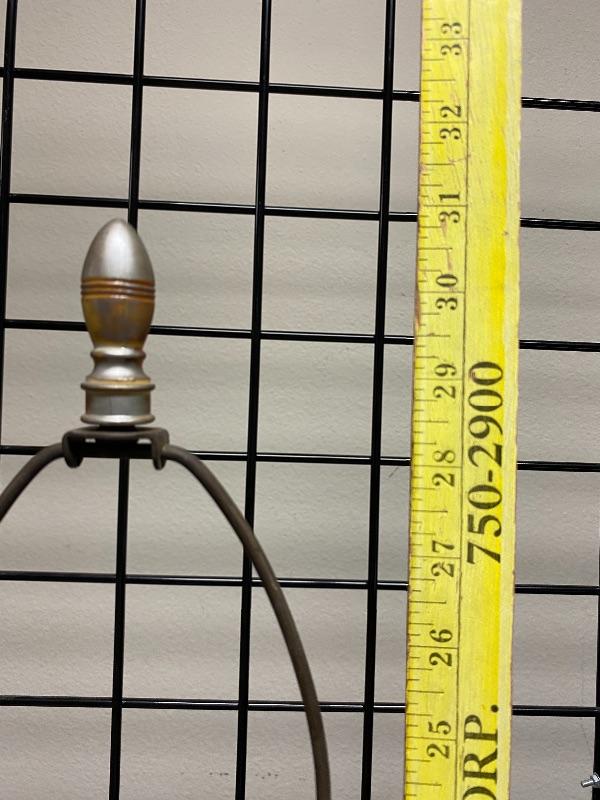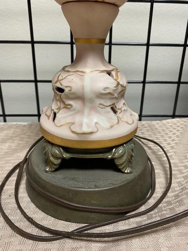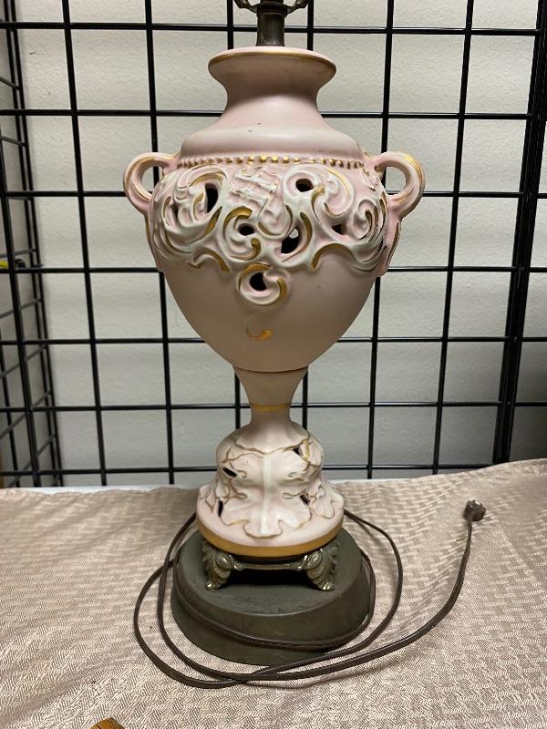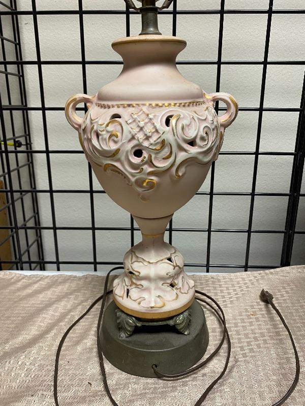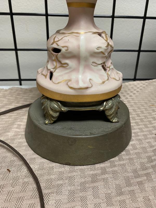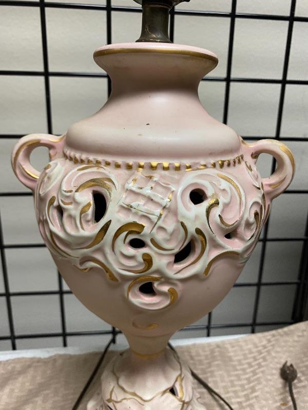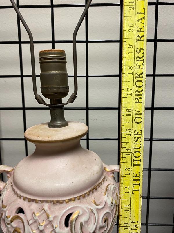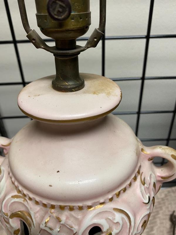Pastel pink and gold table Lamp. Ceramic on a metal base. Needs to be cleaned a little. Untested. About 19" at top of light socket.