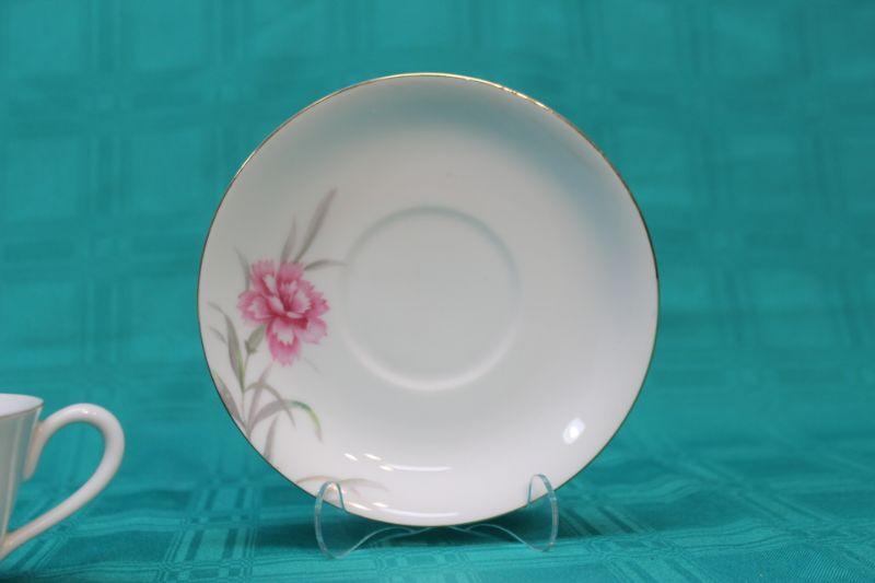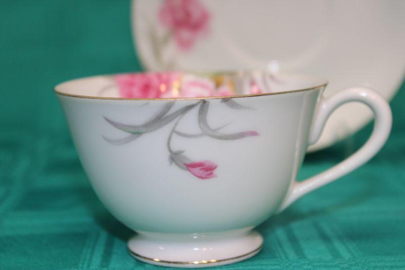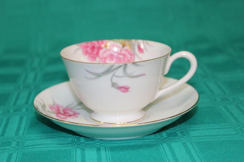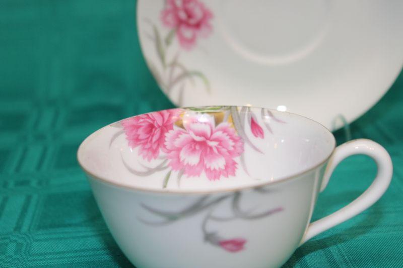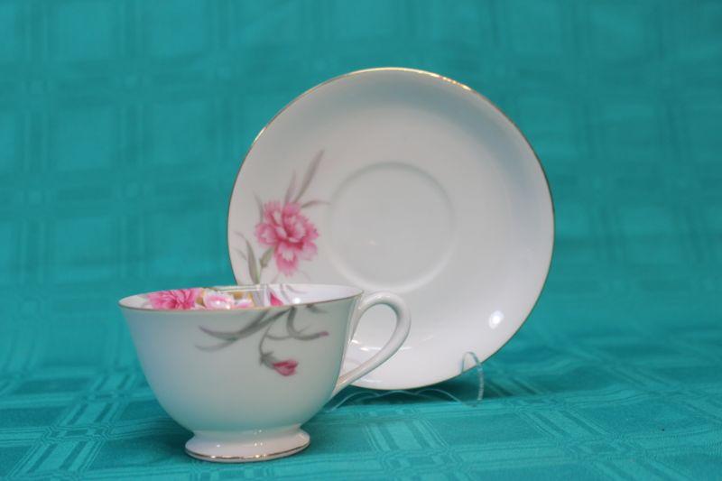 Pink carnation with grey leaves pattern tea cup & saucer. Gold rim. Made in Japan. No chips.