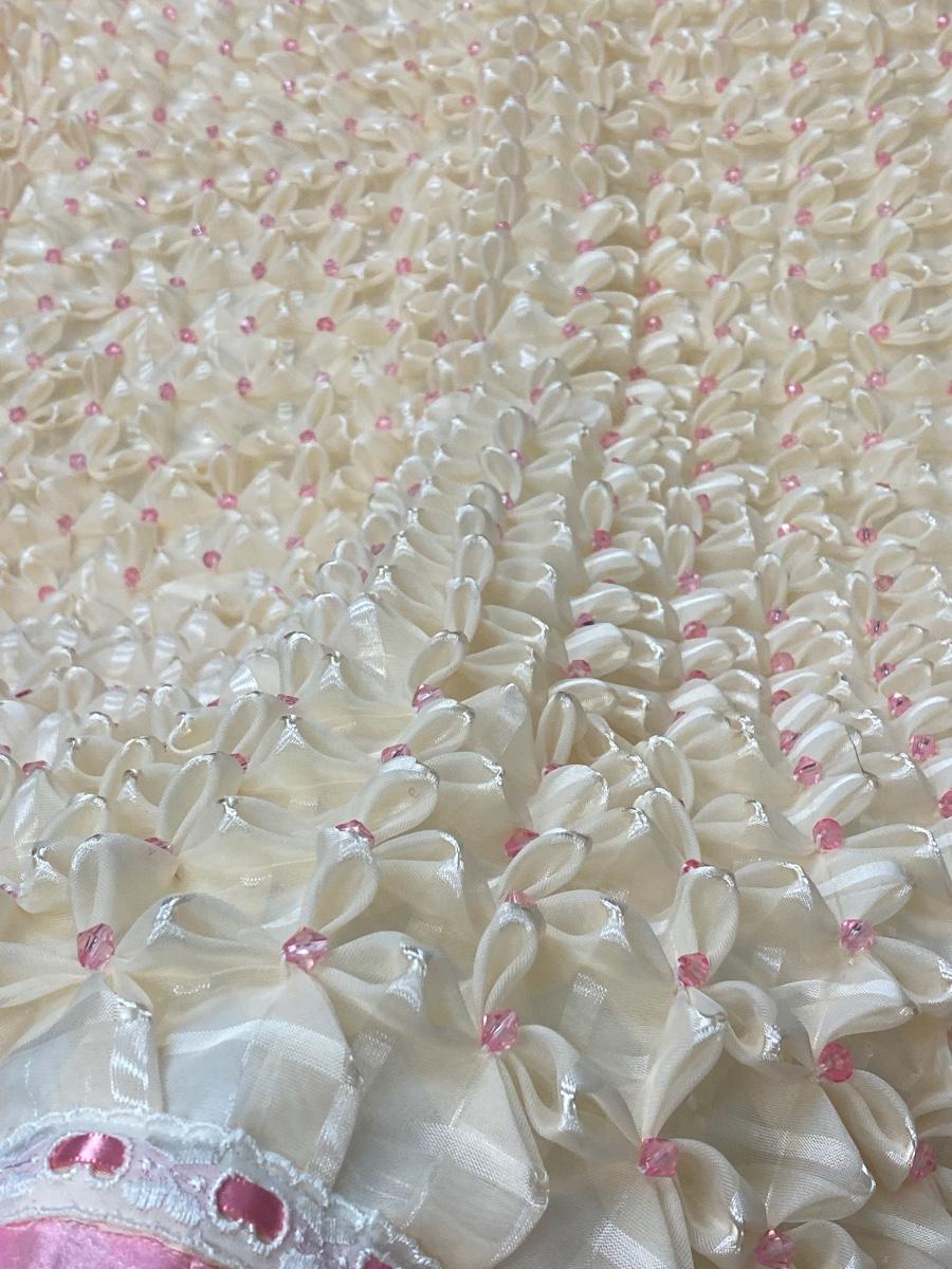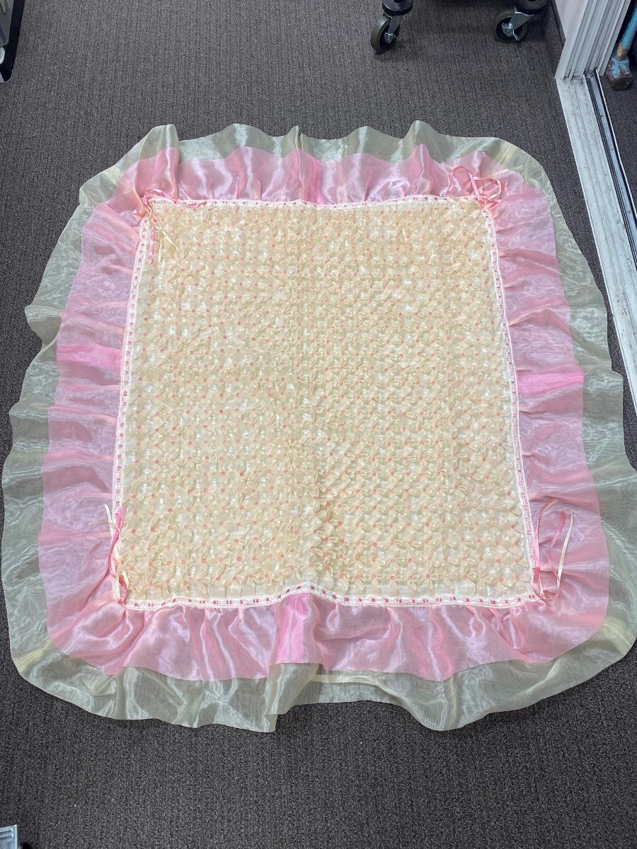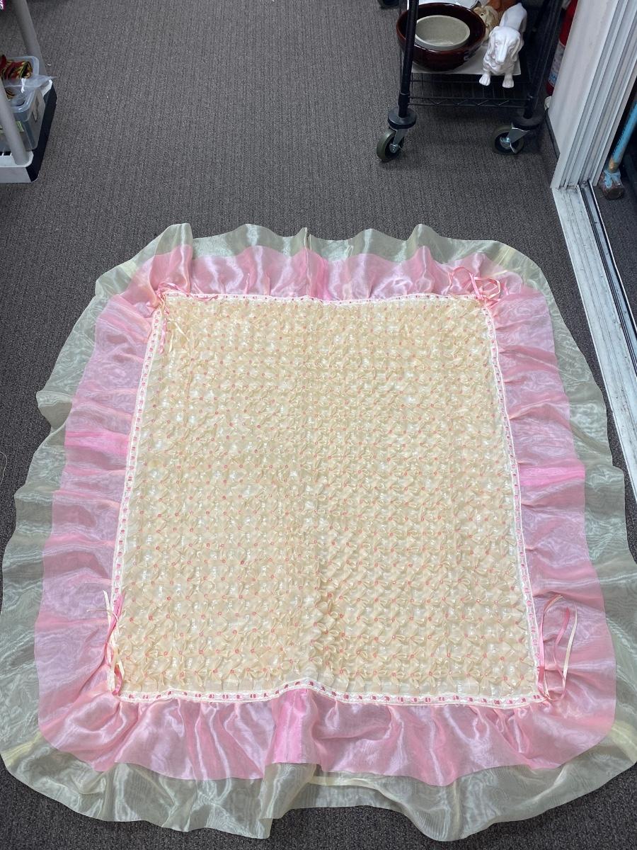 Pink and ivory ruffled throw blanket. Unsure of its use other than decor. The center area pleats have rhinestone centers so it would be uncomfortable to sit on. It is thin material as well. Great for photo prop. About 4'x5' size.