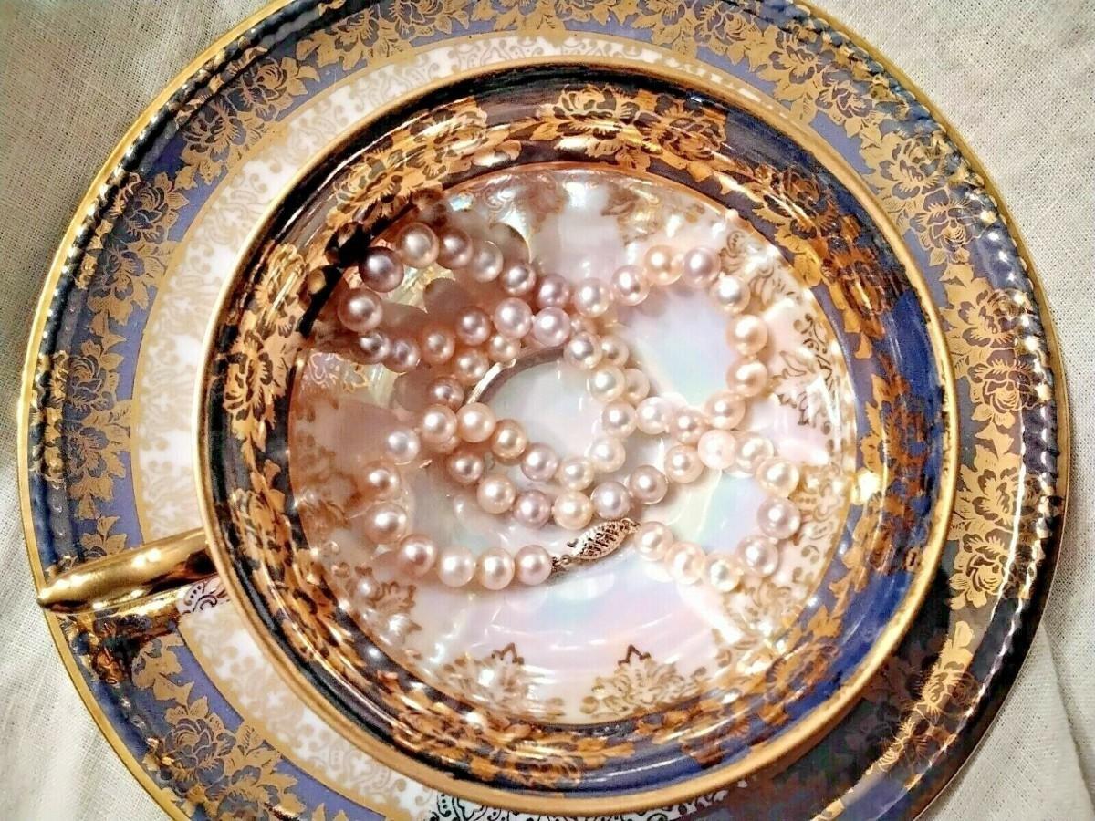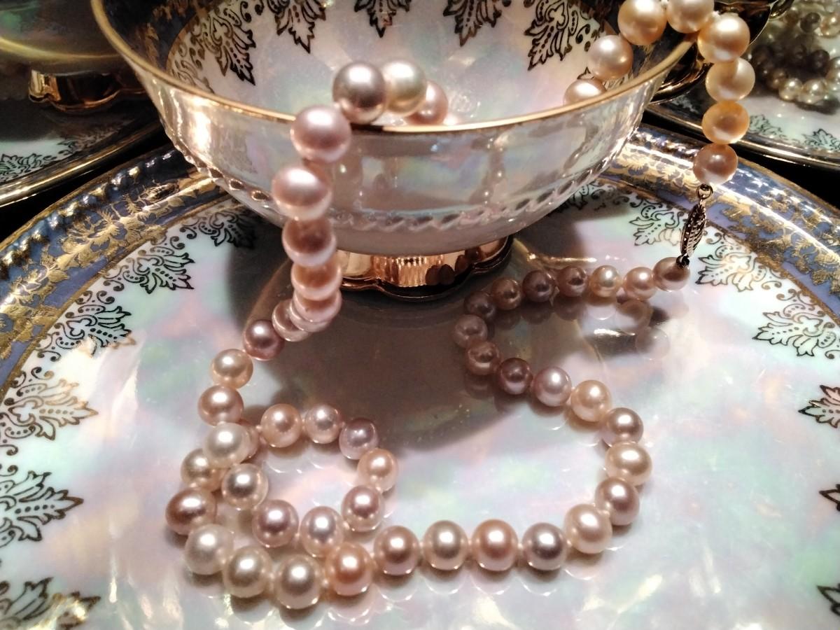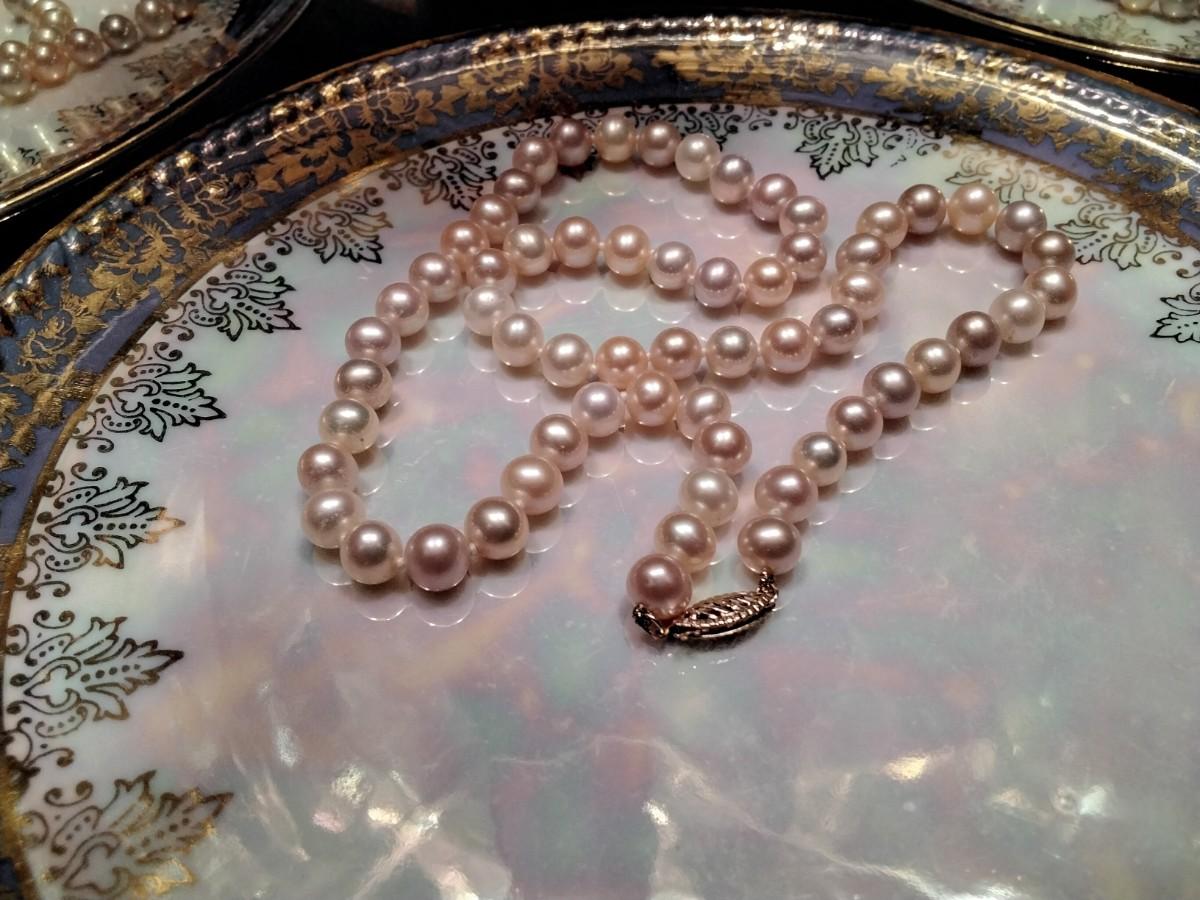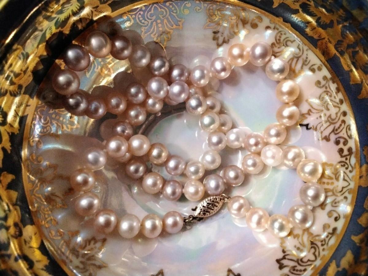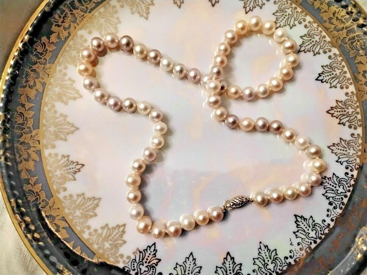 Pink and Lavender Pastel South Sea Natural 18" 7mm Pearl Necklace. 14k gold clasp (marked 585 which is a tad over 14k in German) This necklace is just exquisitely beautiful. It's so perfect for any spring day or evening. The colors just make you feel so happy looking at the beauty of their high luster shine. I see them as the perfect Easter set. That's just me though *wink*