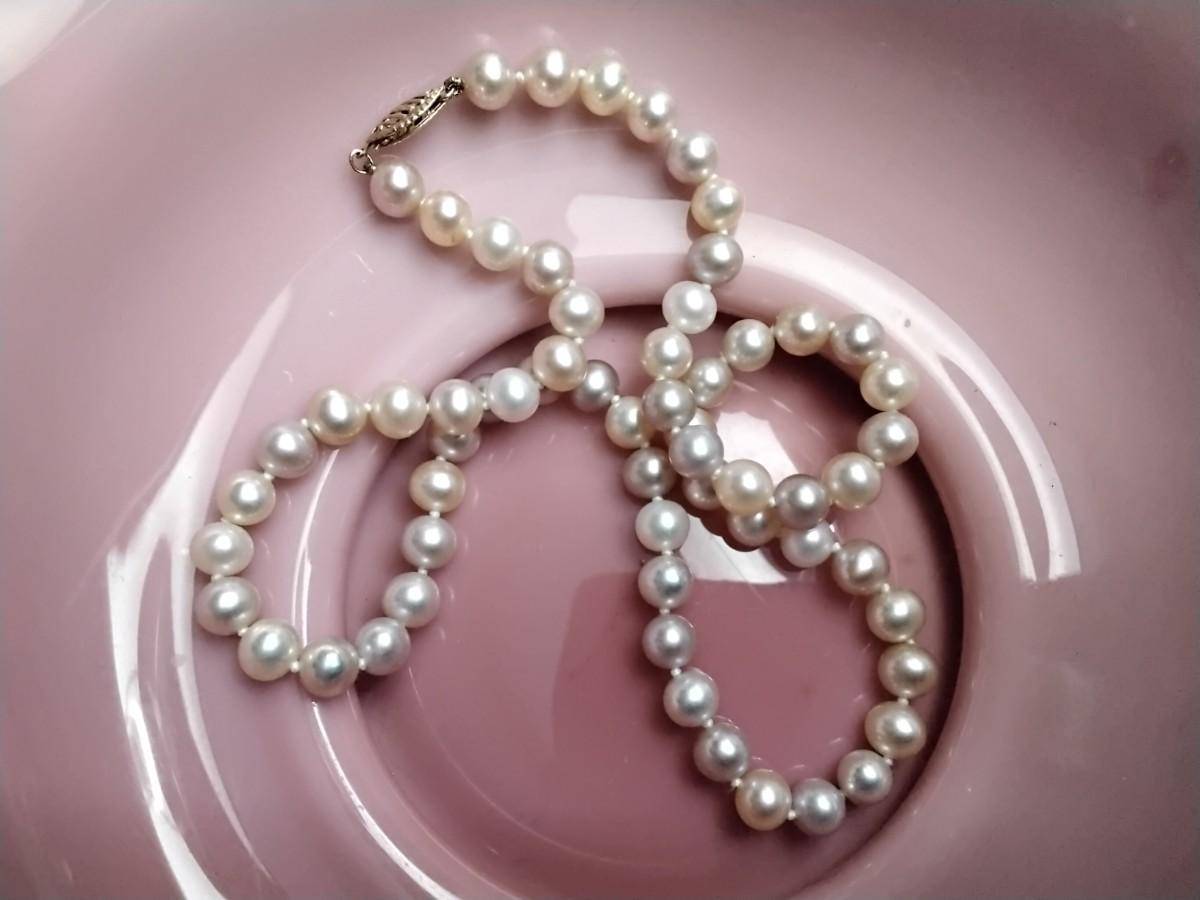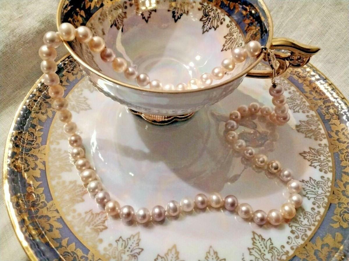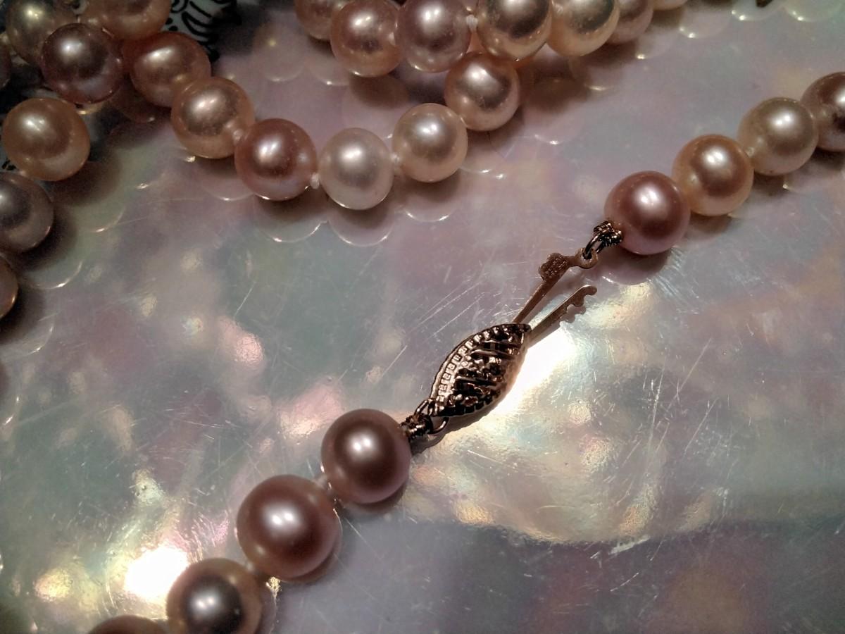 Pink and Lavender Pastel South Sea Natural 18" 7mm Pearl Necklace. 14k gold clasp (marked 585 which is a tad over 14k in German) This necklace is just exquisitely beautiful. It's so perfect for any spring day or evening. The colors just make you feel so happy looking at the beauty of their high luster shine. I see them as the perfect Easter set. That's just me though *wink*